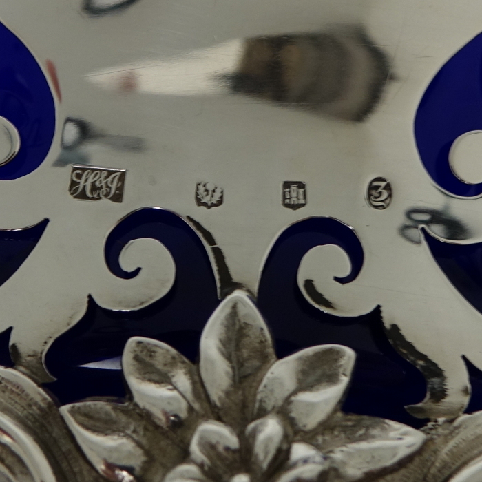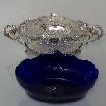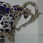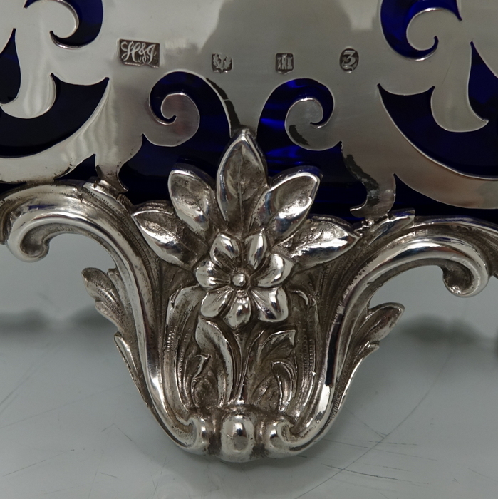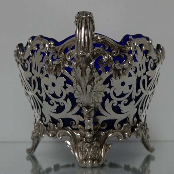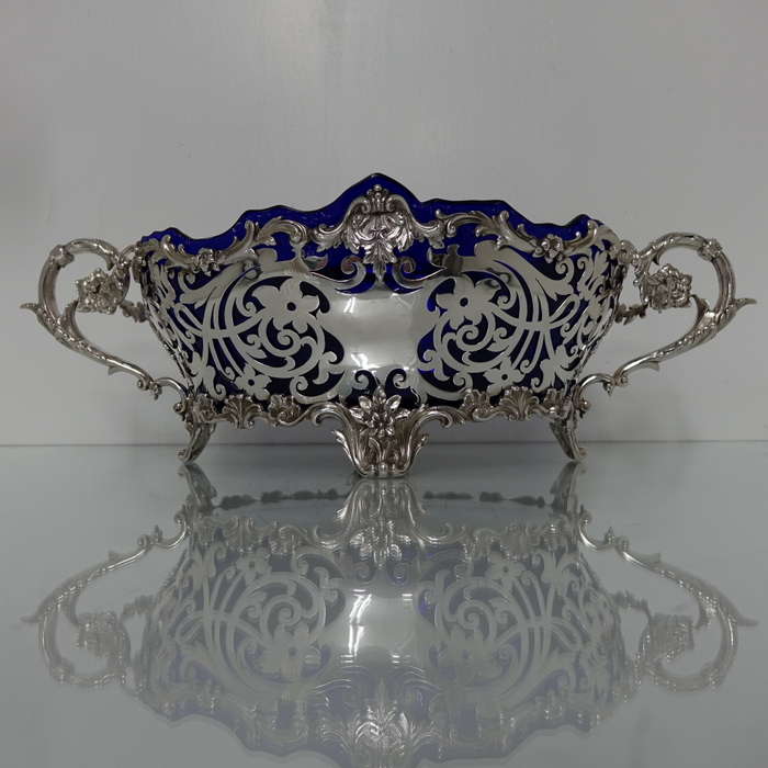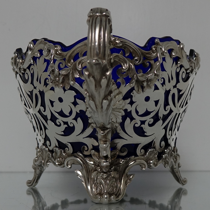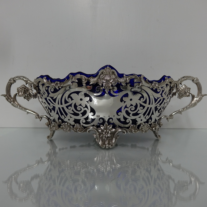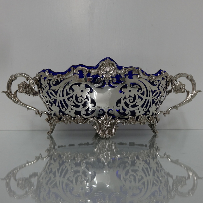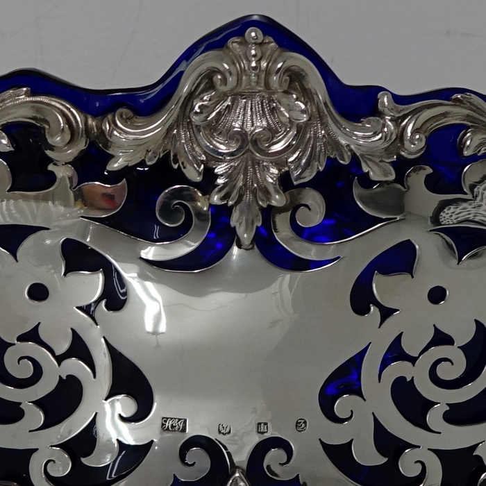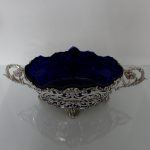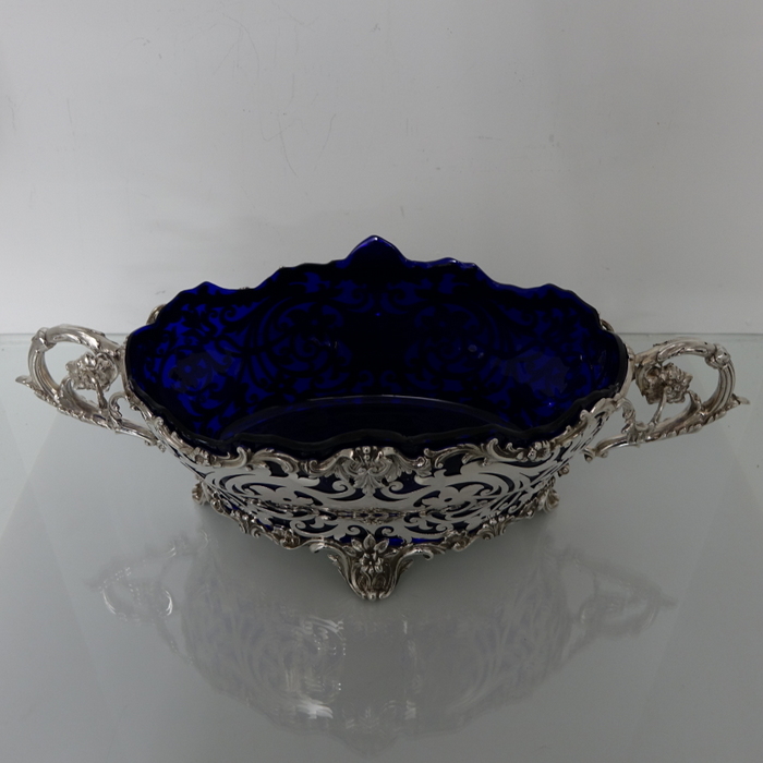 A very elegant and extremely large Scottish oval hand pierced dish. Â The central body is stunning pierced with a elegant foliage design with ornate scroll handles applied either side. Â The dish itself sits on four decorative floral themed feet. Â There is a removable blue glass liner which when inserted to the dish forms a strikingly beautiful contrast between the silver and blue glass background.