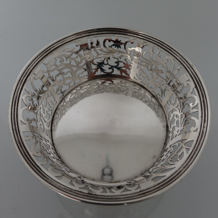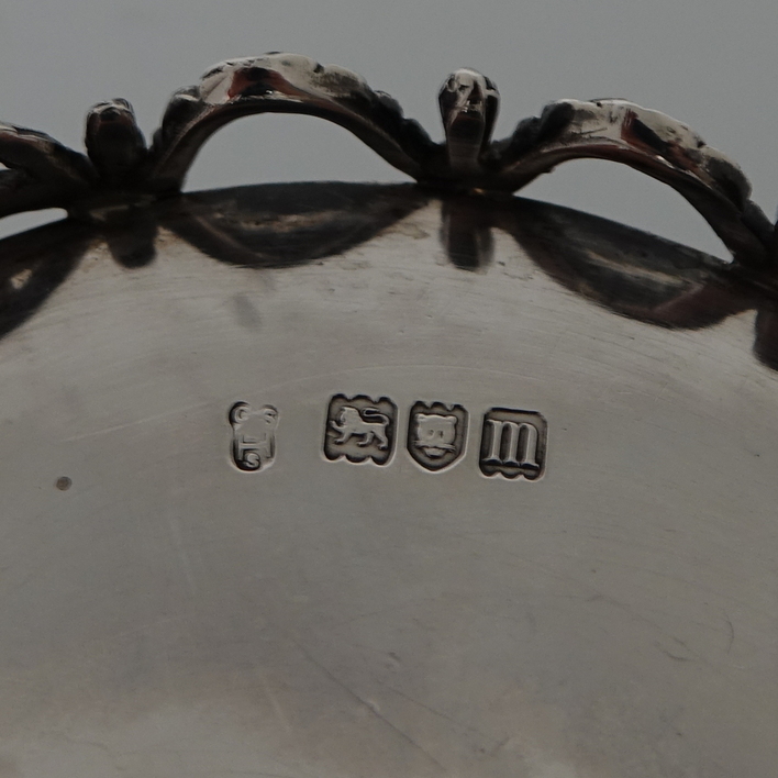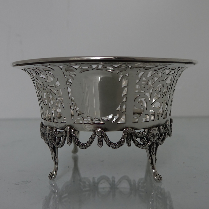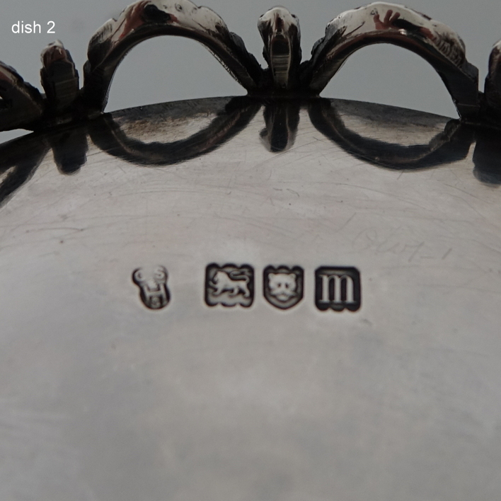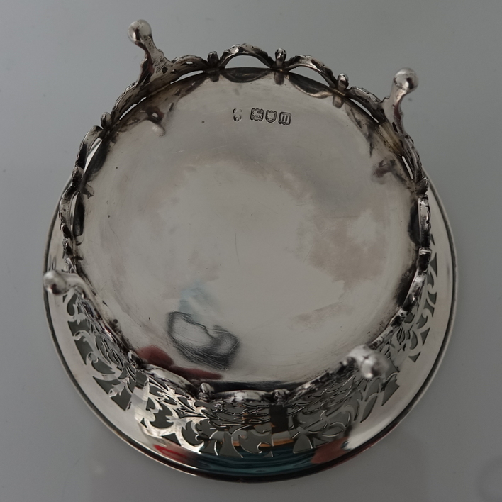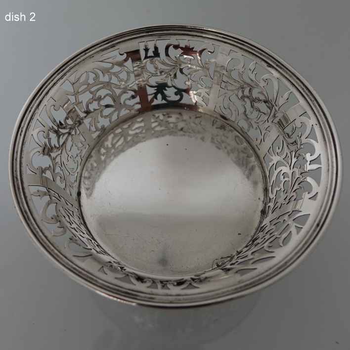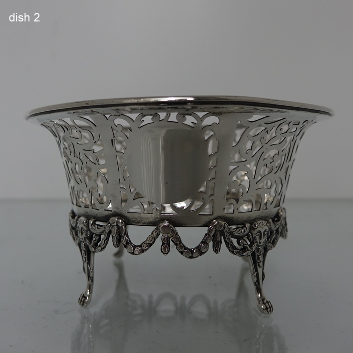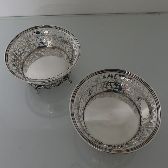 Very pretty pair of Edwardian dishes having a plain center base with an ornate pierced circular gallery incorporating a circular cartouche. The dishes stand on four decorative feet with a lower garland border for additional highlights.