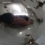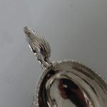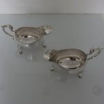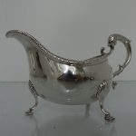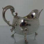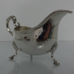 A very large and elegant pair of sauce or gravy boats with a gadrooned rim for decoration. The body of the sauce boats are plain and sit on three ornate hoof feet. The handle is in single scroll design and has an easy to pour thumb piece.