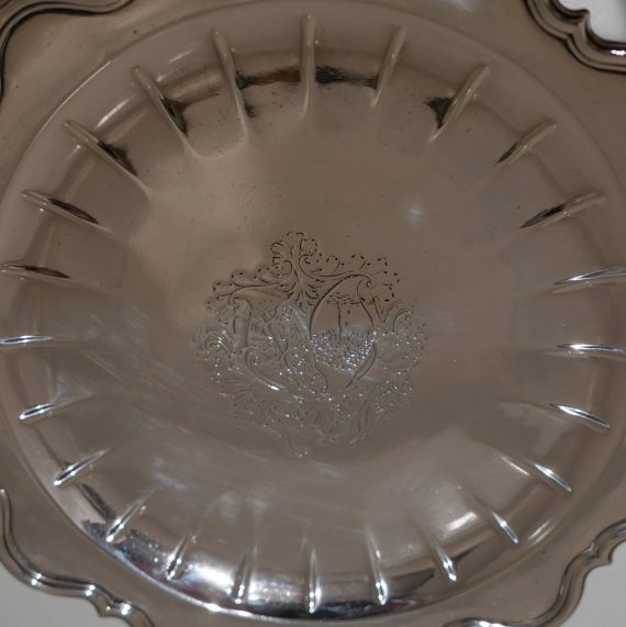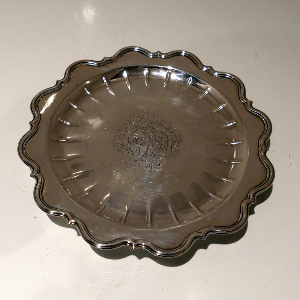 A fine and extremely rare George I silver shaped circular salver decorated with an outer applied wire border for highlights and inner ‘ribbing’ which stylishly ‘frames’ the beautiful contemporary armorial. Â The salver sits on a low spreading foot.