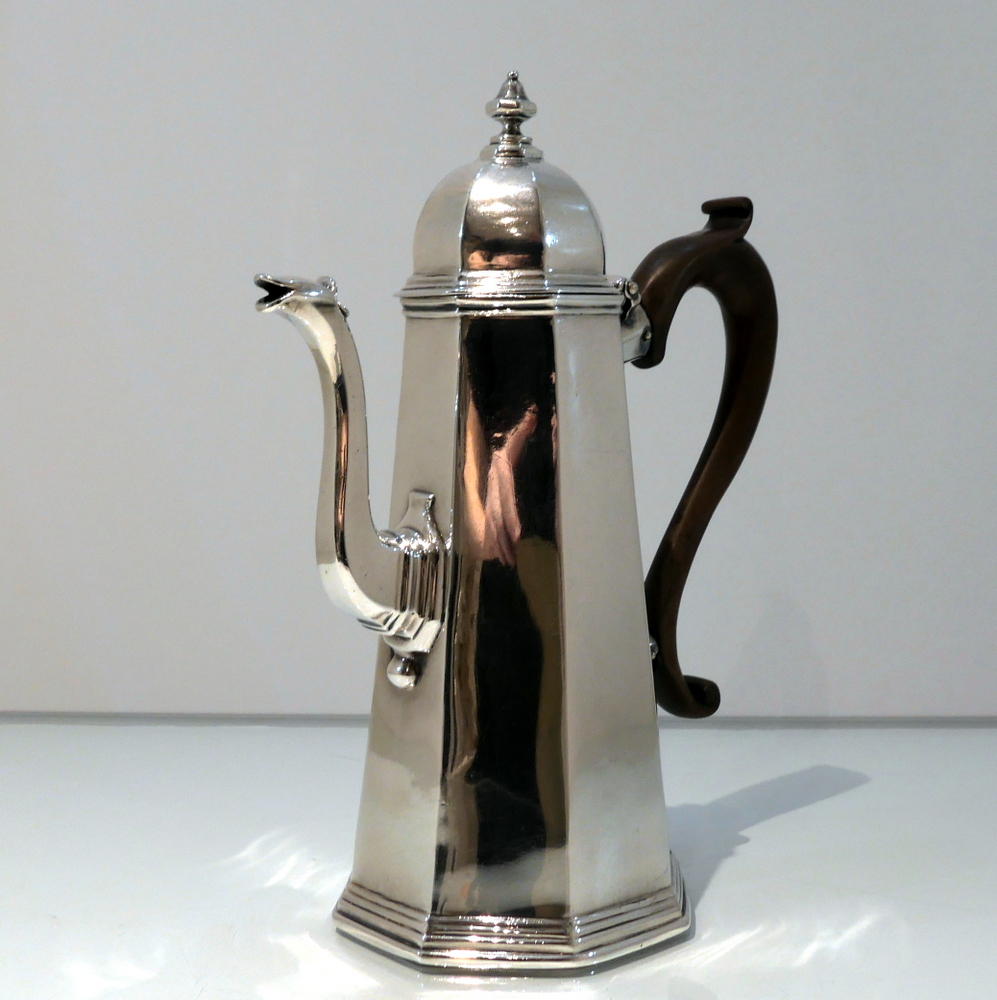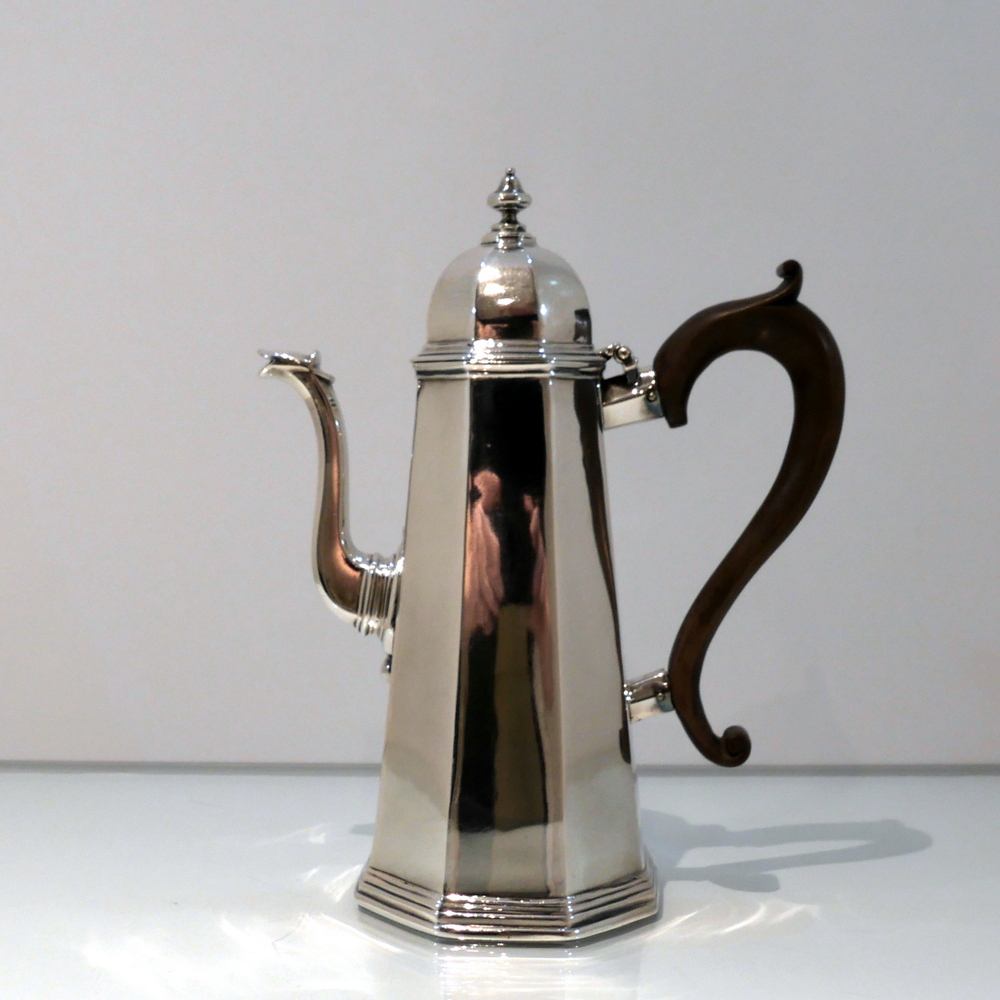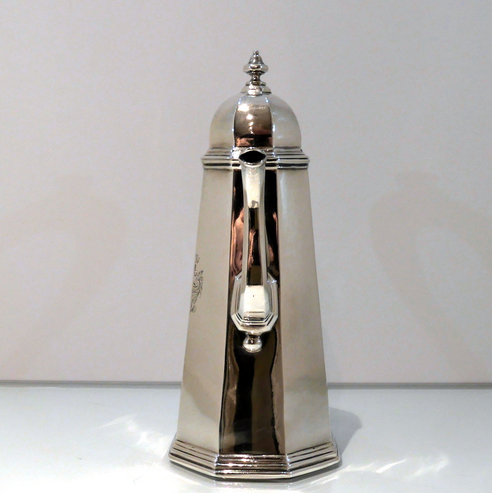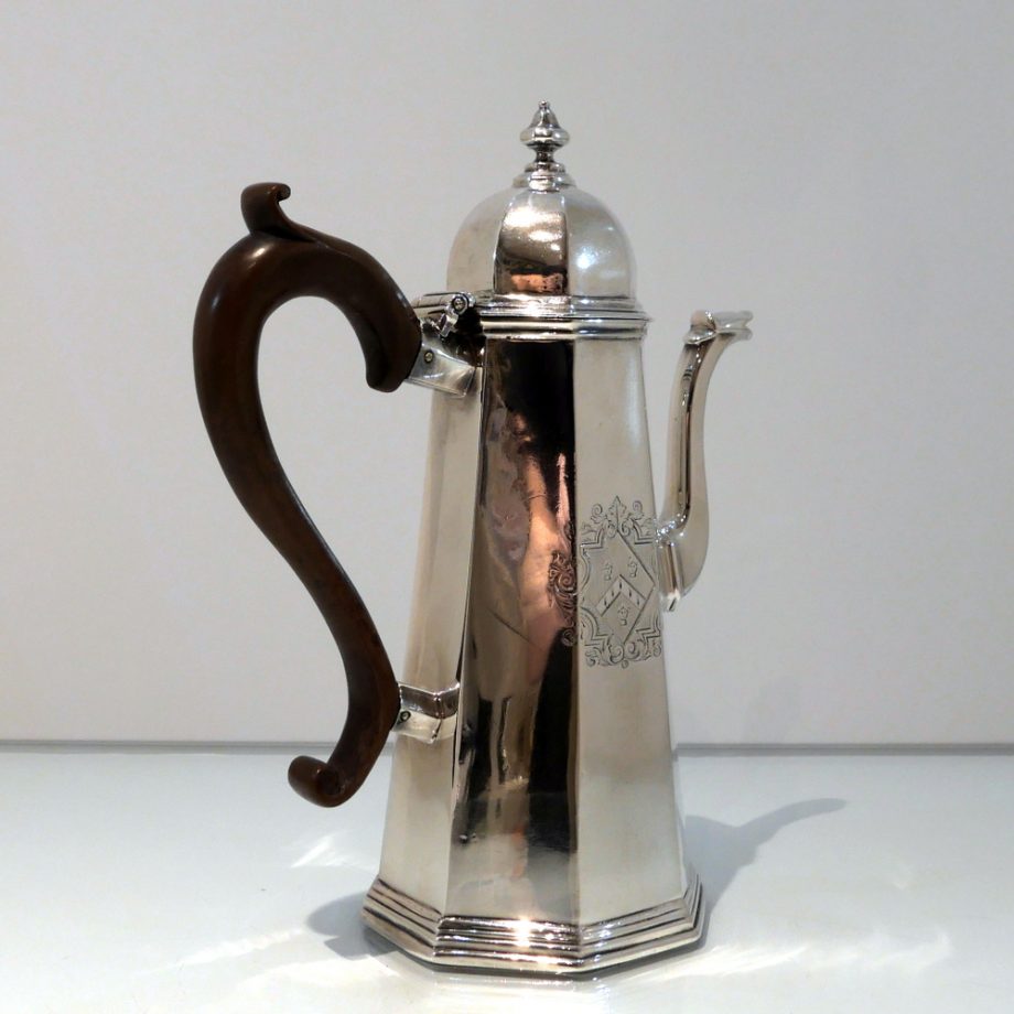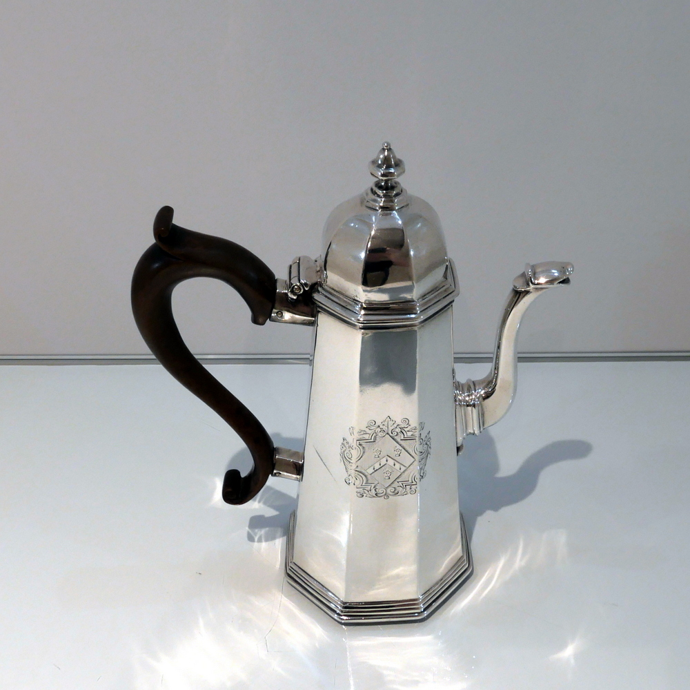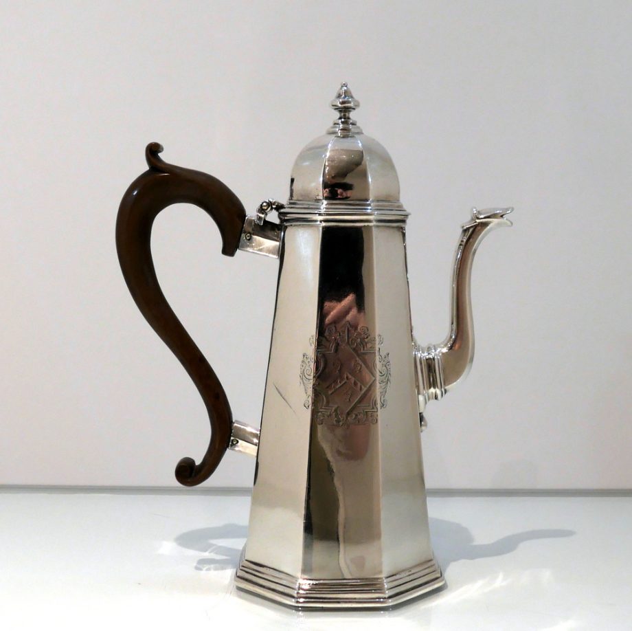 A fine quality and incredibly collectable early Georgian Britannia standard coffee pot designed with tapering angles and an elegant hinged domed lid. Â The centre front of the body has a beautiful contemporary hand engraved armorial for importance.