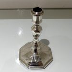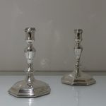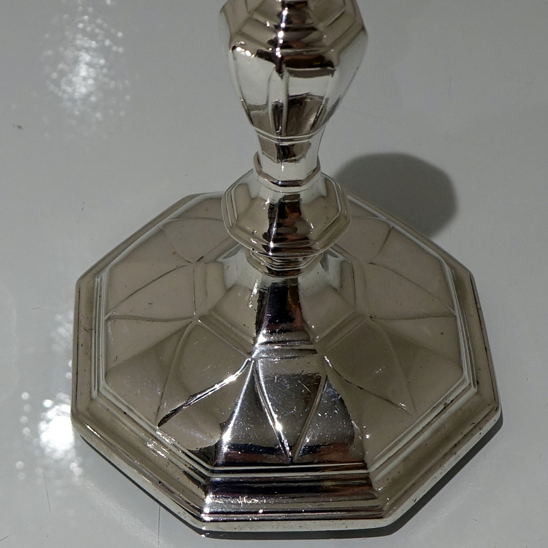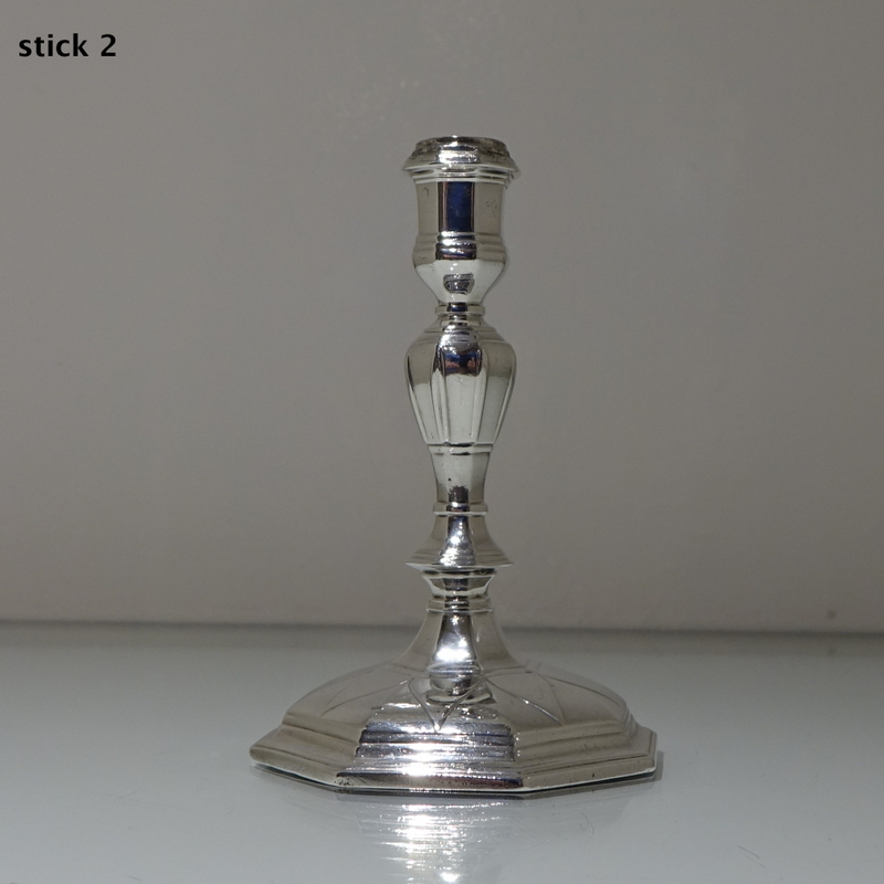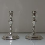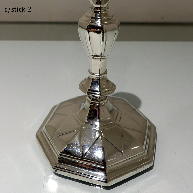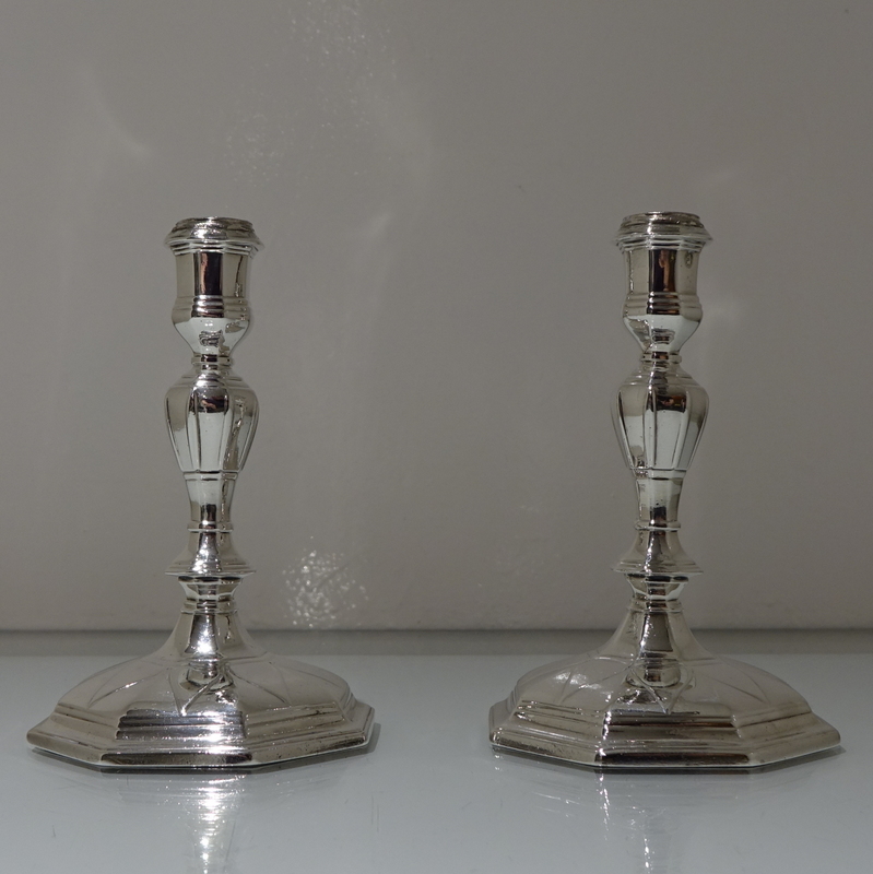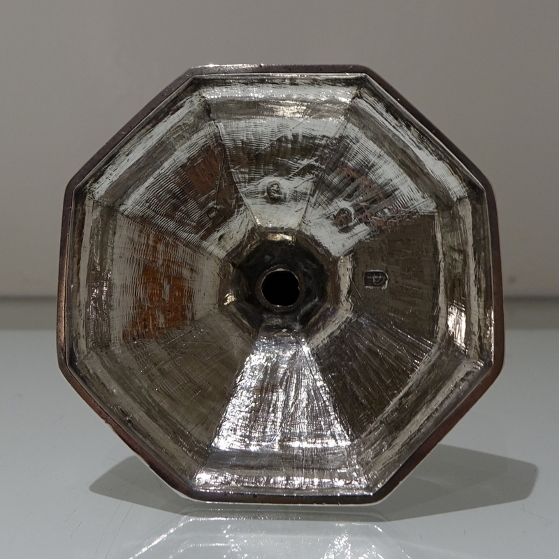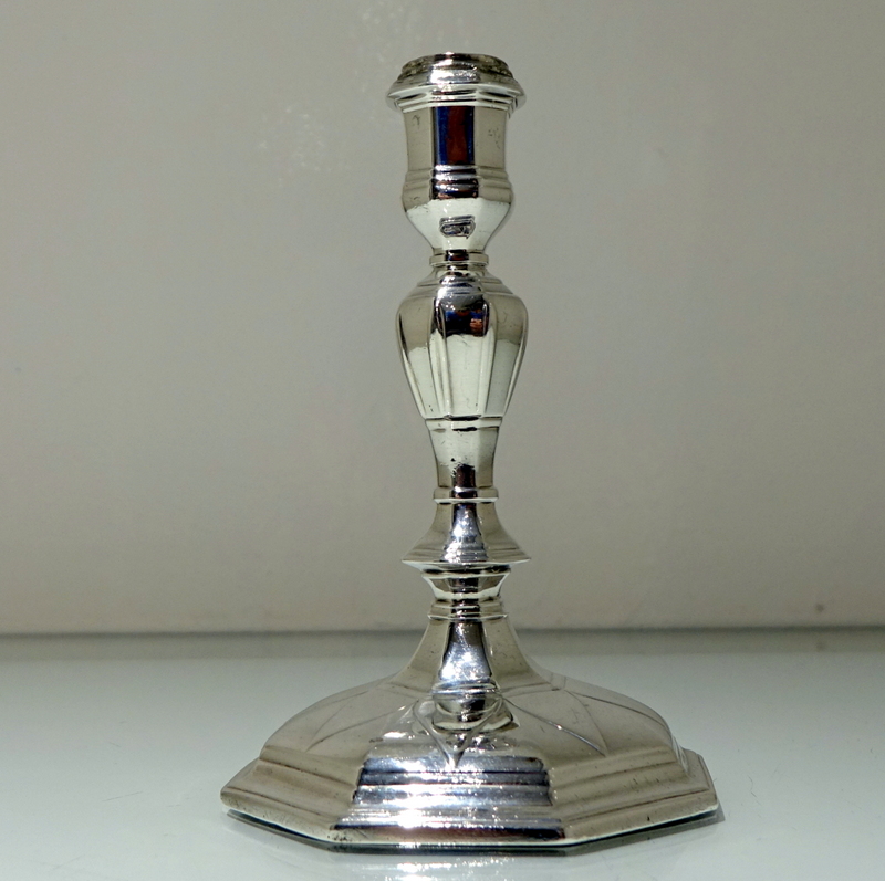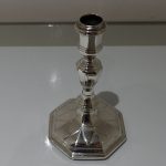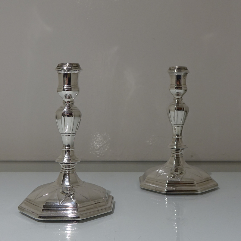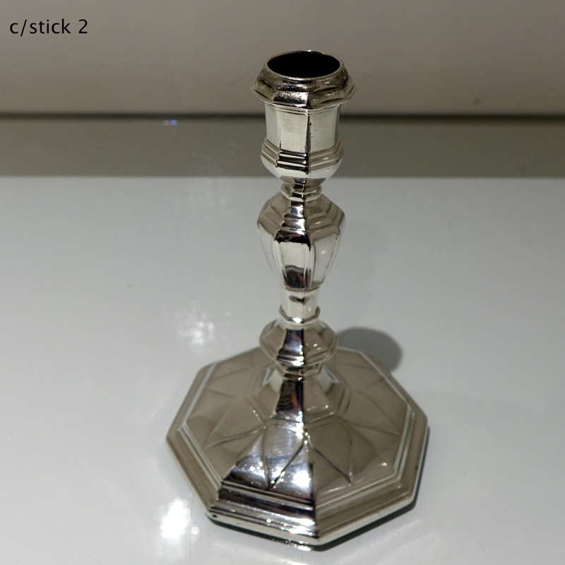 An incredibly rare pair of early 18th century cast octagonal candlesticks.  The bases have a stunning design of “drooping leaf” workmanship for low lights and the octagonal tapering stems have elegant  “ribbing” around the central columns.