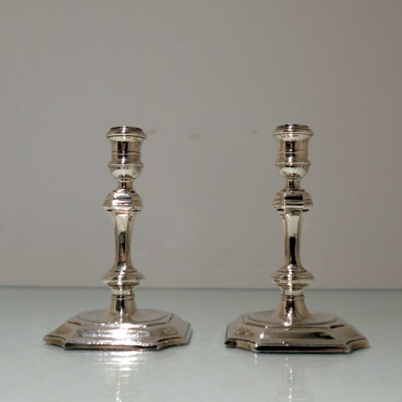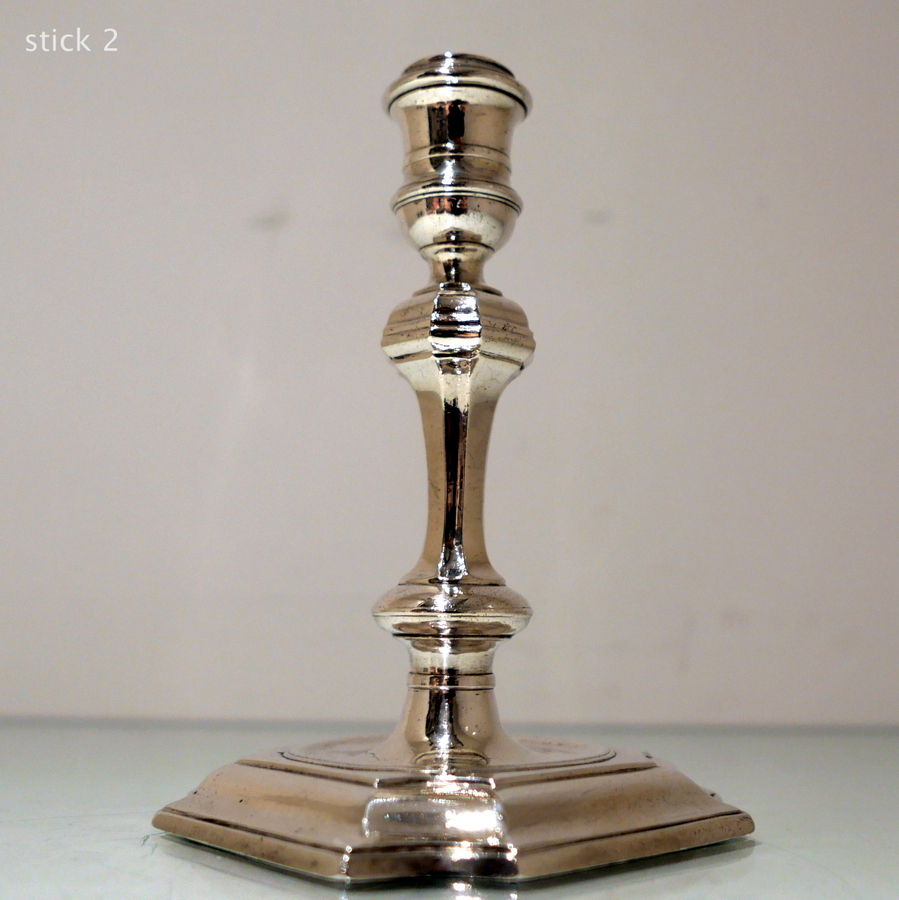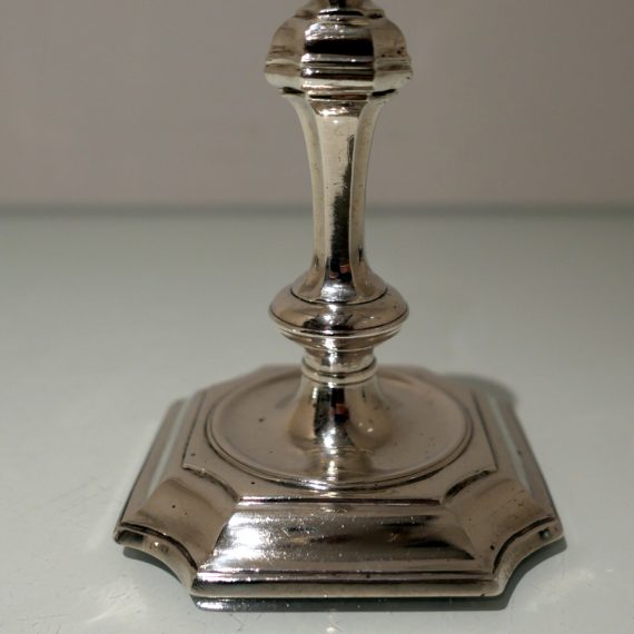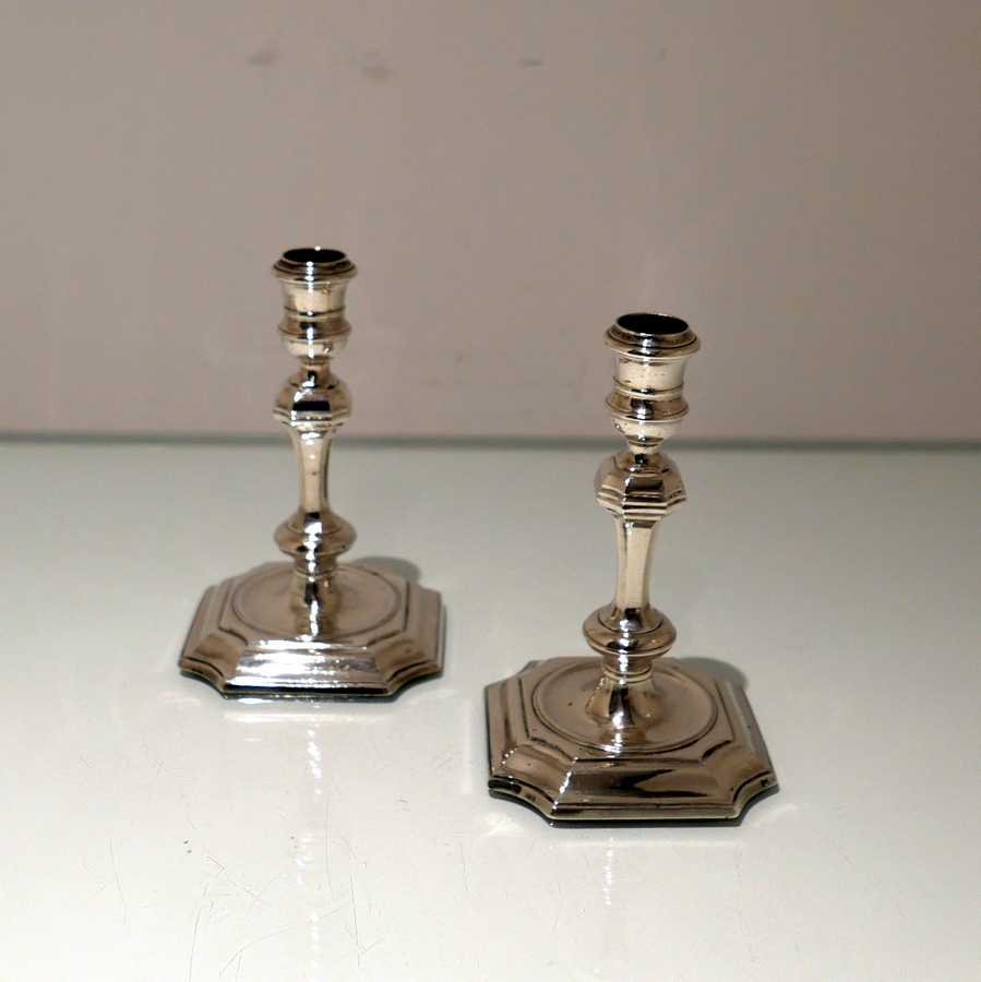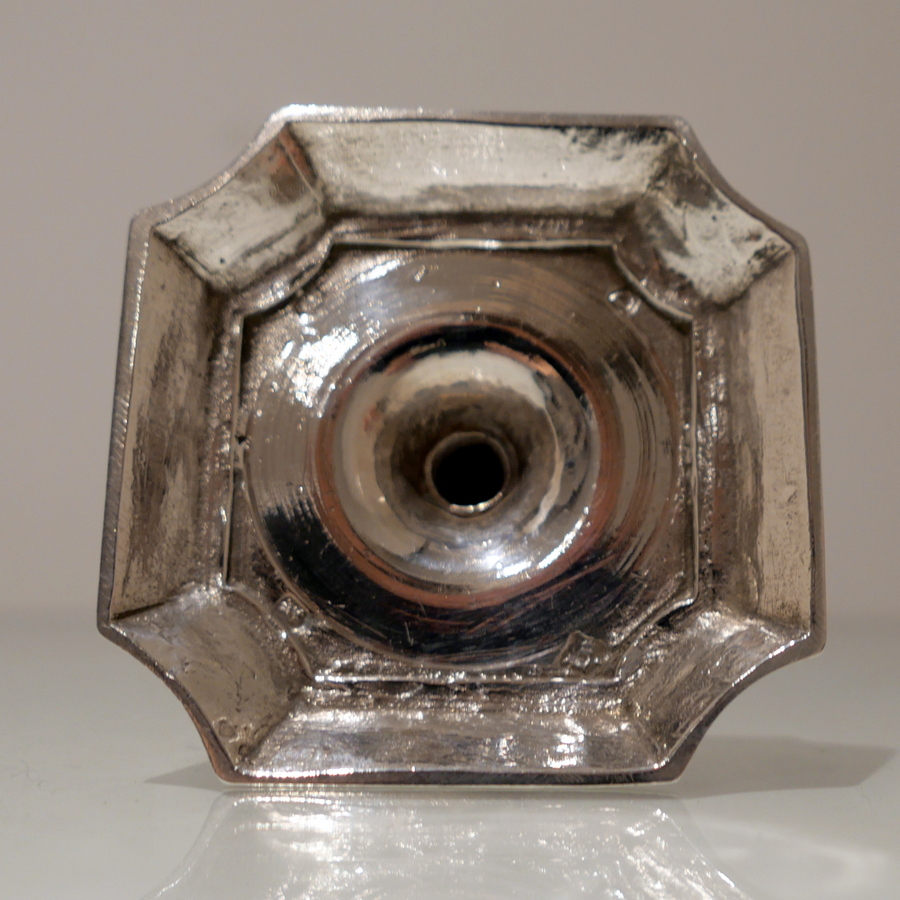A fine pair of cast early 18th century square based cut cornered candlesticks designed with elegant tapering stems and stylish sunken in wells.