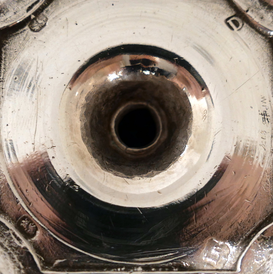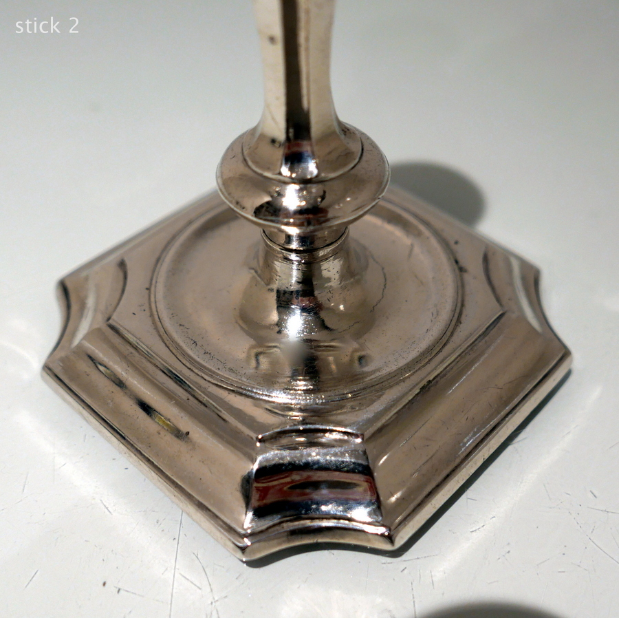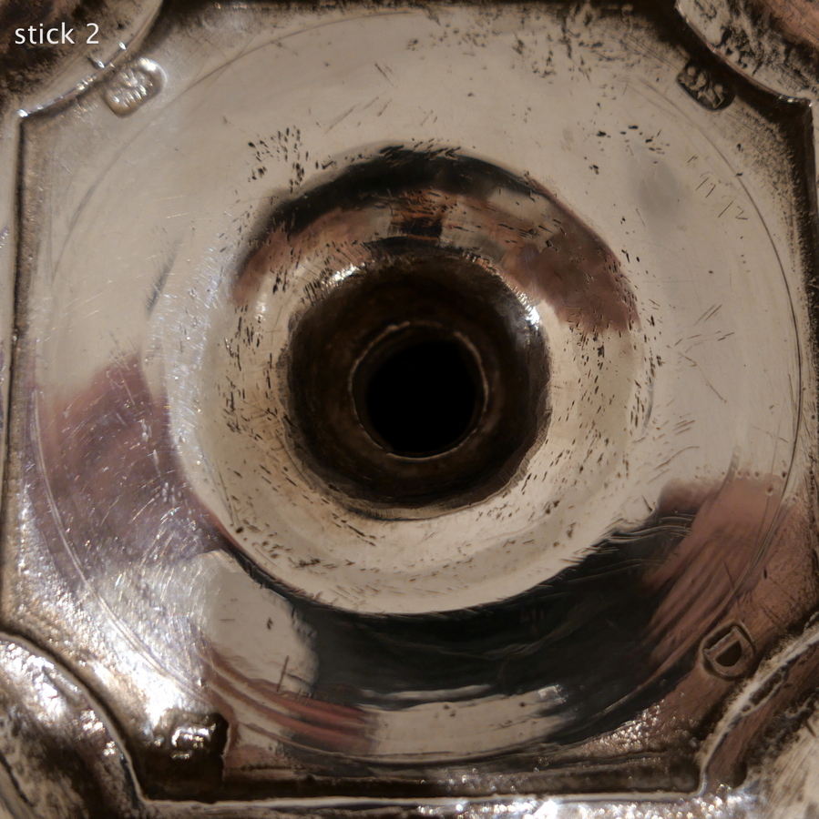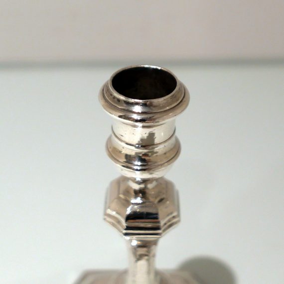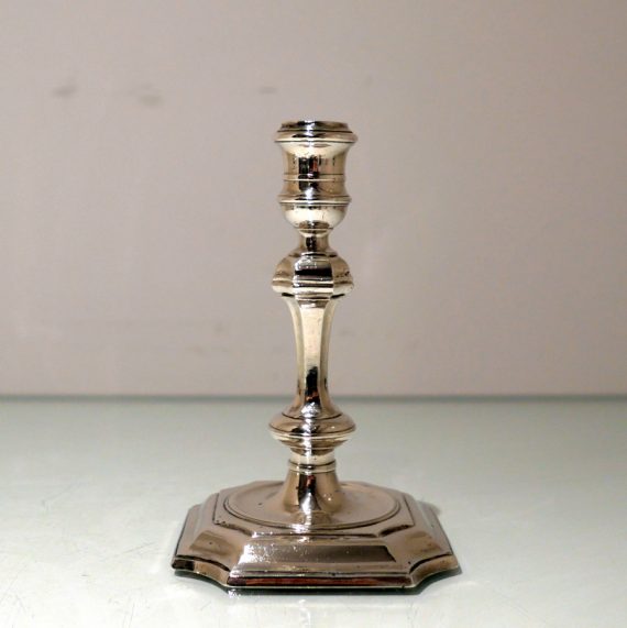 A fine pair of cast early 18th century square based cut cornered candlesticks designed with elegant tapering stems and stylish sunken in wells.