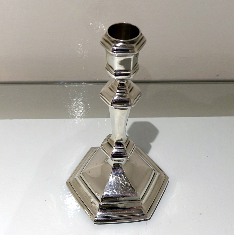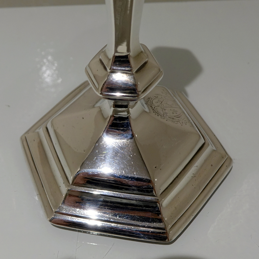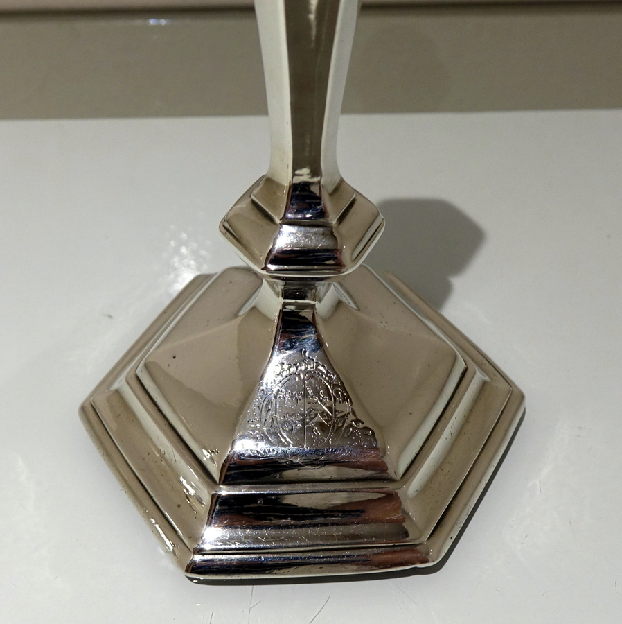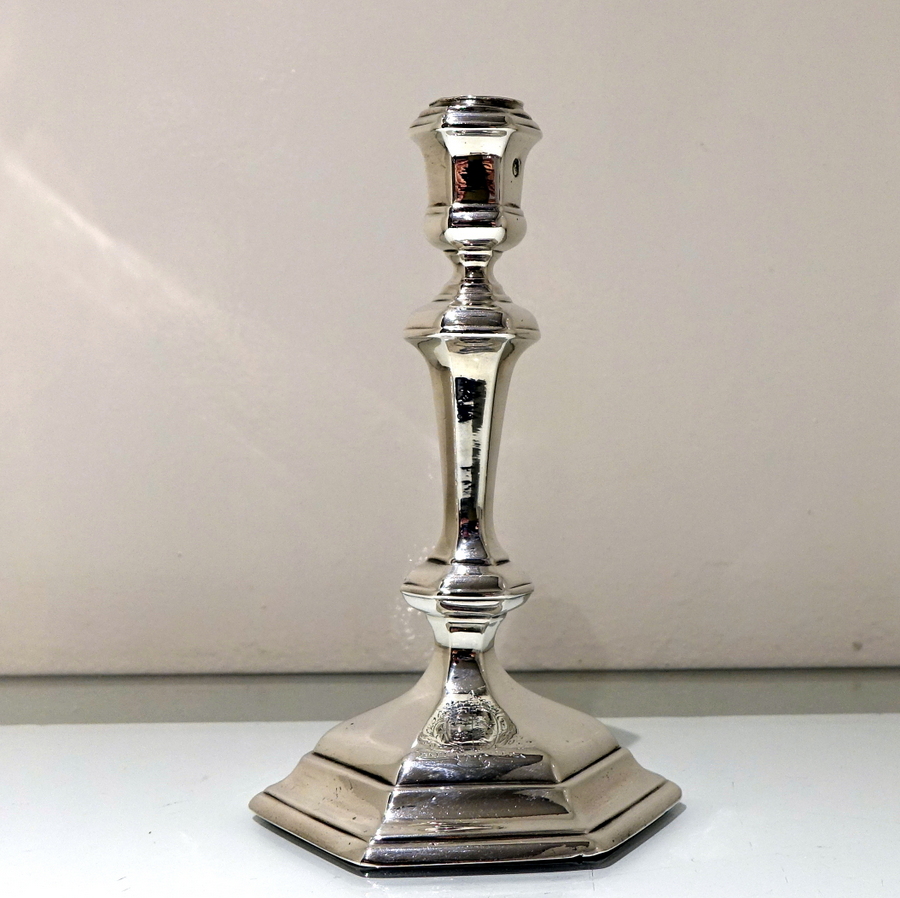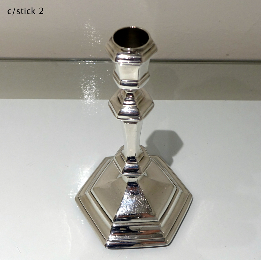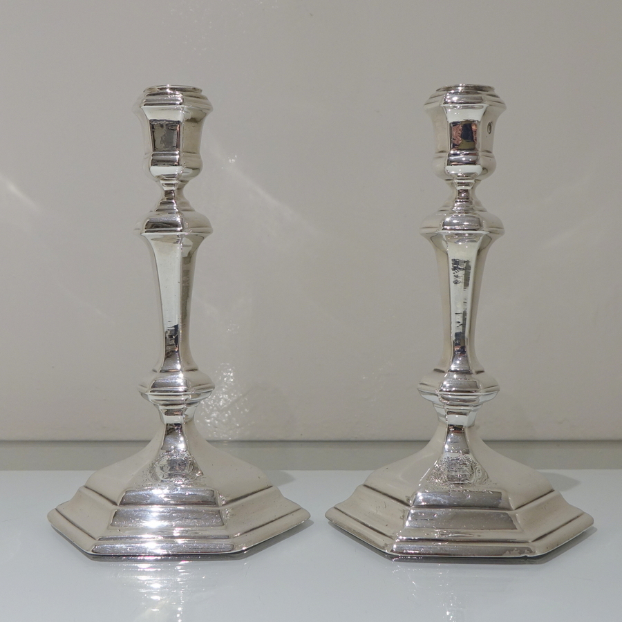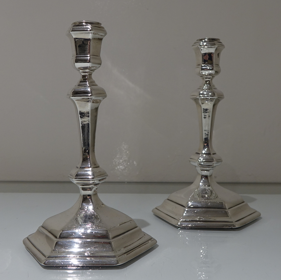 An extremely rare and highly unusual pair of tall cast hexagonal 18th century silver candlesticks with tapering stems which have been raised on a hexagonal pedestal base. Â Both candlesticks have stylish contemporary armorials for importance.