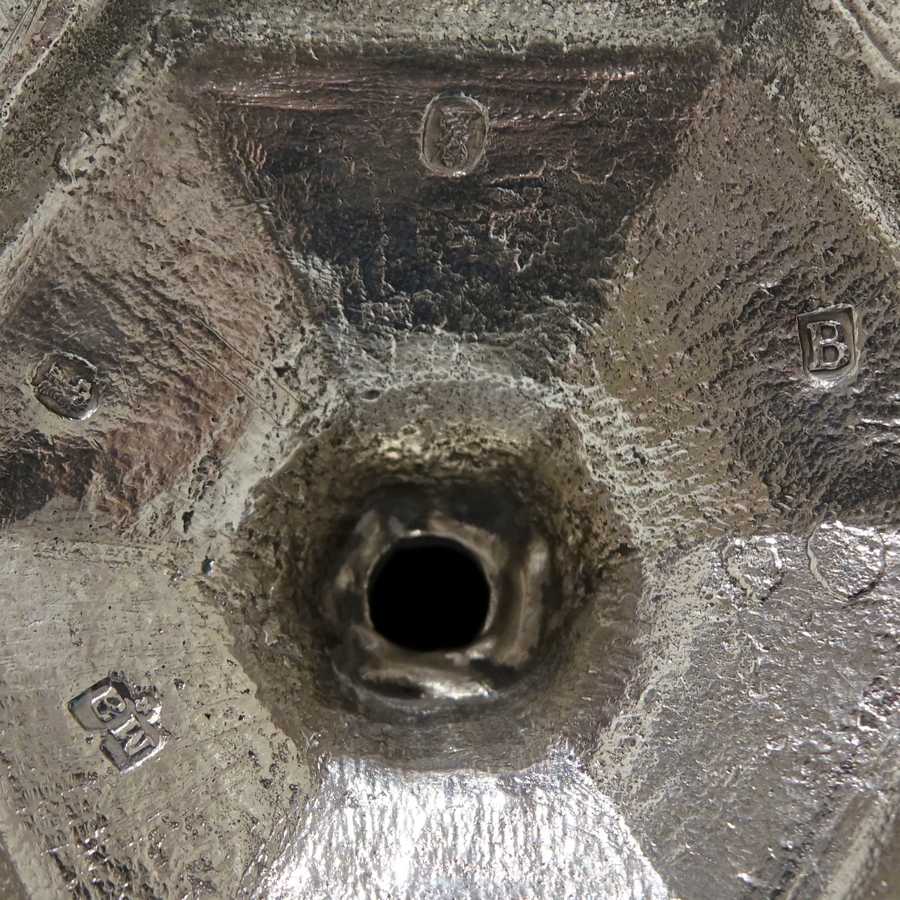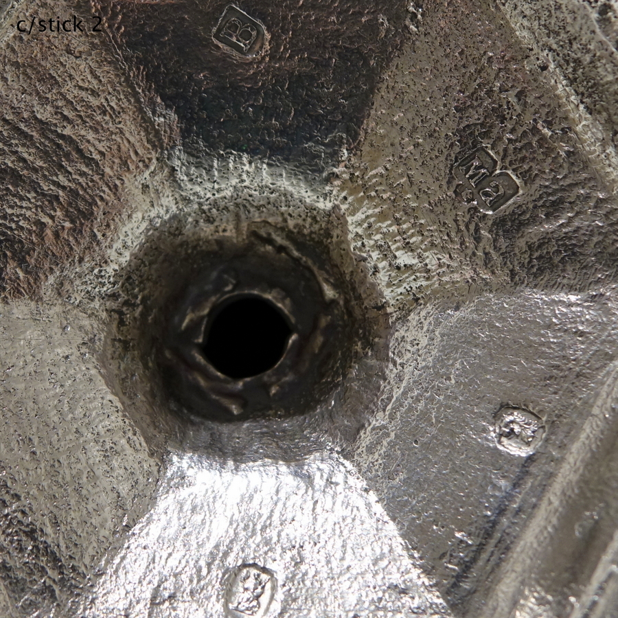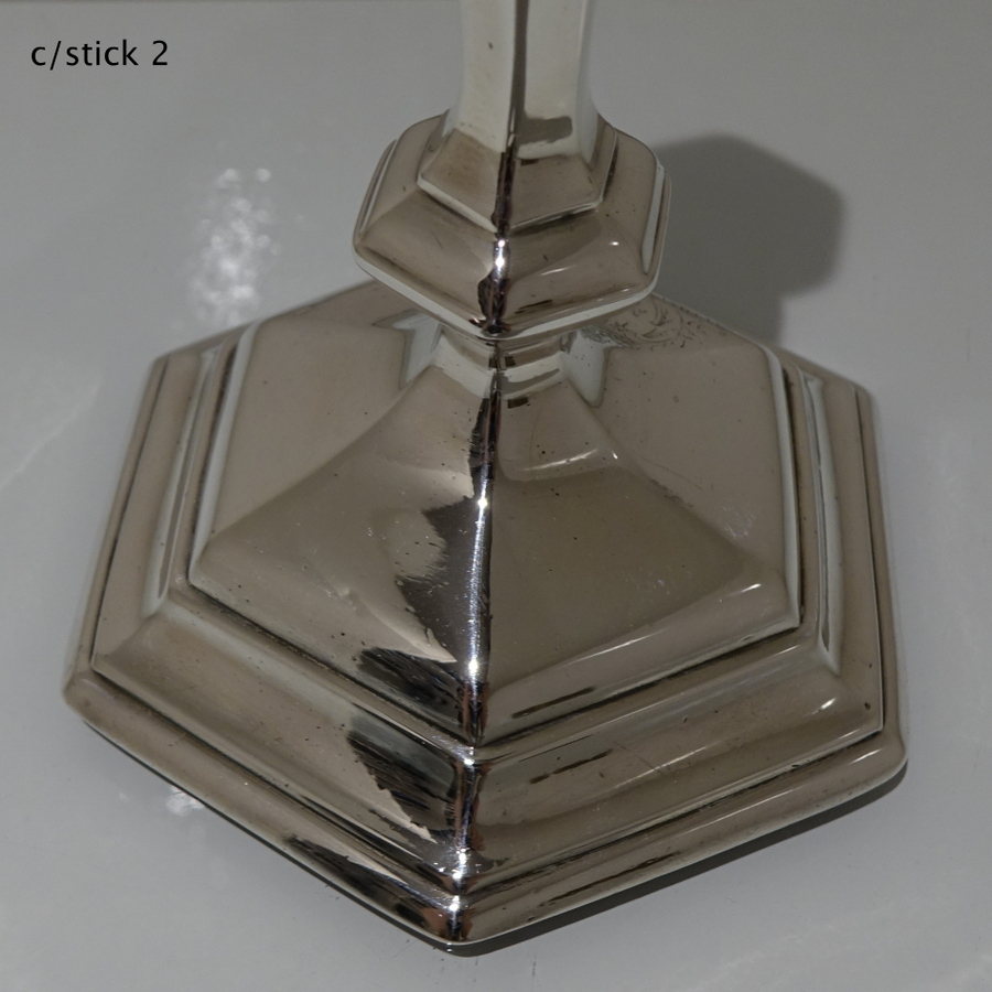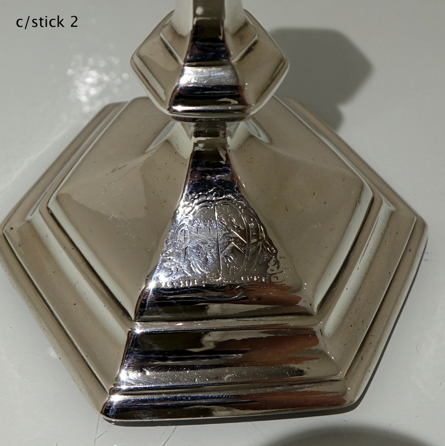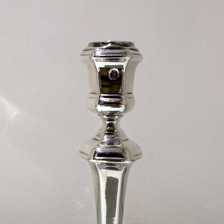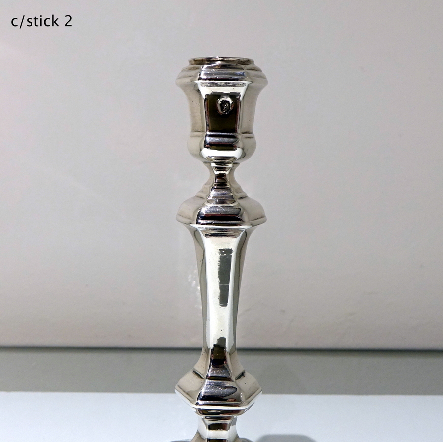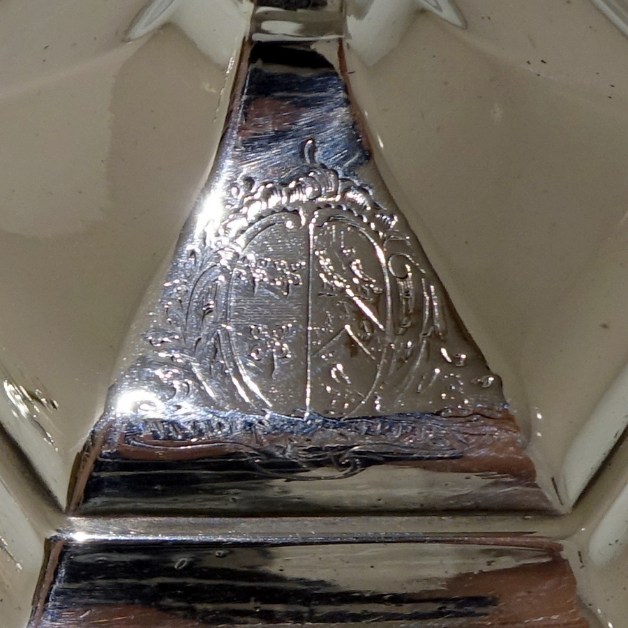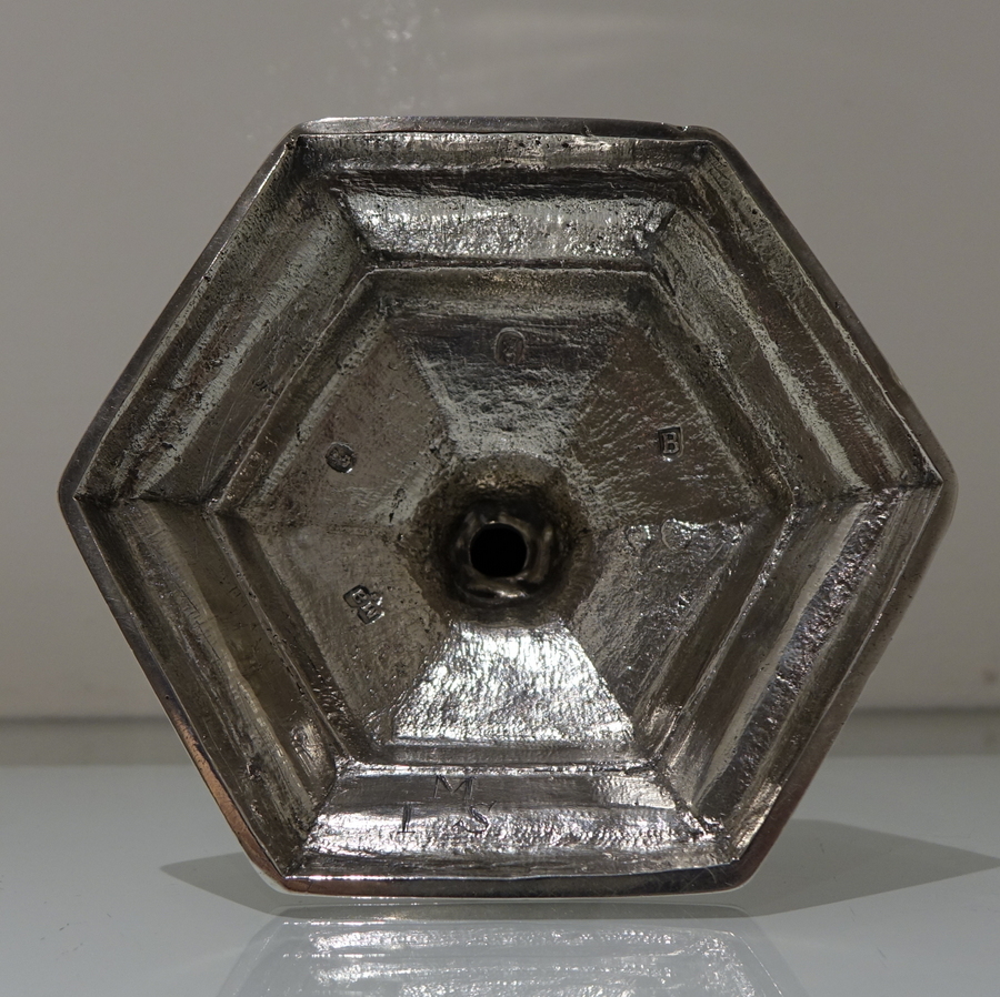 An extremely rare and highly unusual pair of tall cast hexagonal 18th century silver candlesticks with tapering stems which have been raised on a hexagonal pedestal base. Â Both candlesticks have stylish contemporary armorials for importance.
