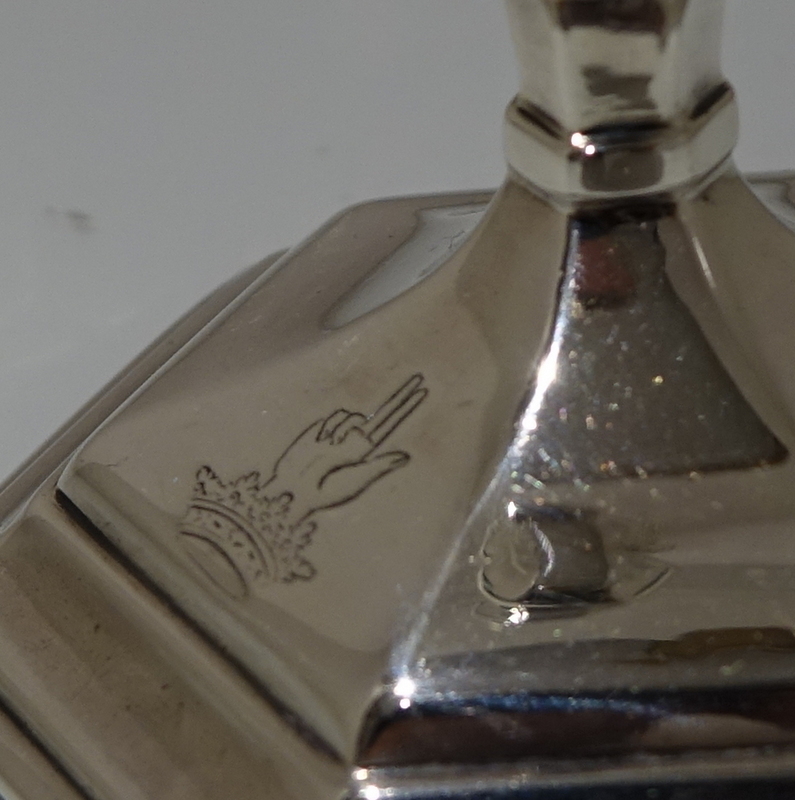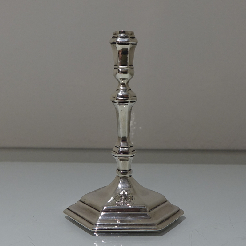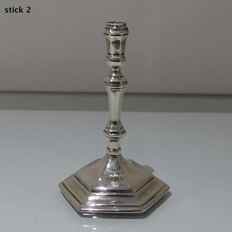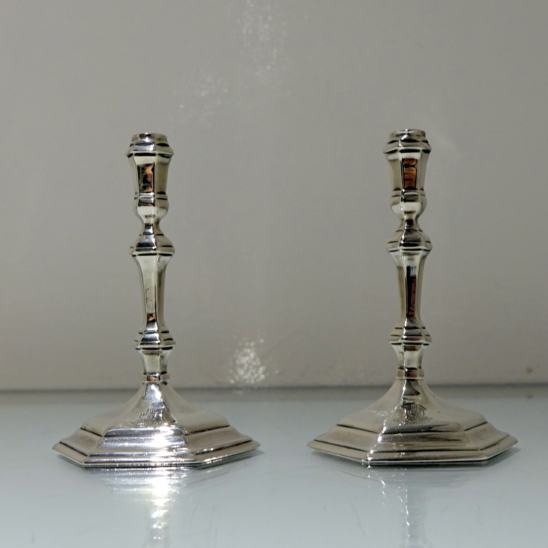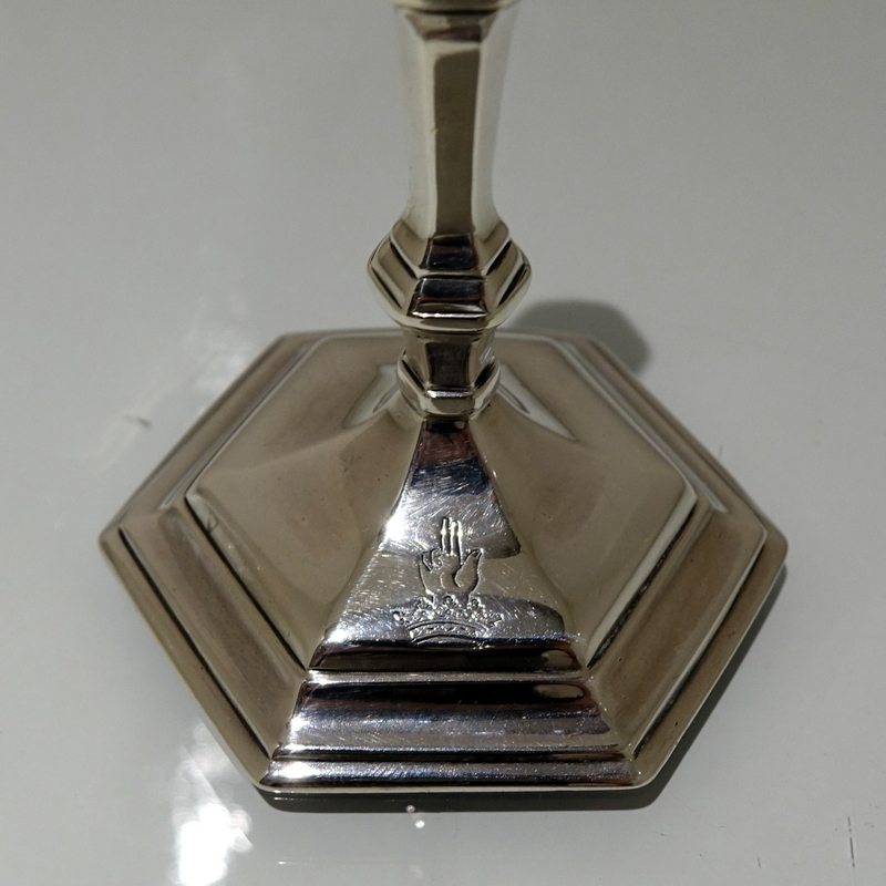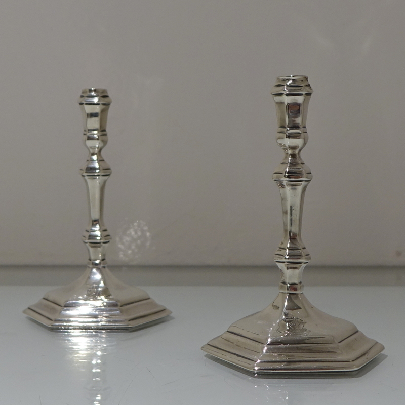 A stunning pair of plain formed early Georgian cast hexagonal silver taper-sticks. Â The pedestal bases both have elegant contemporary crests.