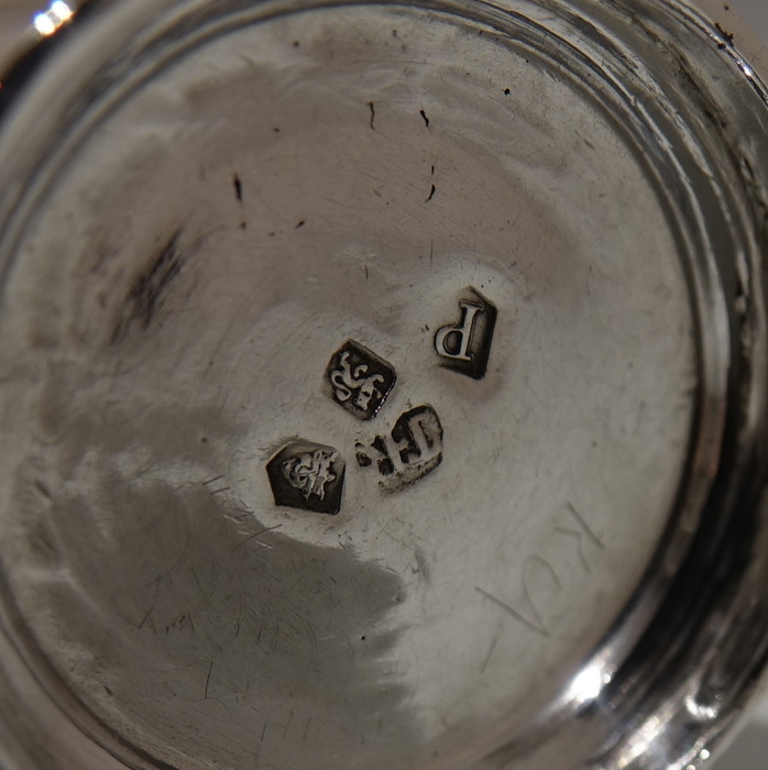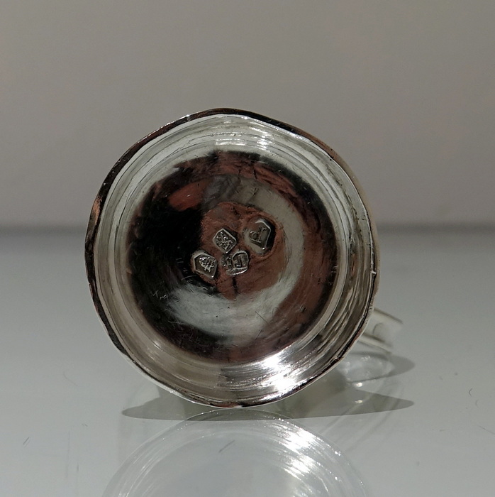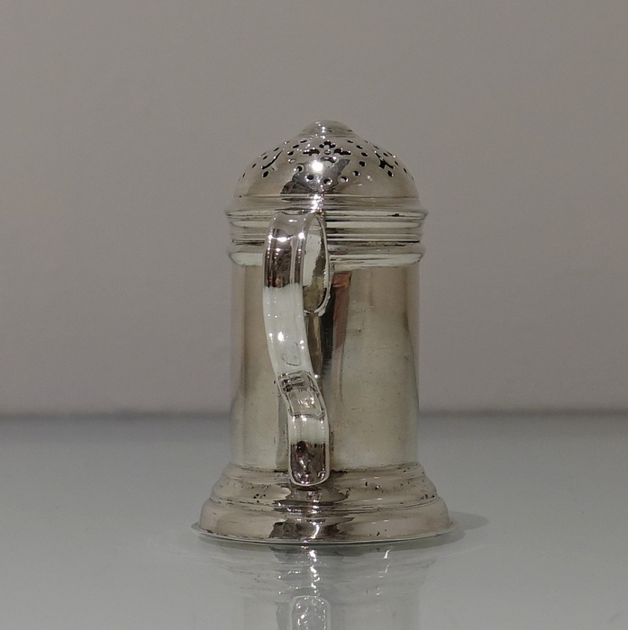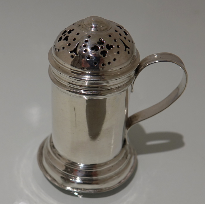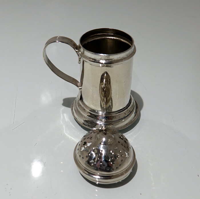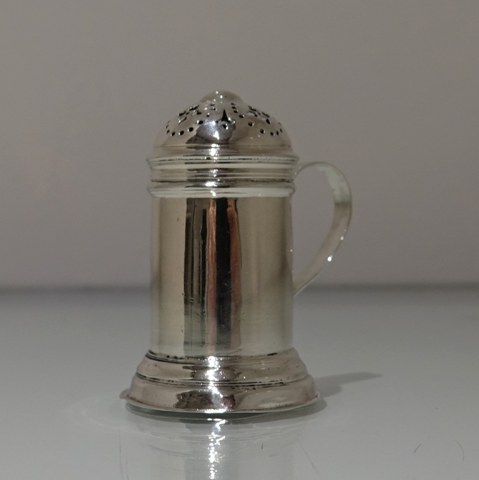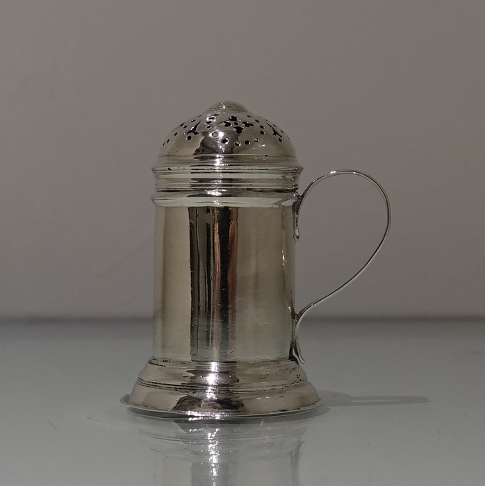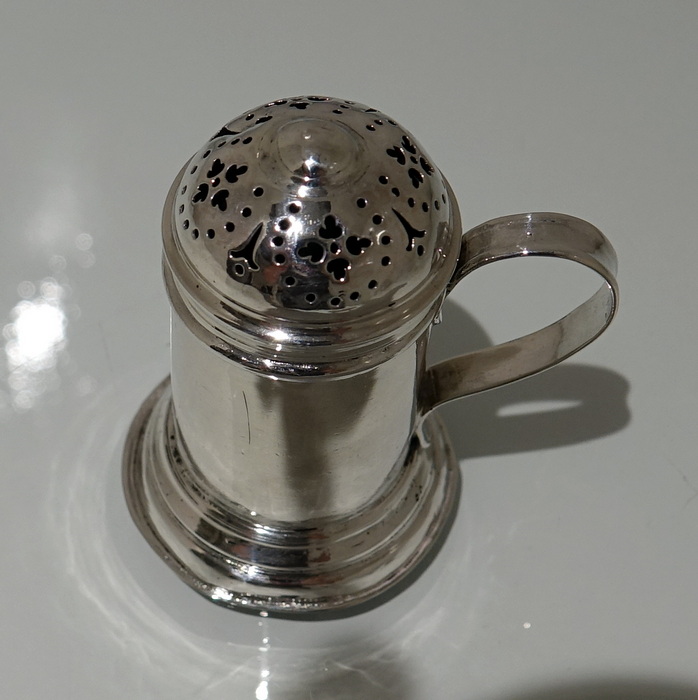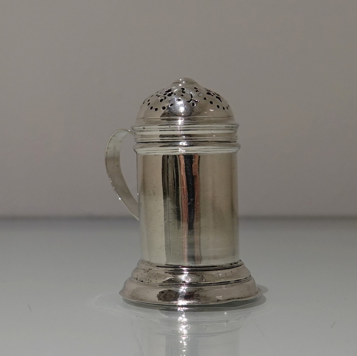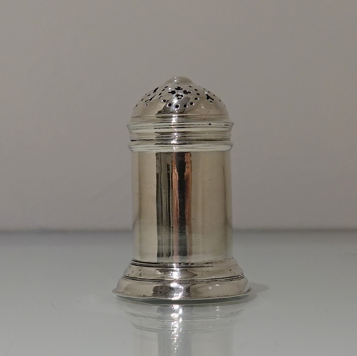 A rare and extremely beautiful early 18th century plain formed cylindrical kitchen pepper with slip-on domed cover. Â The foot design is circular flared skirt for lowlights.