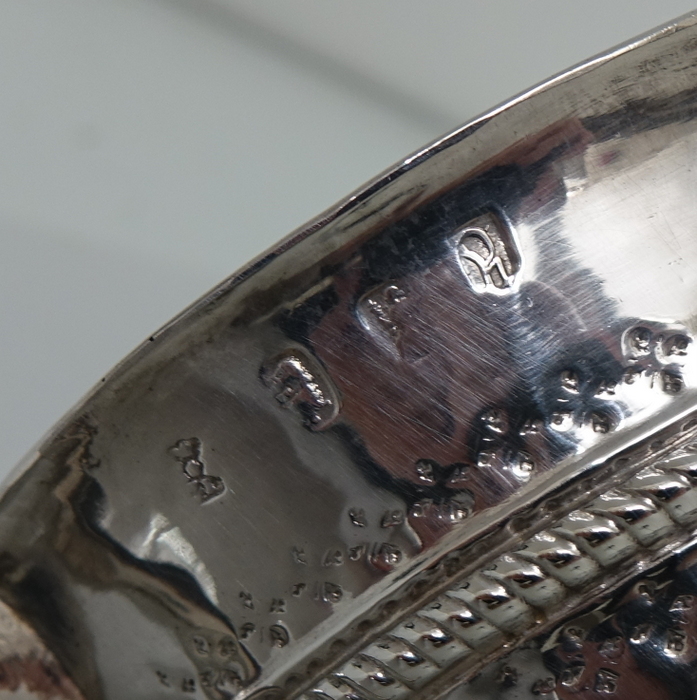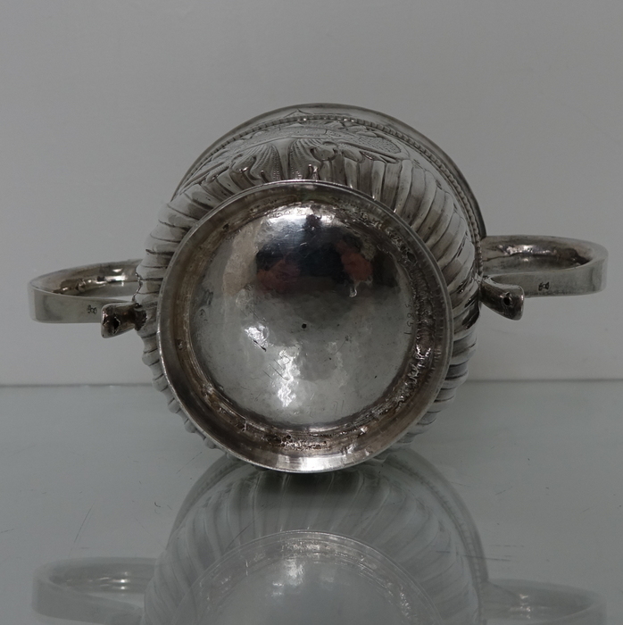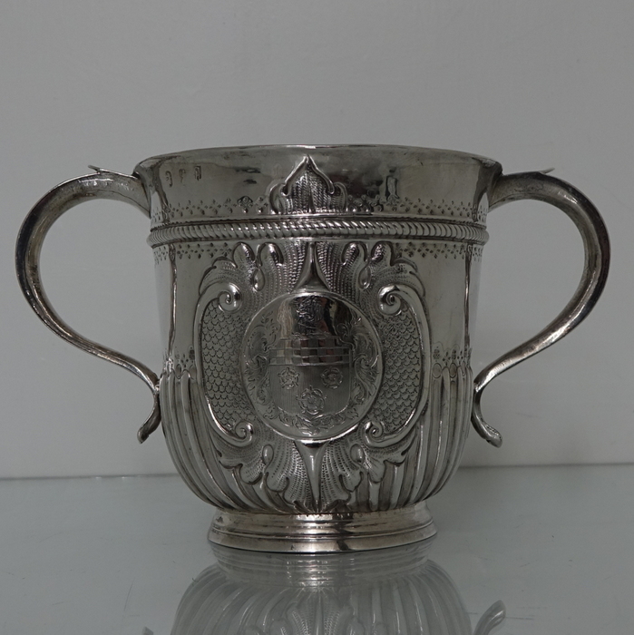 A very large and highly collectable early 18th century half fluted two handled porringer.  The porringer has an upper band of gadroon with a decorative form of hand engraving above and below.  There is a very elegant single cartouche in which sits a beautiful engraved coat of arms.  Both scroll handles have makers marks on the underside.