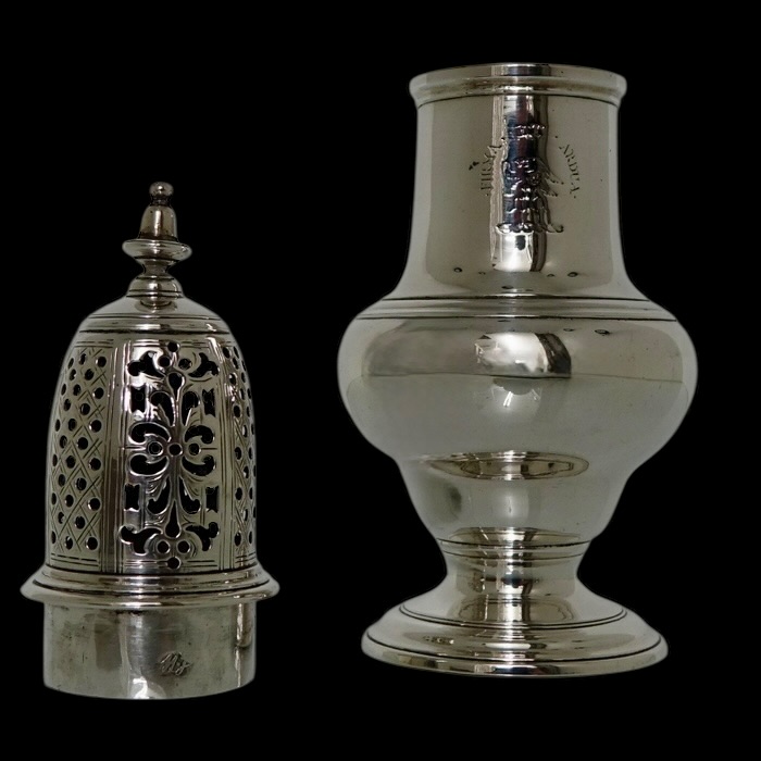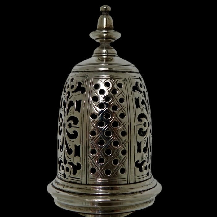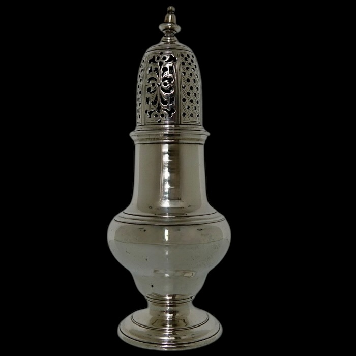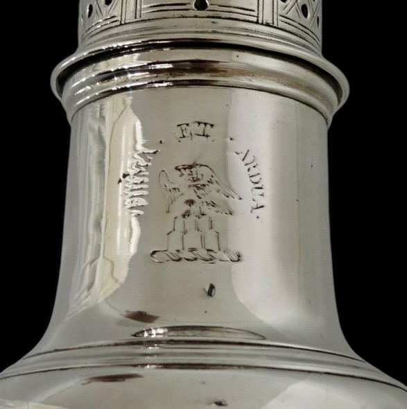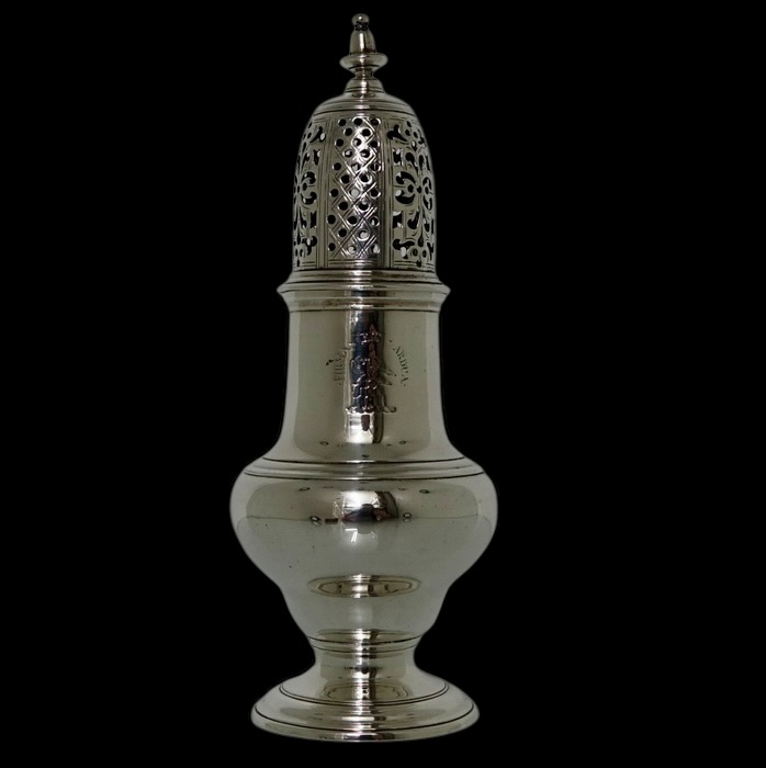 A very charming plain formed mid 18th century sugar caster with a beautiful hand pierced detachable lid. Â The body of the caster has an engraved crest.