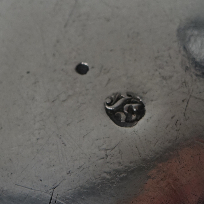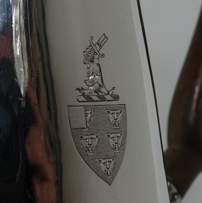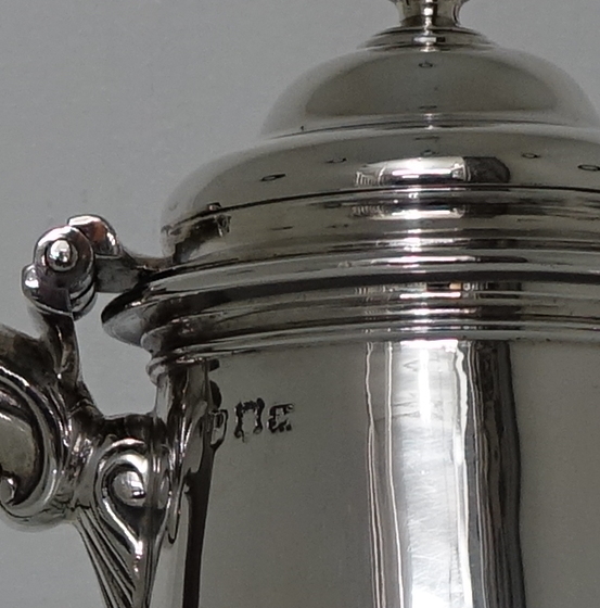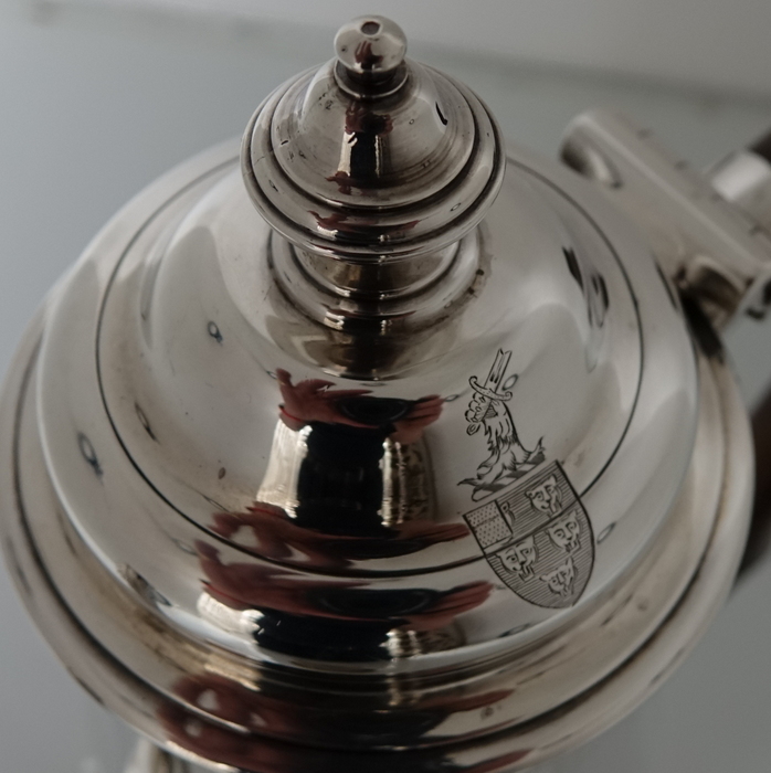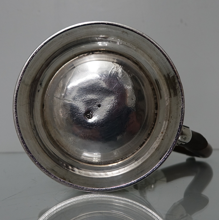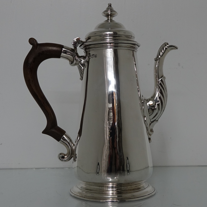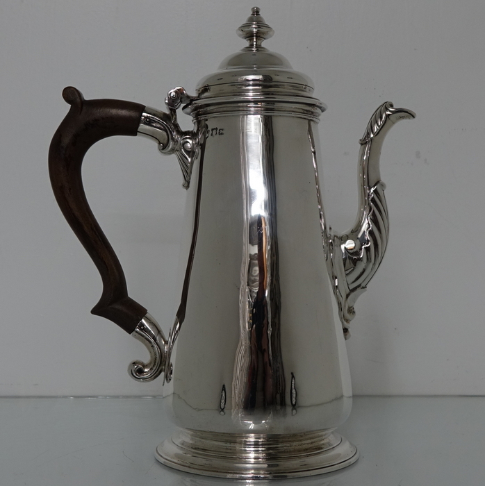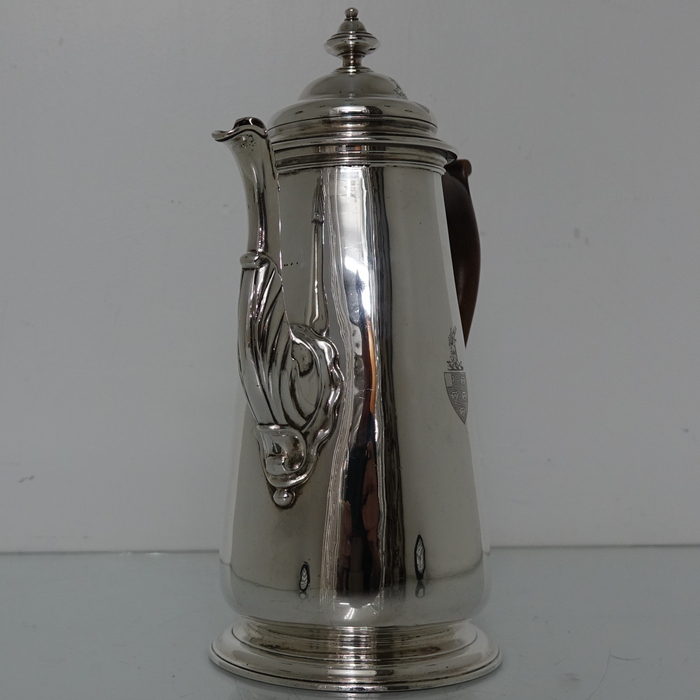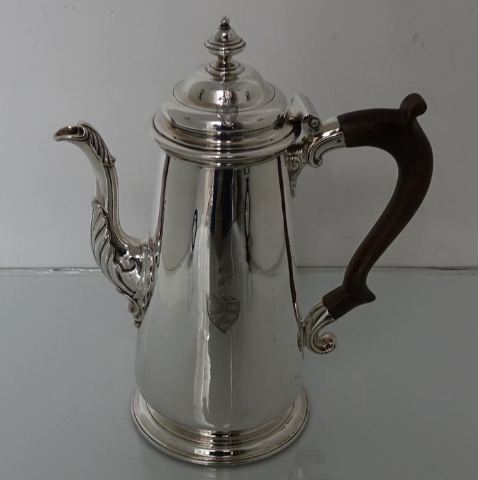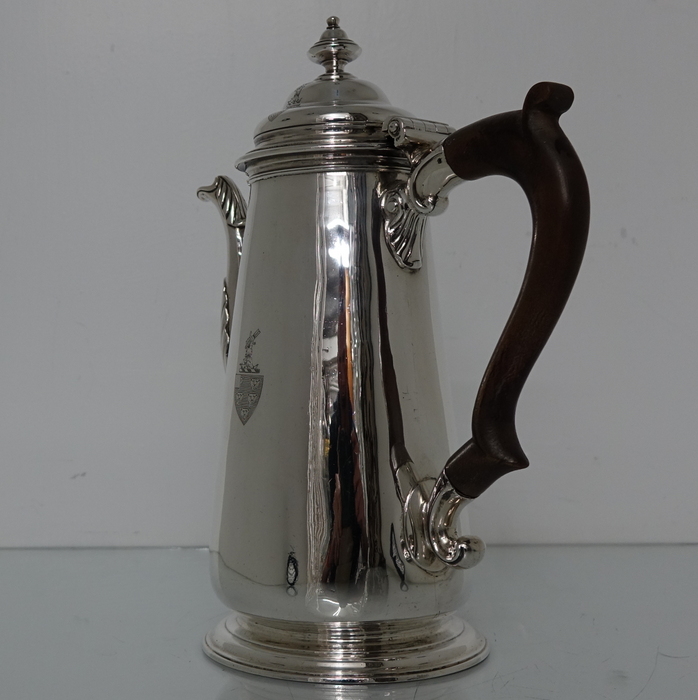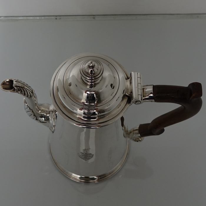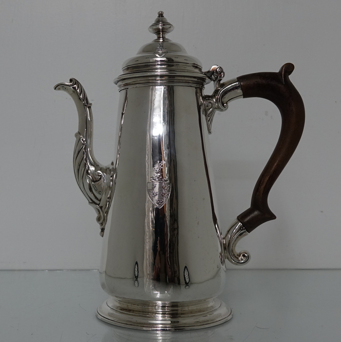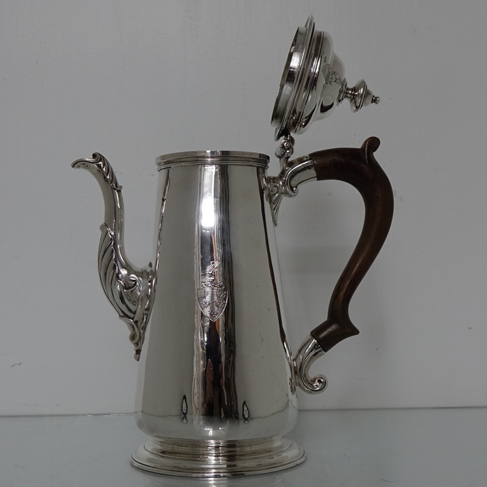 A very fine and good sized George II coffee pot with a elegant plain formed tapering body, ornate acanthus decorated style spout and scroll fruit wood handle. Â The lid of the pot is hinged and both body and lid has a contemporary coat of arms for importance.
