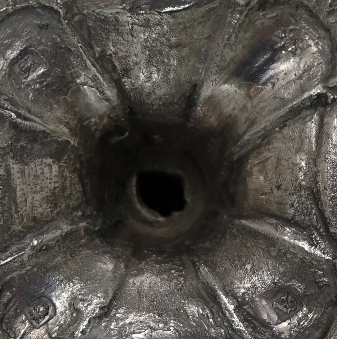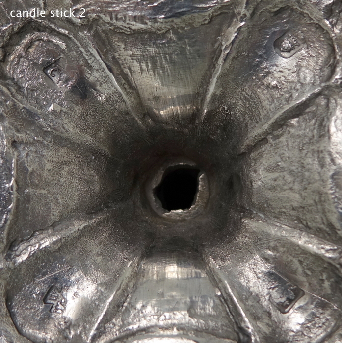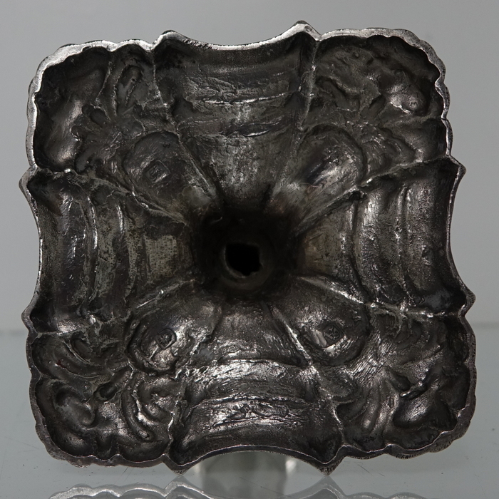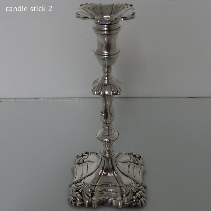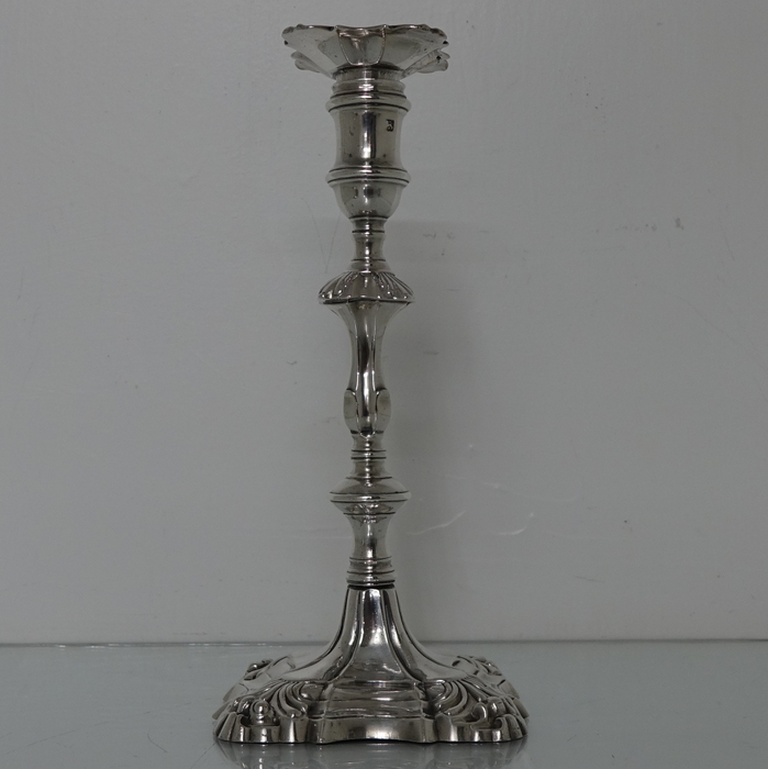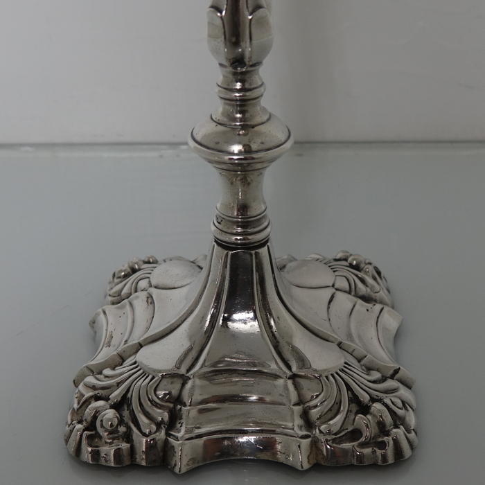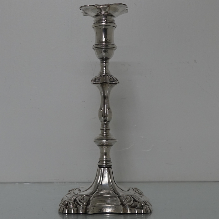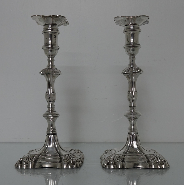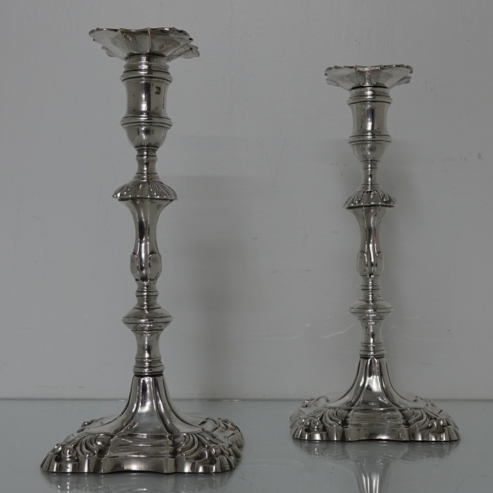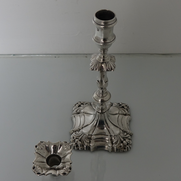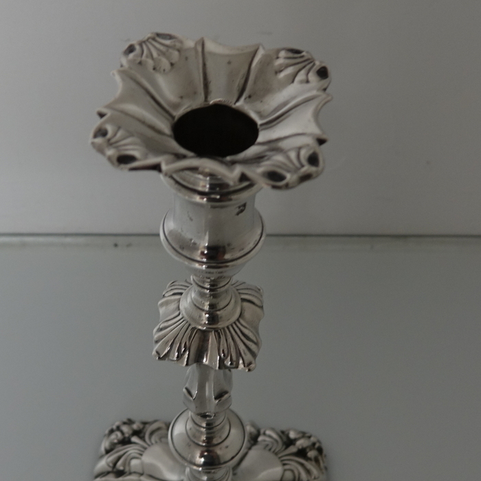 A very stylish pair of Georgian candlesticks with shaped square bases decorated with shells at the angle. Â The columns have additional shell decoration and are crowned with a elegant plain formed capital. Â Â The nozzles are detachable.