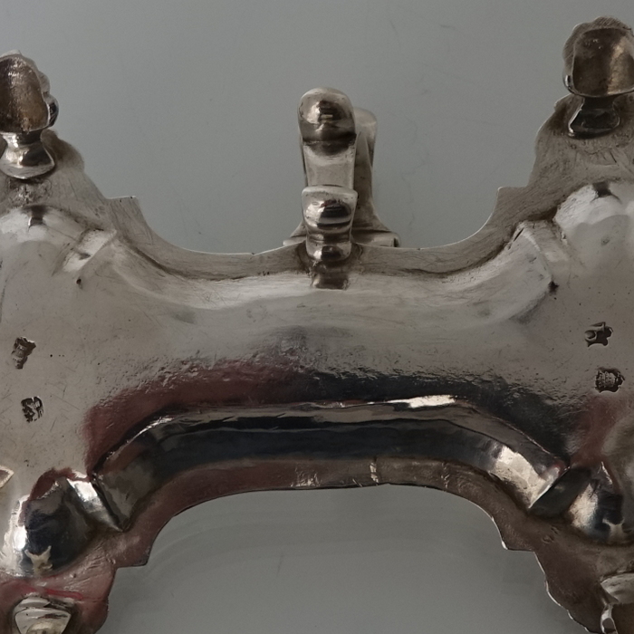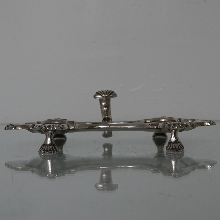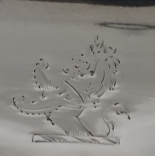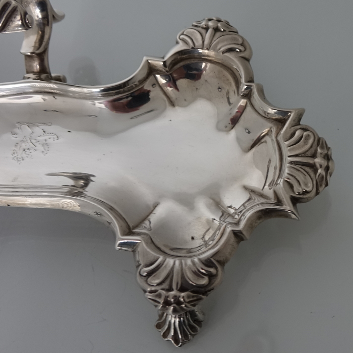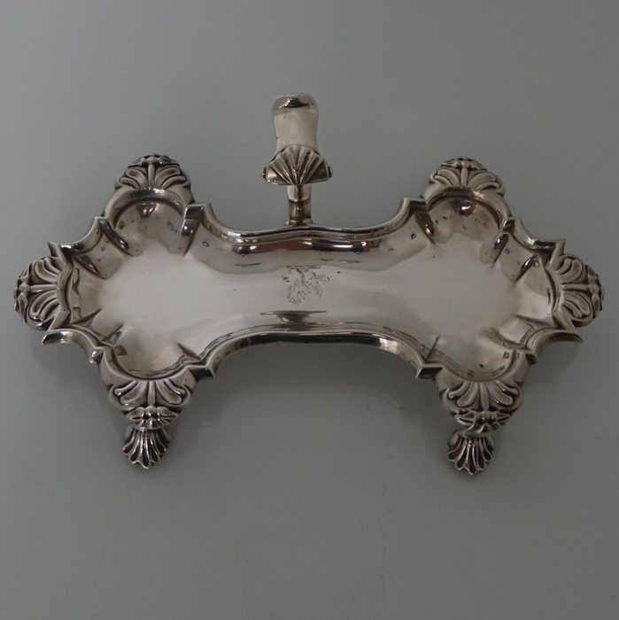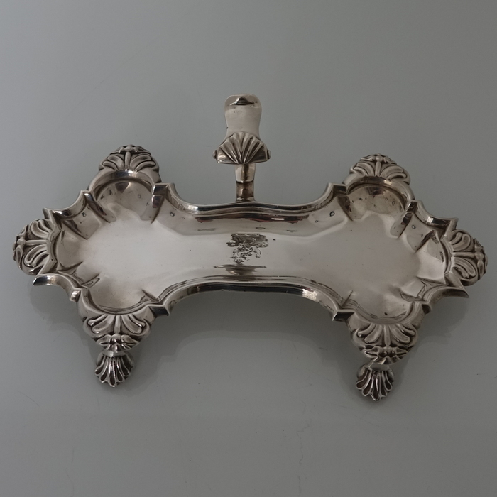 A very good quality and extremely stylish Georgian snuffer tray sitting on four ornate feet.  The snuffer tray has an applied decorative raised handle with thumb piece.  There is  a contemporary hand engraved crest for importance.
