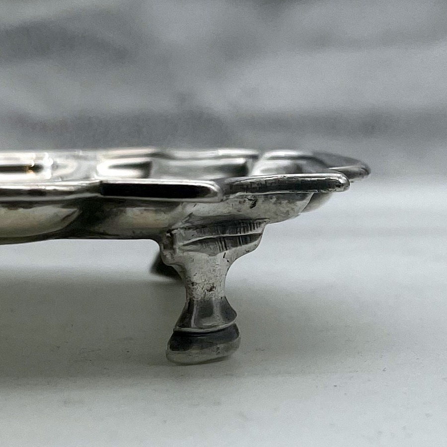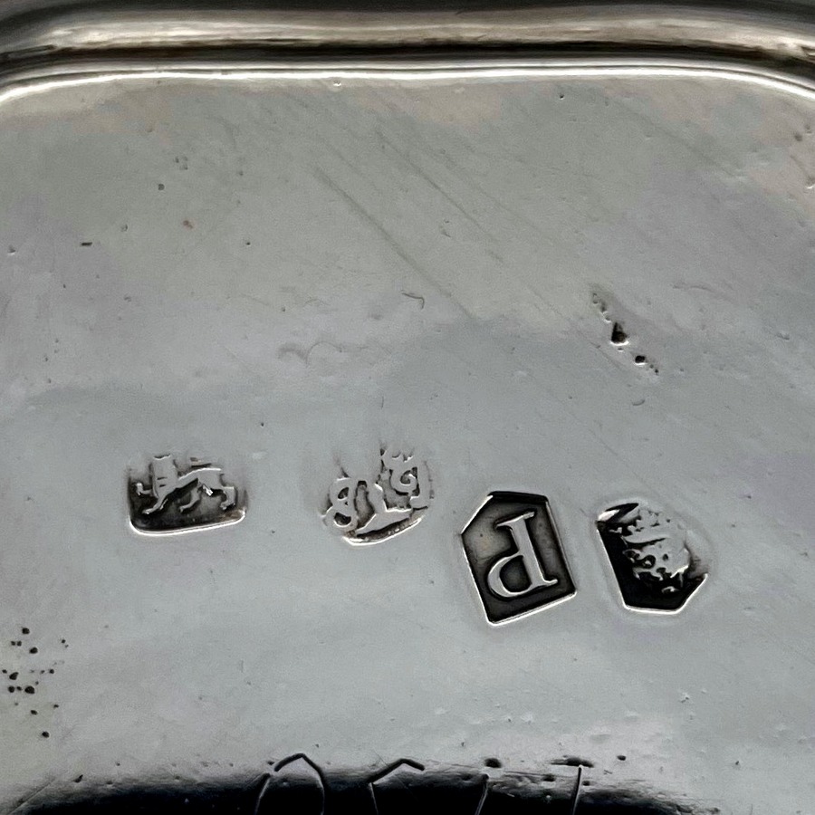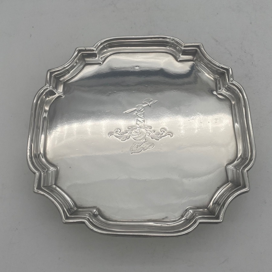 A sweet early George II silver salver designed with elegant shaped raised outer walls and four stylish feet. Â The centre front has a beautiful hand engraved contemporary armorial (Kilkenny Cuffes:Â John Cuffe died 1749) for importance.