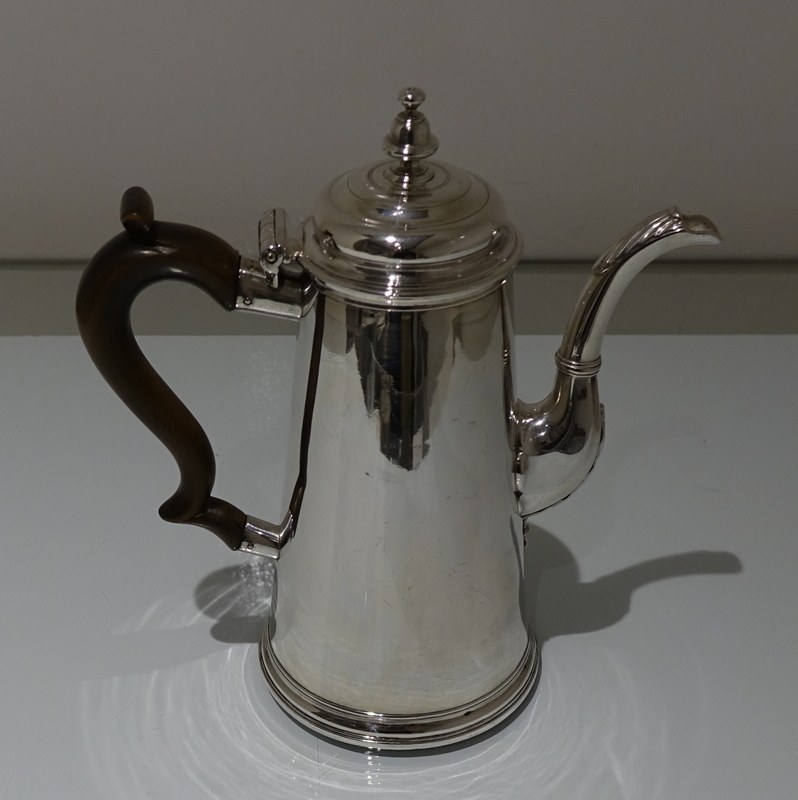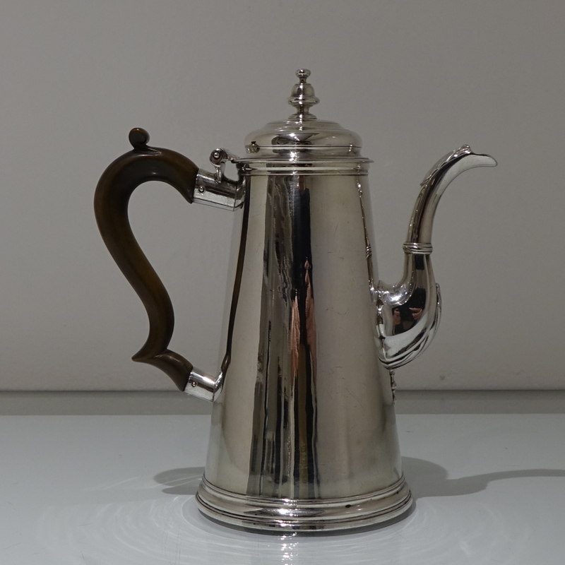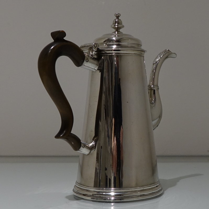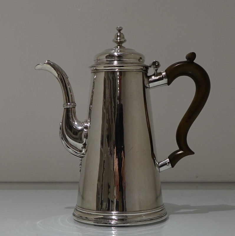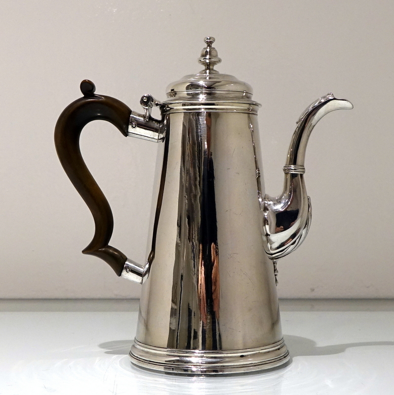 A stunning early Georgian coffee pot plain formed in design. Â The body elegantly tapers at the angles and the spout has lower decorative cast mouldings for highlights. Â The lid is hinged and the applied fruit wood handle is double scroll formed.