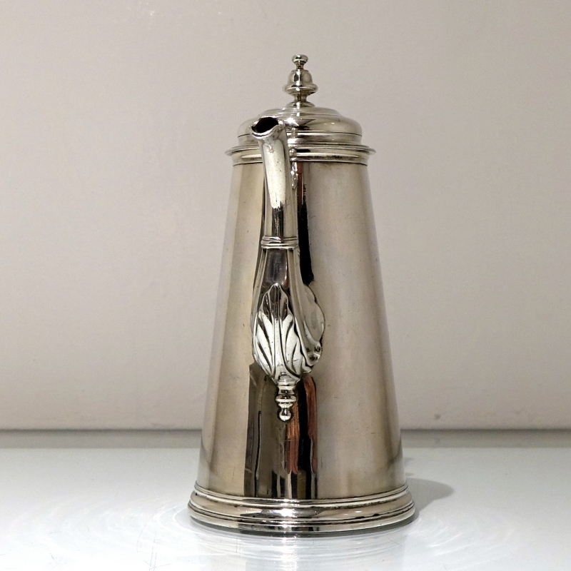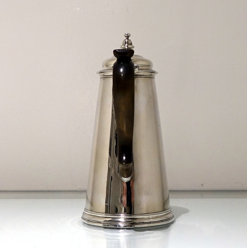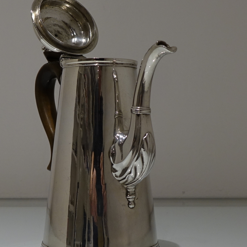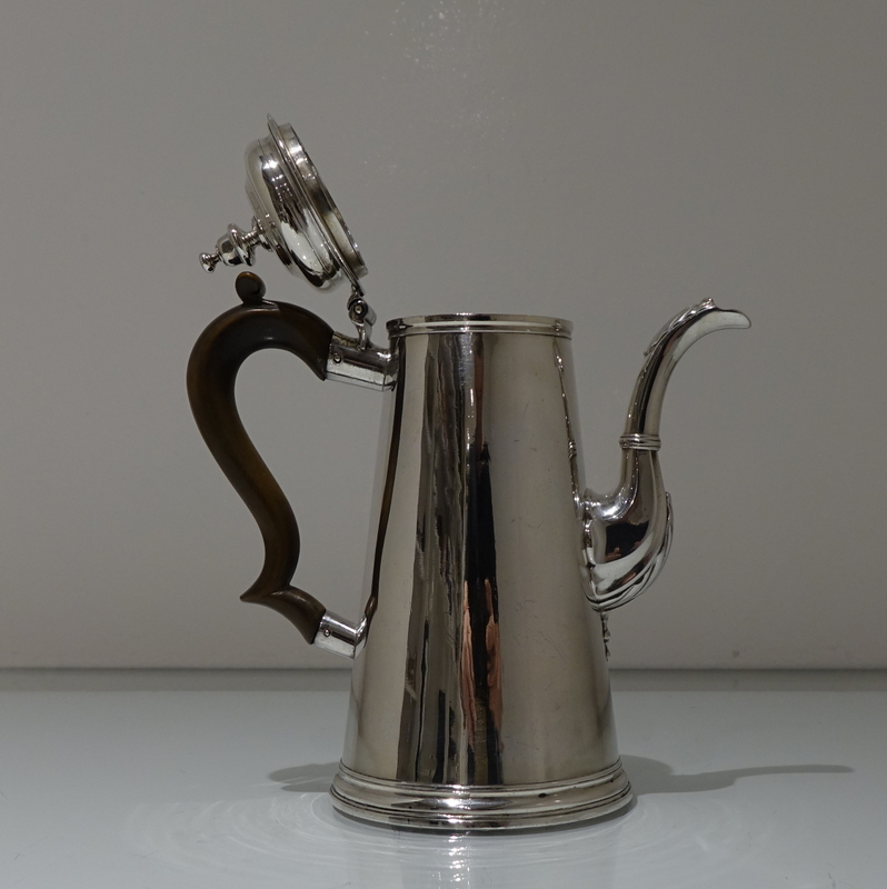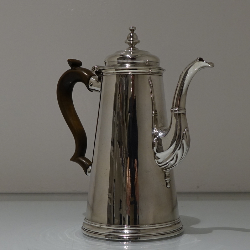 A stunning early Georgian coffee pot plain formed in design. Â The body elegantly tapers at the angles and the spout has lower decorative cast mouldings for highlights. Â The lid is hinged and the applied fruit wood handle is double scroll formed.