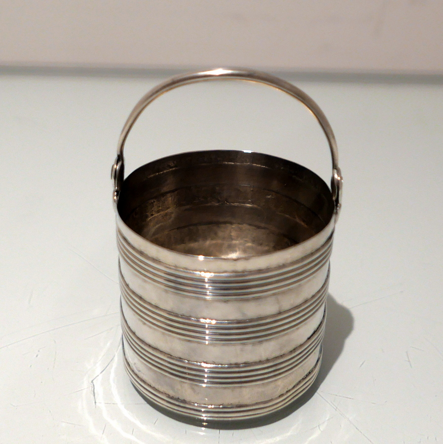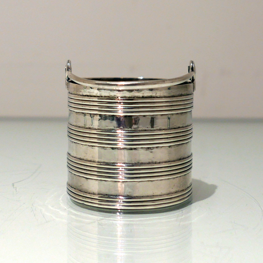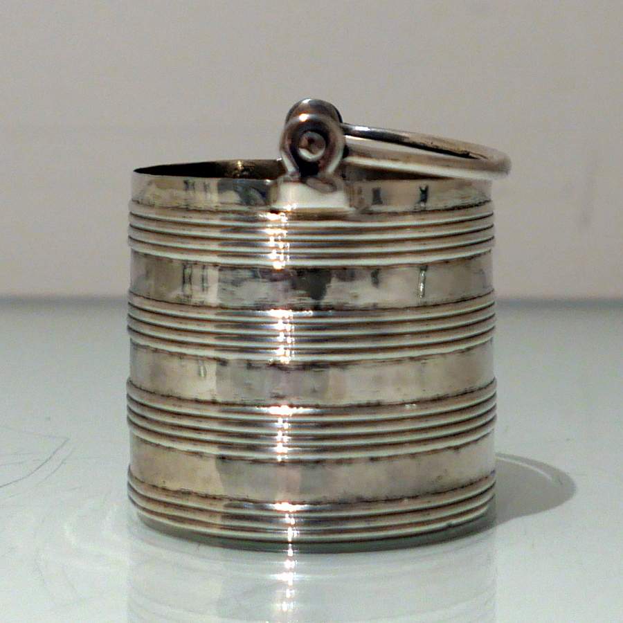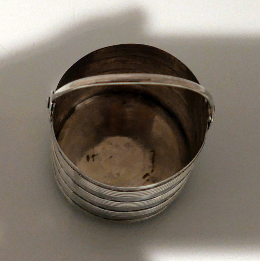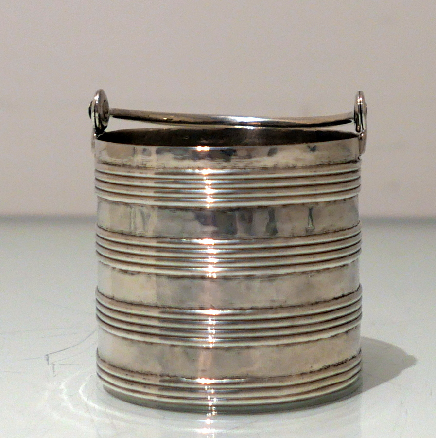 A rare early 18th century swing handled sterling silver cream pail designed with elegant reed style strap work bands alternating plain formed bands for decorative contrast.