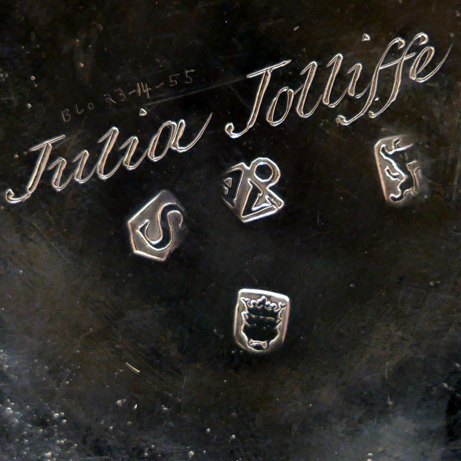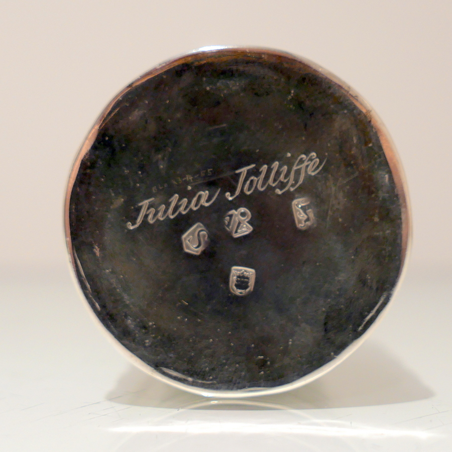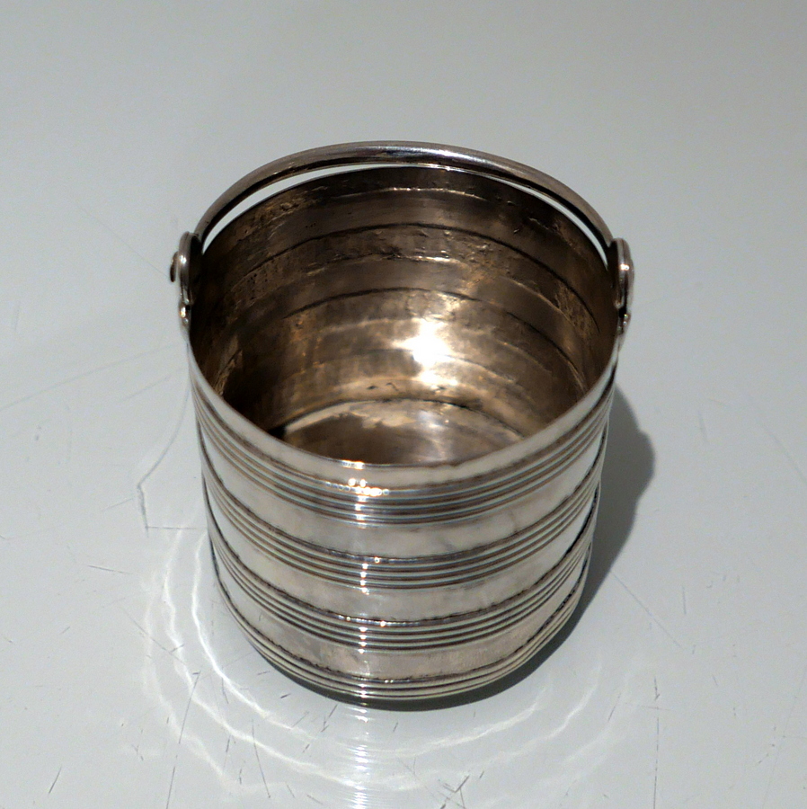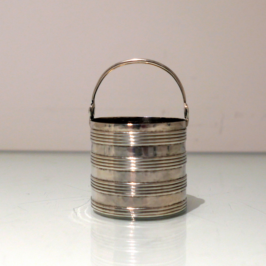 A rare early 18th century swing handled sterling silver cream pail designed with elegant reed style strap work bands alternating plain formed bands for decorative contrast.