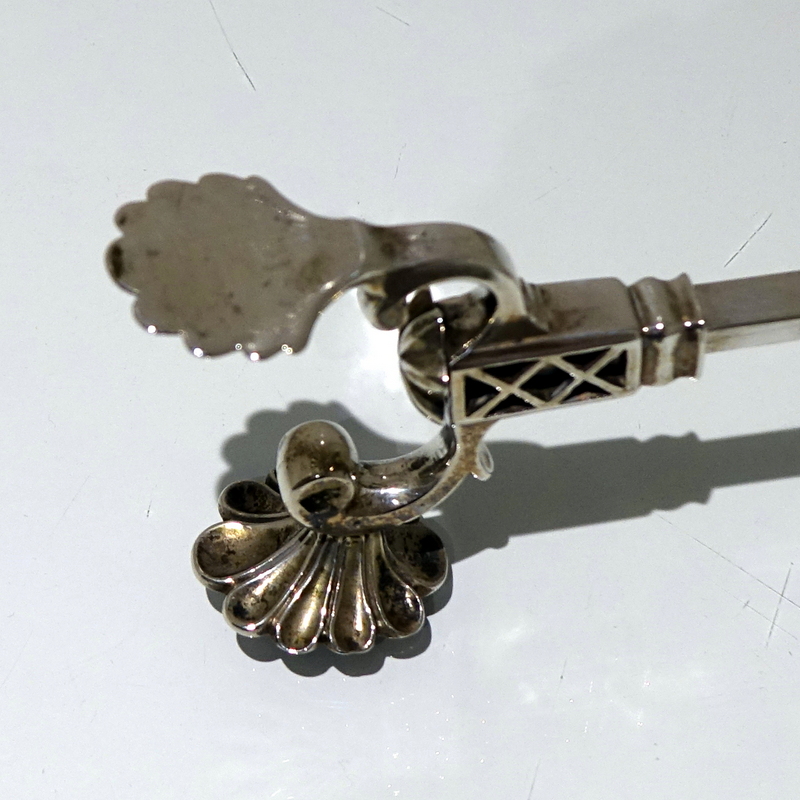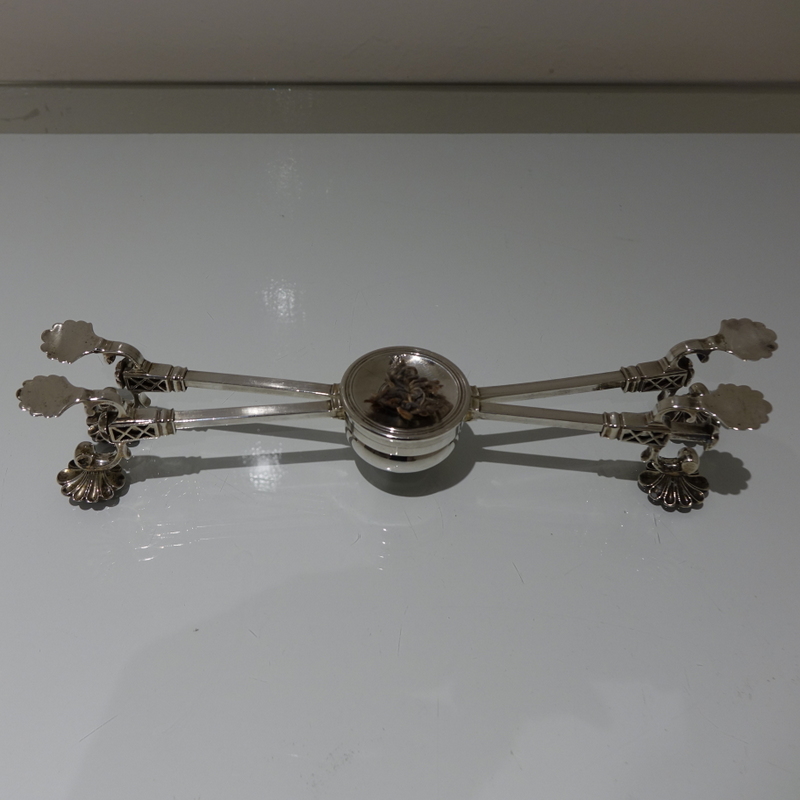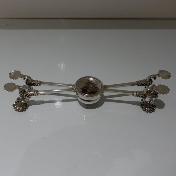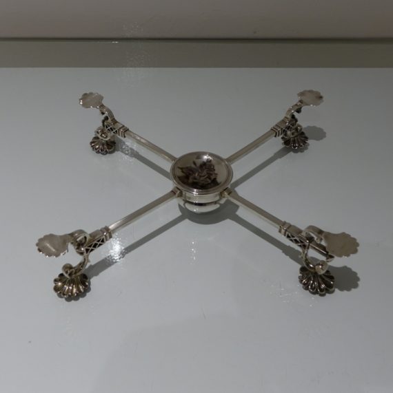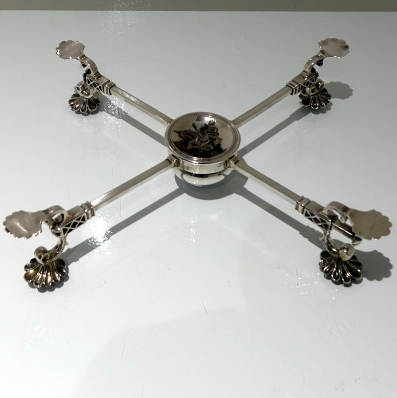 A rare and extremely collectable mid 18th century silver dish cross with a central cauldron burner and four expandable tubed arms which have sliding ornate adjustable plate rests.