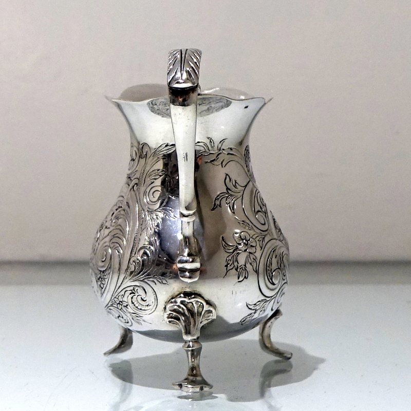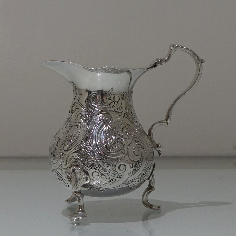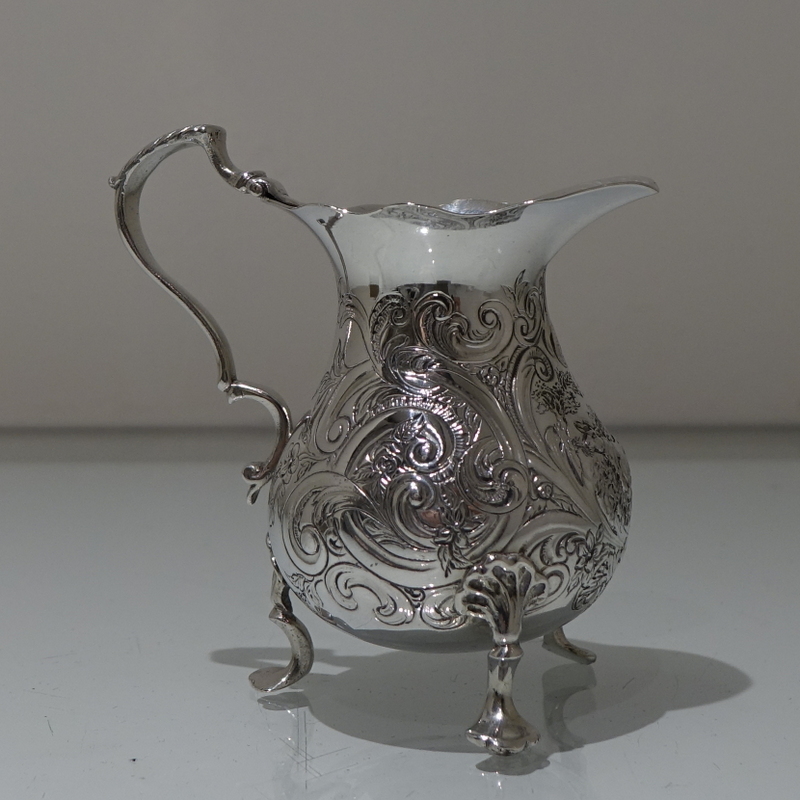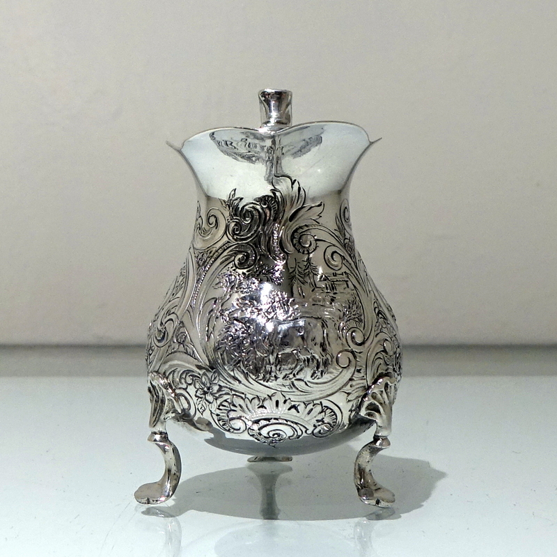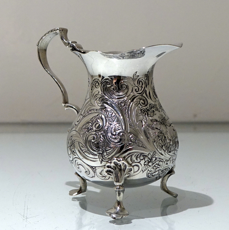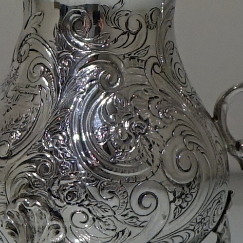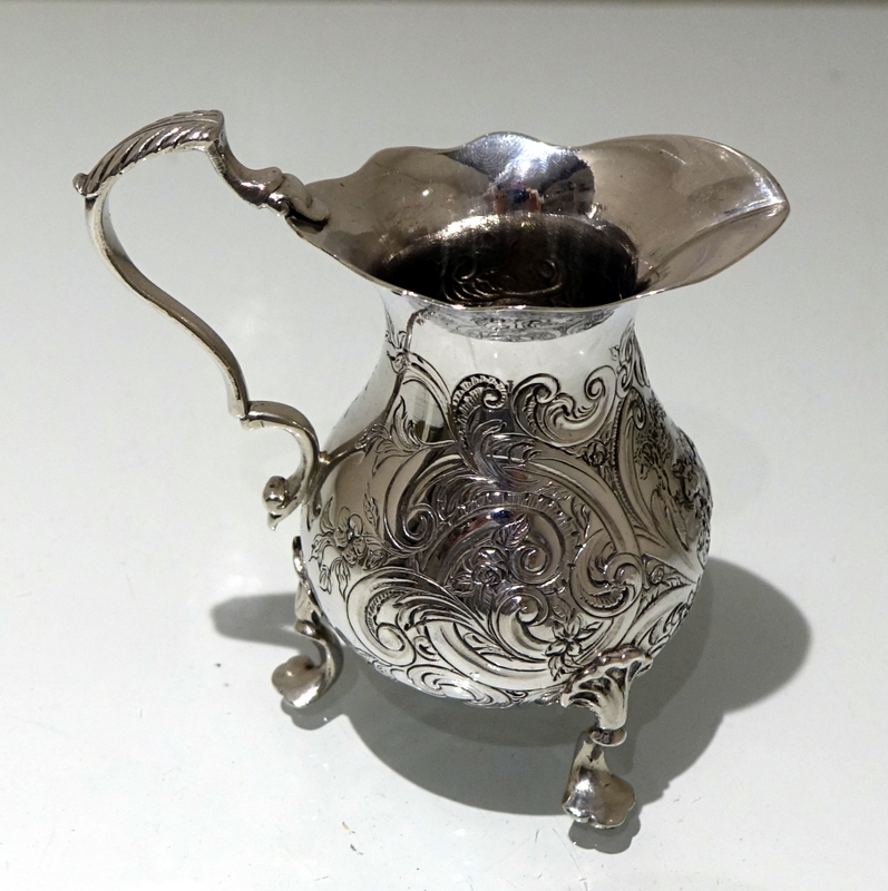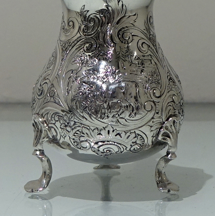 A splendid mid 18th century rococo period cream jug decorated with exceptional floral chased workmanship. Â The centre front has a beautiful cartouche in which sits a magnificent rural (bucolic) scene.