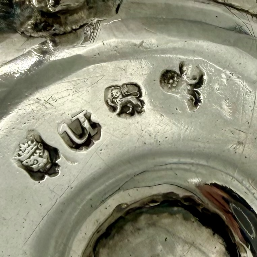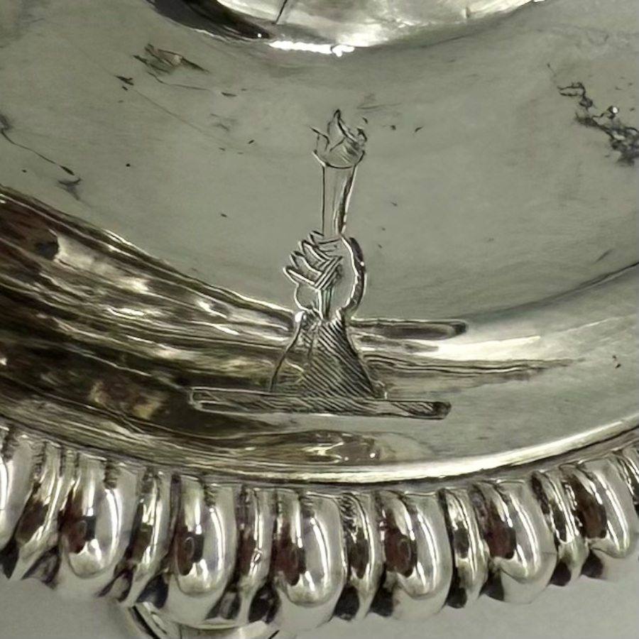 Extremely charming small circular mid 18th century silver chamberstick decorated with an elegant gadroon border and a stylish original crest.