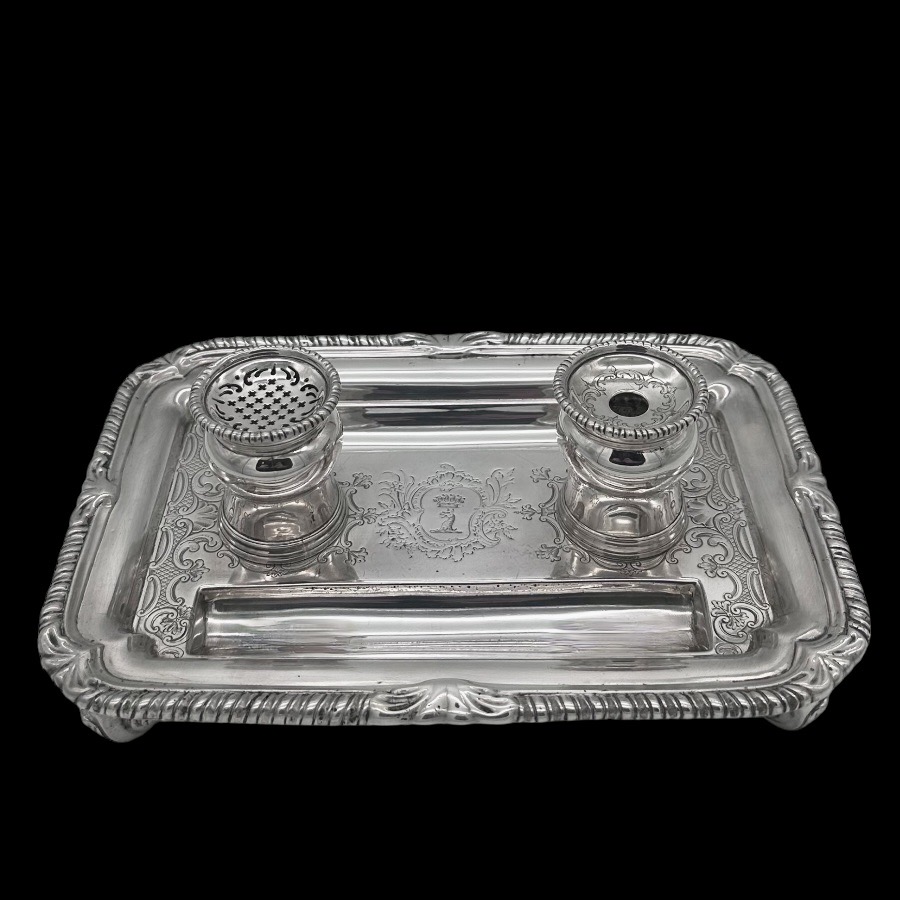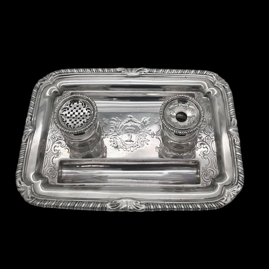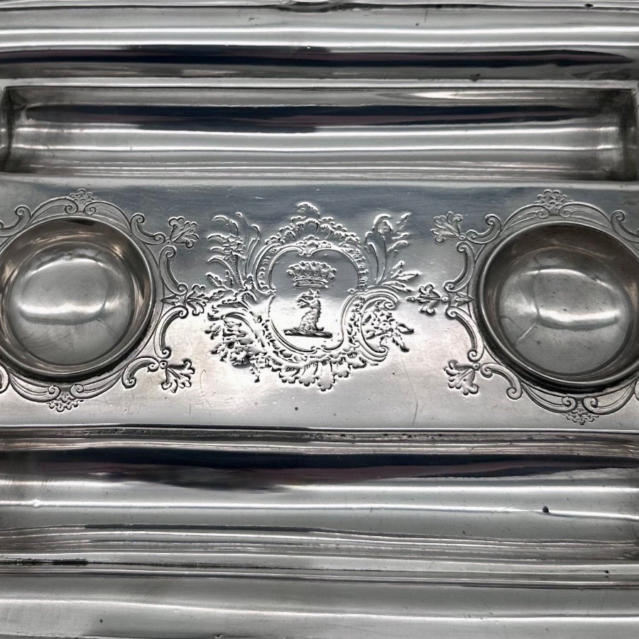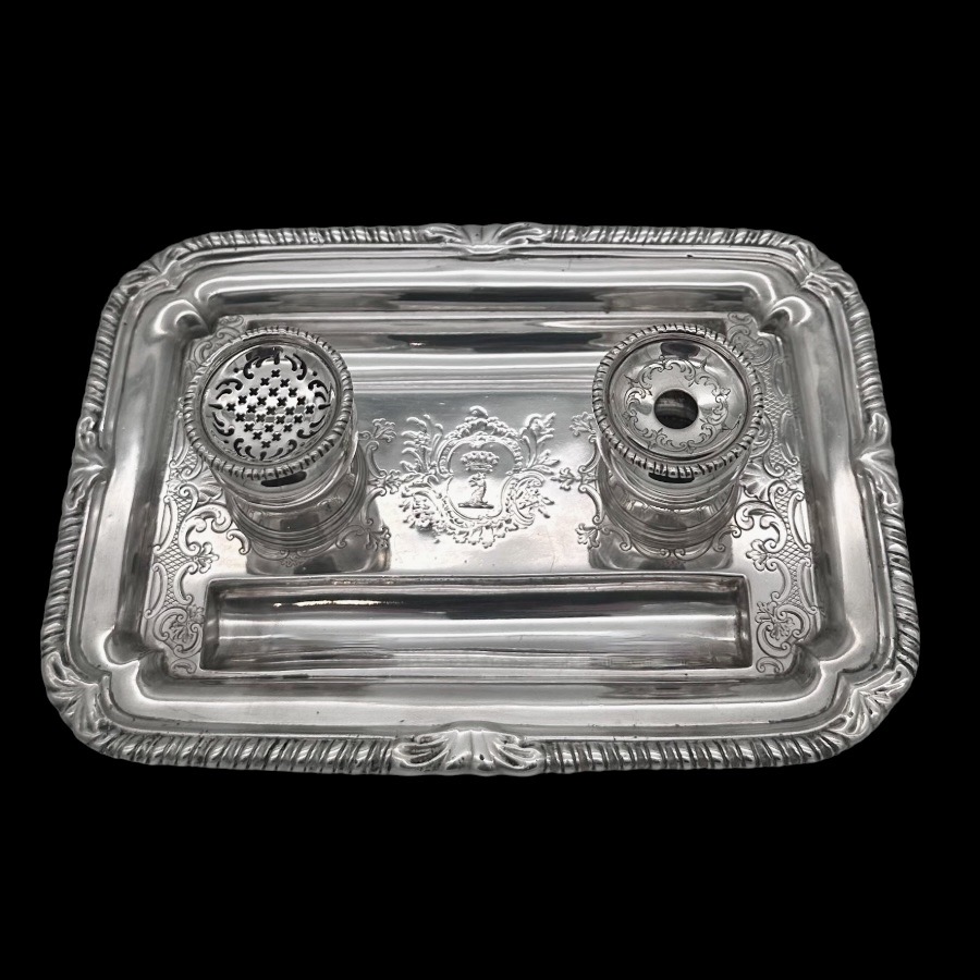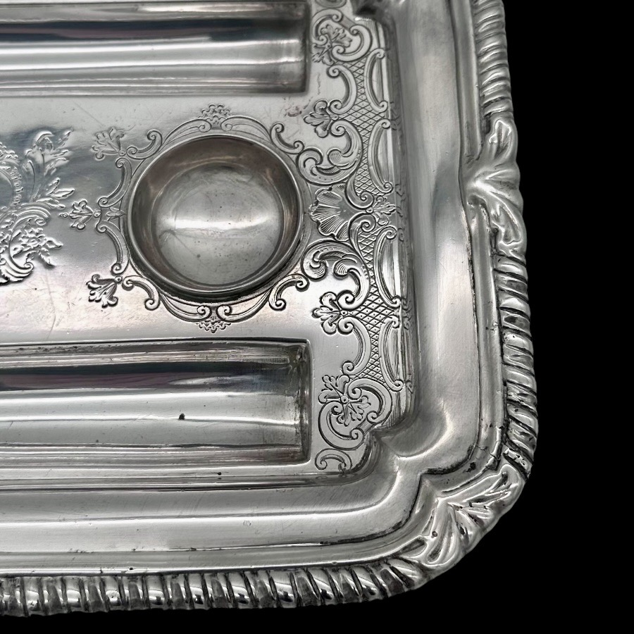 Very fine and highly collectable George II shaped rectangular shell and gadroon themed silver inkstand designed with two knib trays and decorated with stunning intricate original brick work flat chasing.