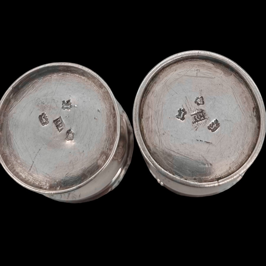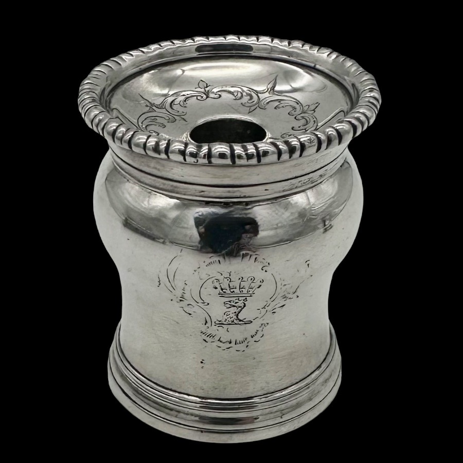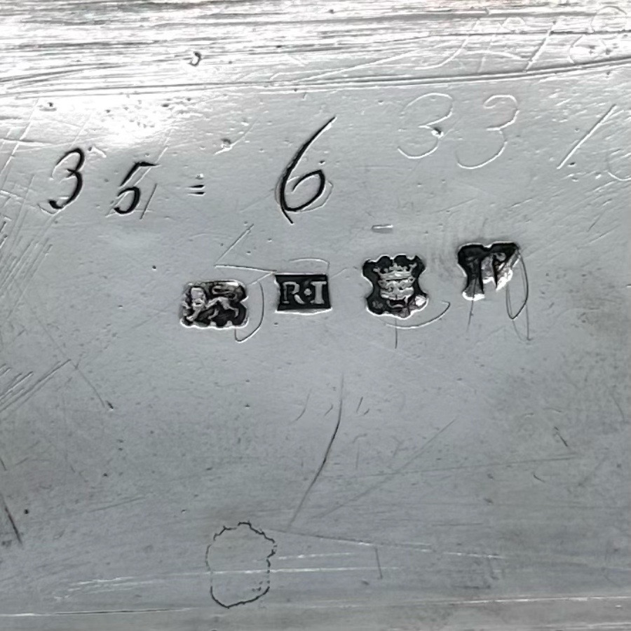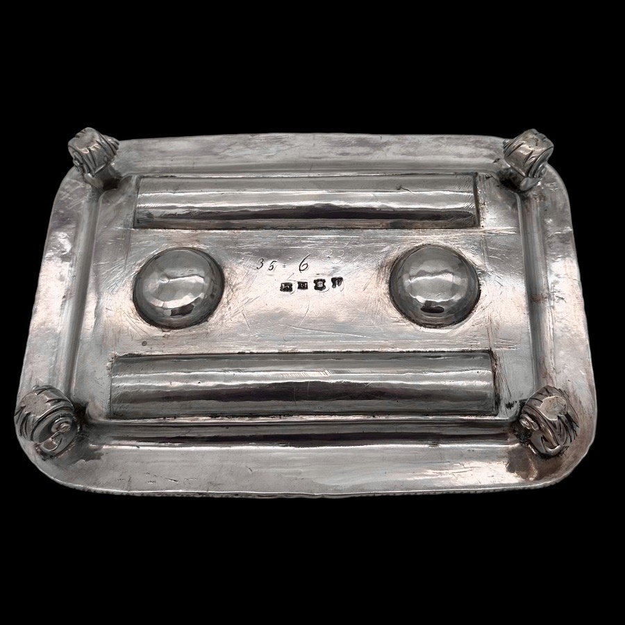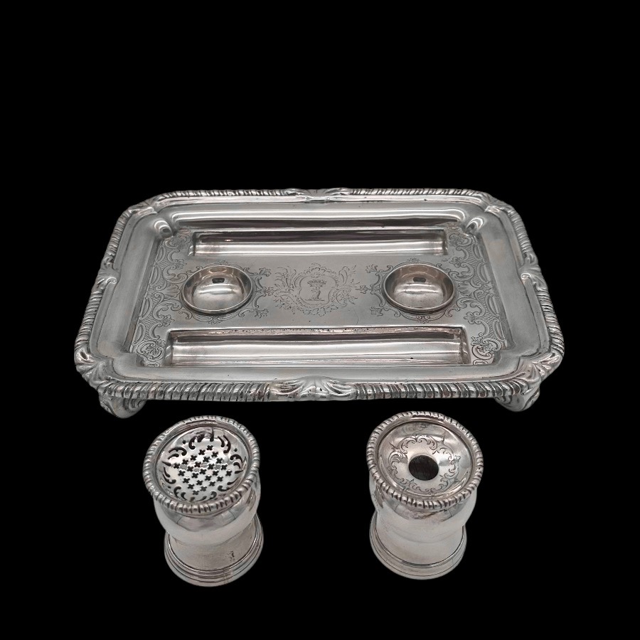 Very fine and highly collectable George II shaped rectangular shell and gadroon themed silver inkstand designed with two knib trays and decorated with stunning intricate original brick work flat chasing.