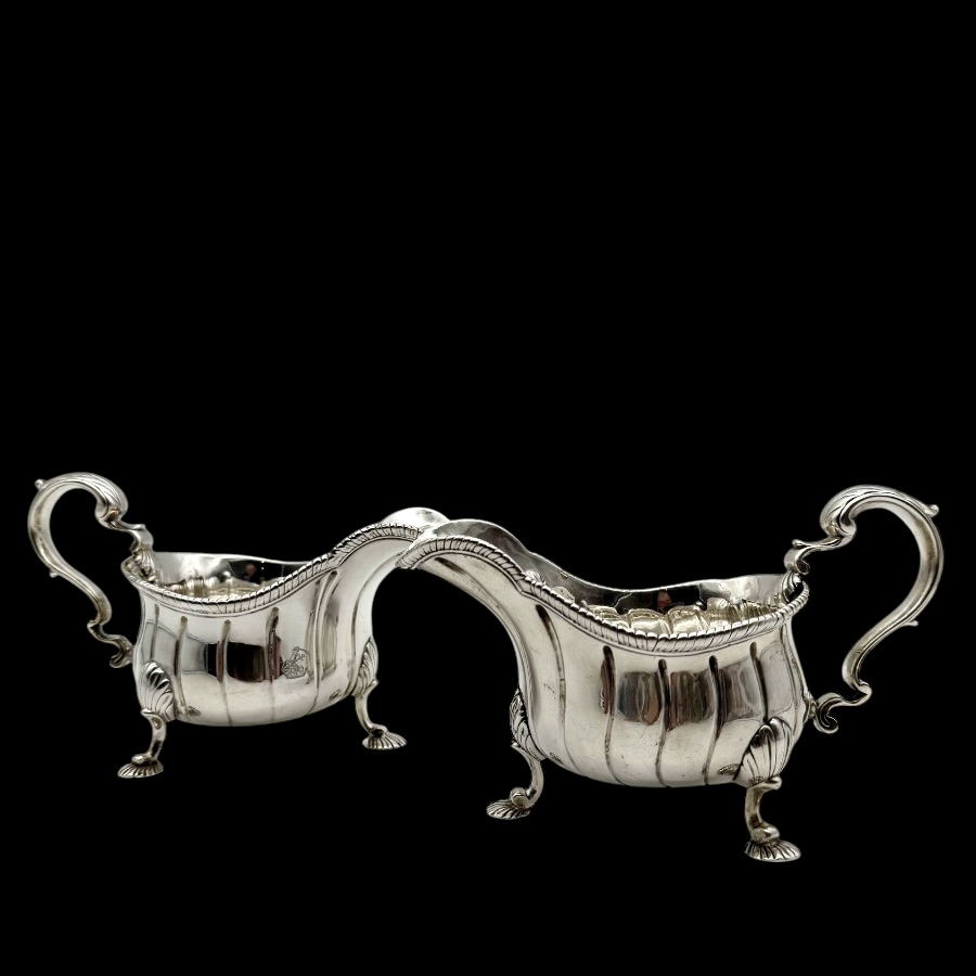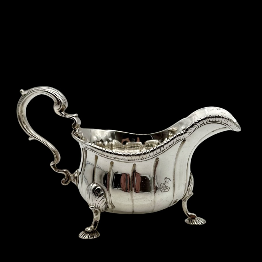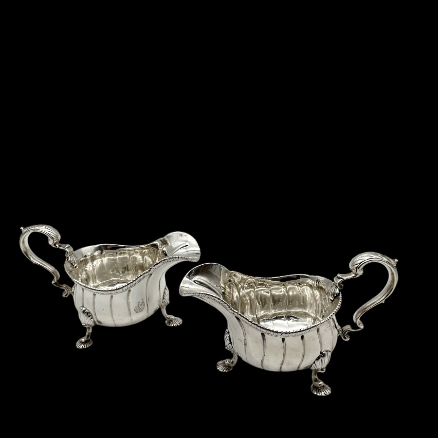 Stylish pair of Georgian silver sauceboats designed with elegant shallow flutes and an applied upper gadroon borders with hand engraved original ship motifs crests for importance.