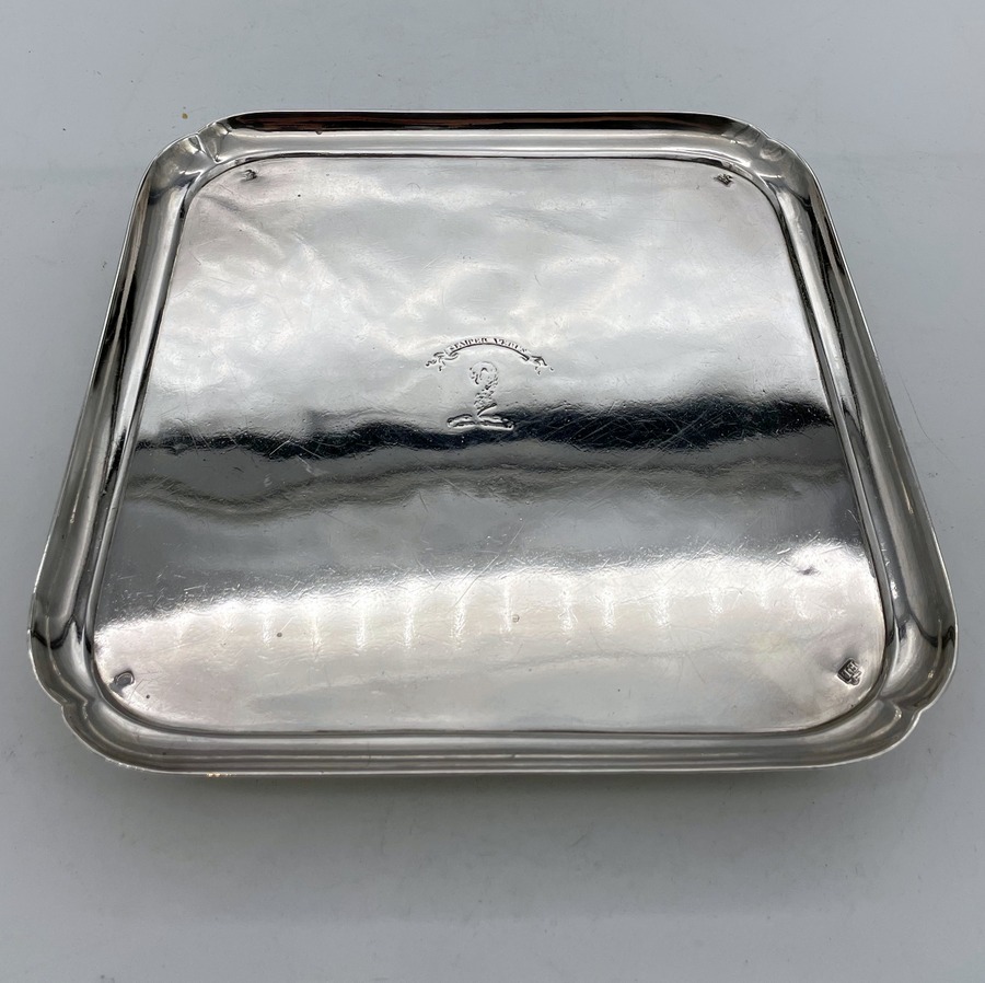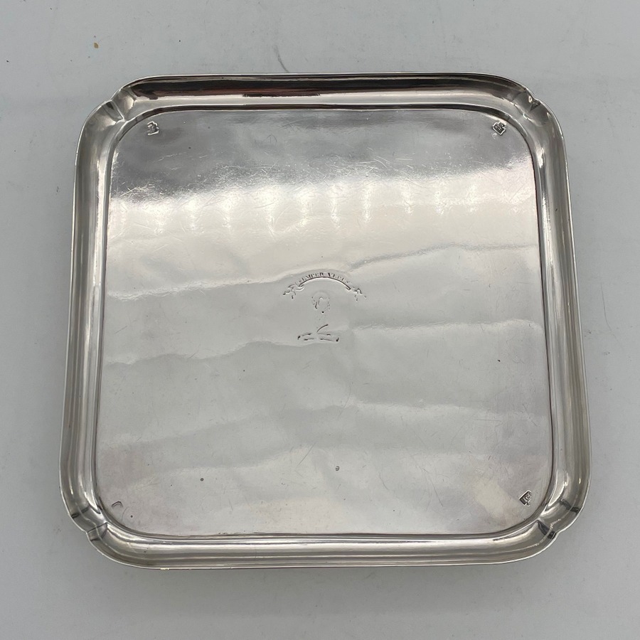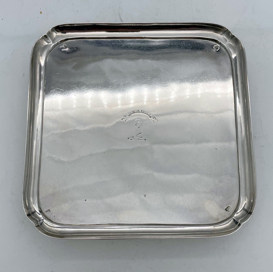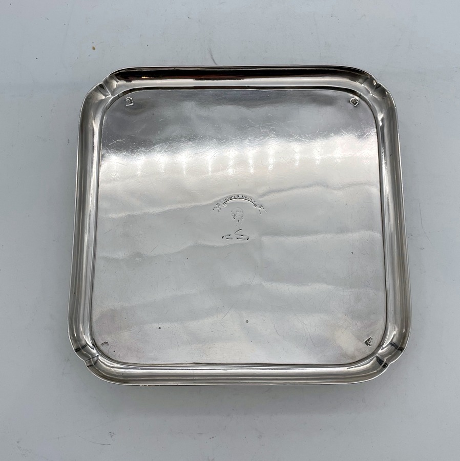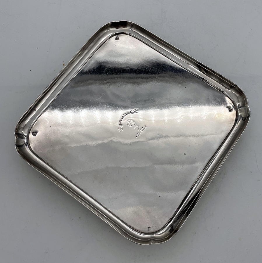 A rare and highly collectable George II shaped square silver salver designed with an elegant plain formed body and raised outer concave walls. Â The salver sits on four stylish feet and has a beautiful hand engraved contemporary crest for importance.