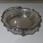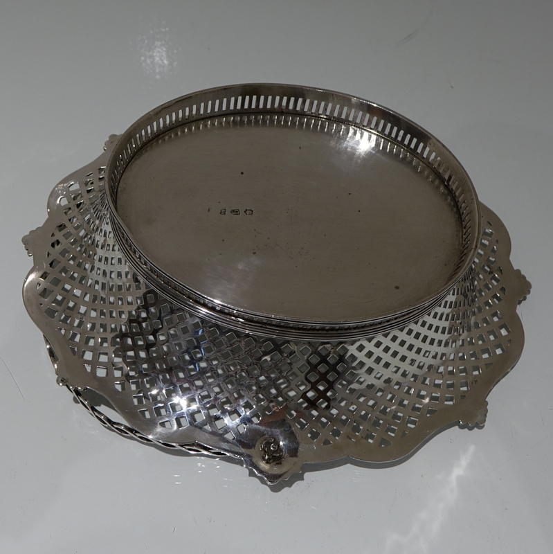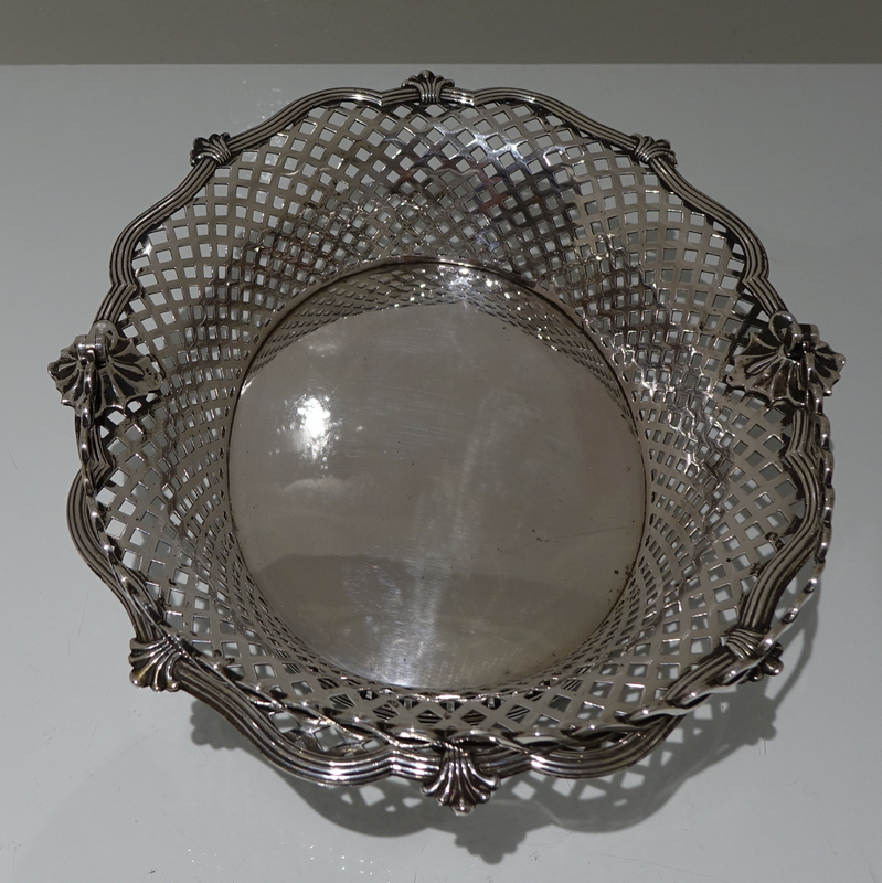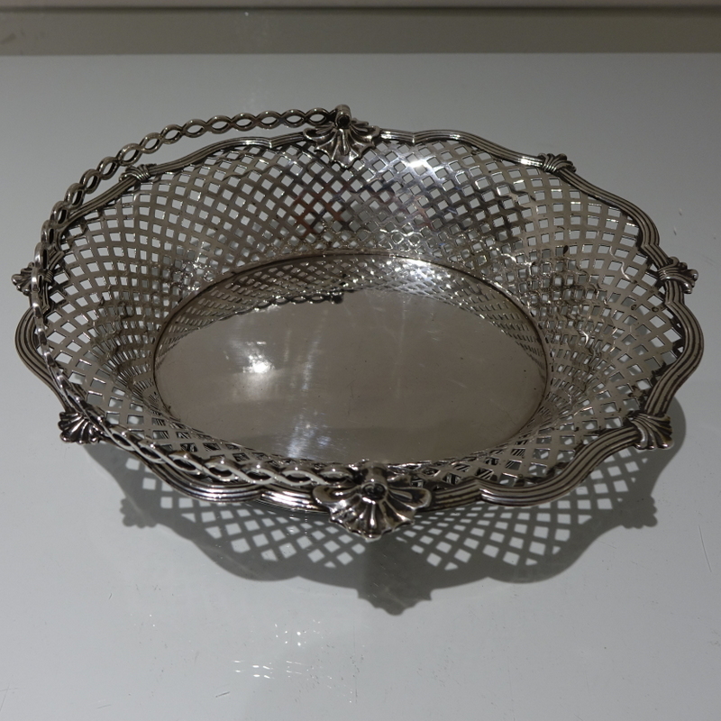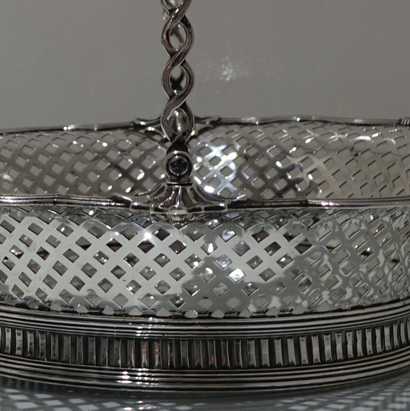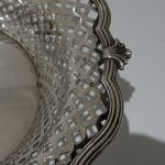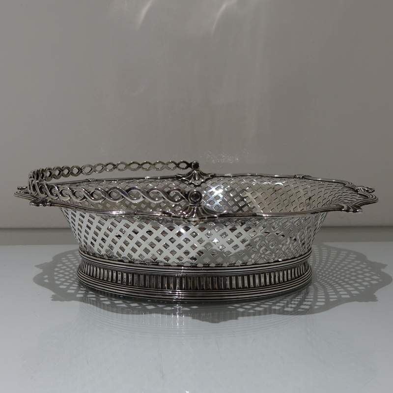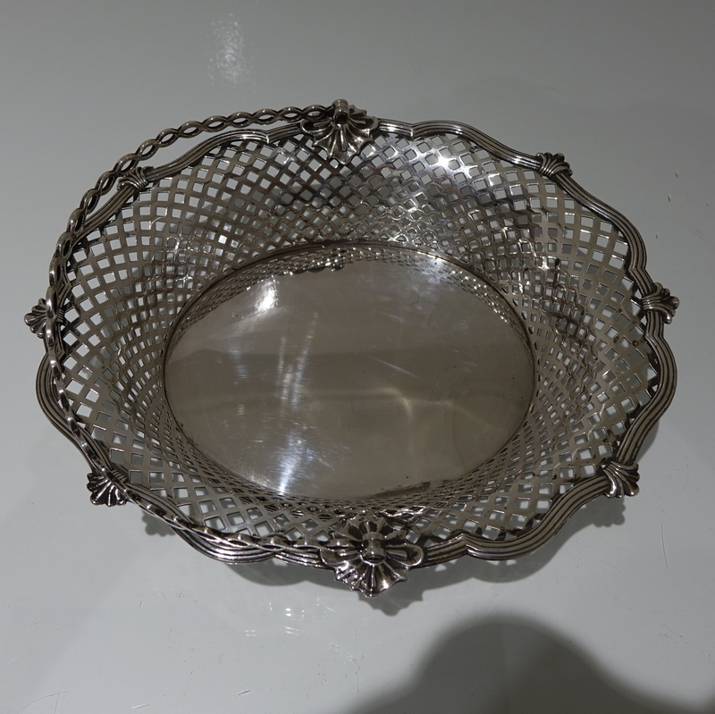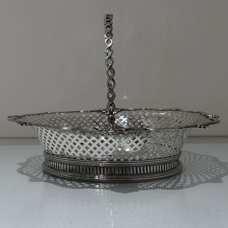 A beautiful and unusual designed shaped oval swing handled cake basket decorated with hand pierced lattice work to the outer wall of the bowl and has a stunning applied alternate reed and fleur de leaf border for decorative highlights.