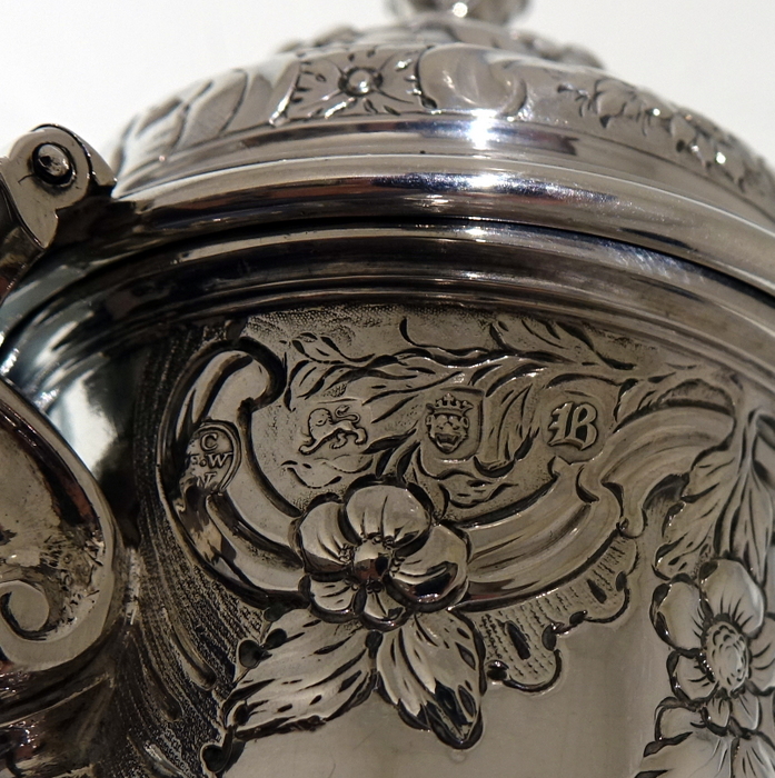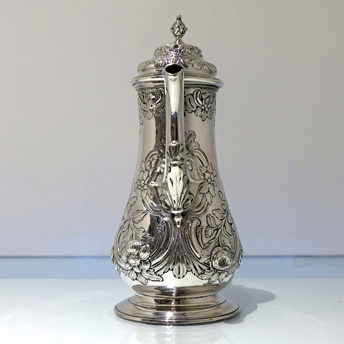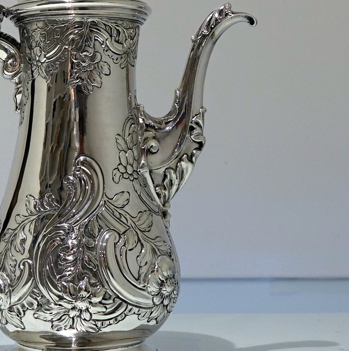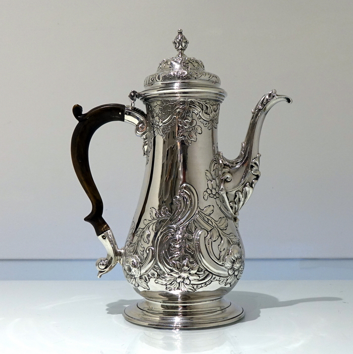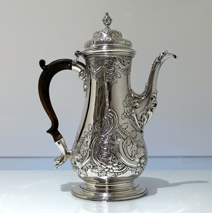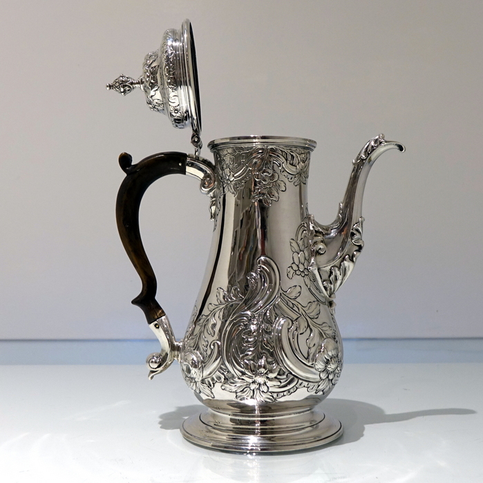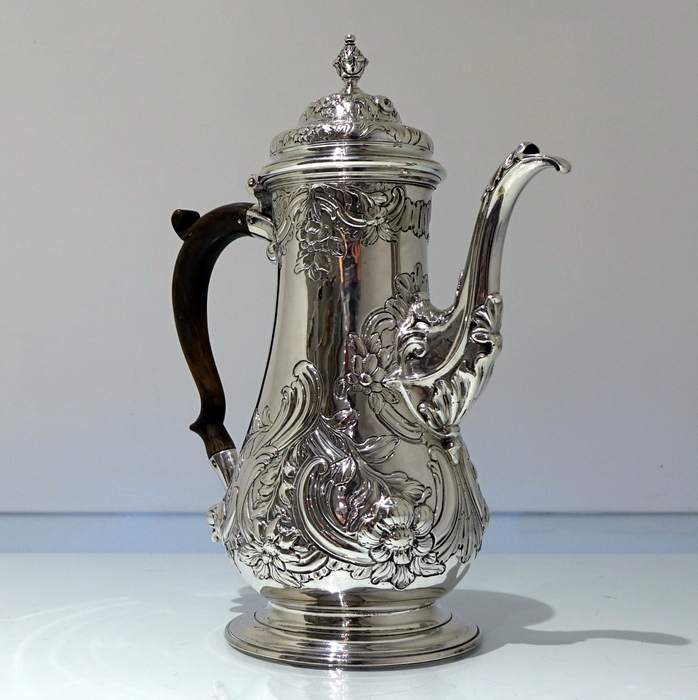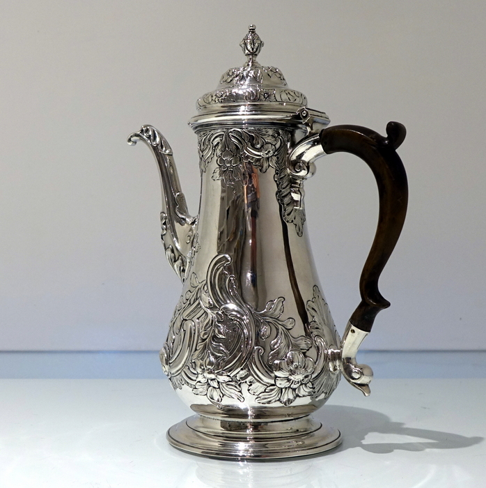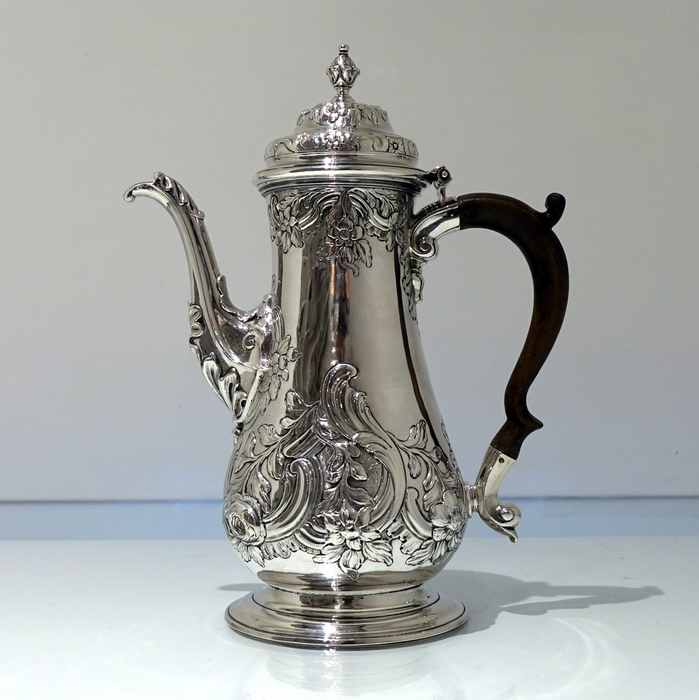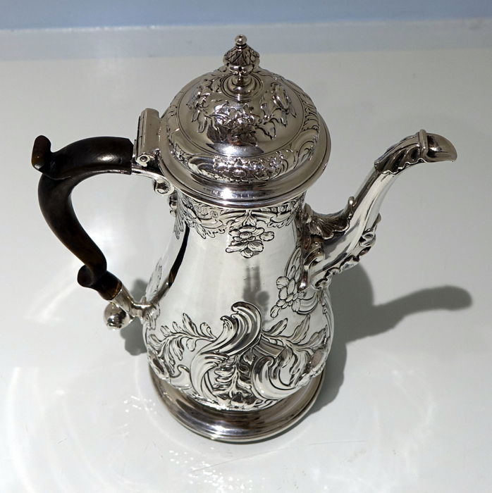 An elegant George II “rococo” coffee pot with elegant floral embossing and fruitwood scroll handle. Â The lid is hinged and has additional floral embossing for highlights.