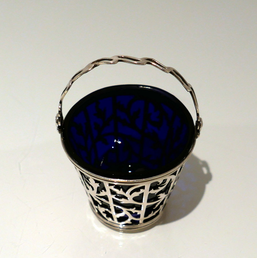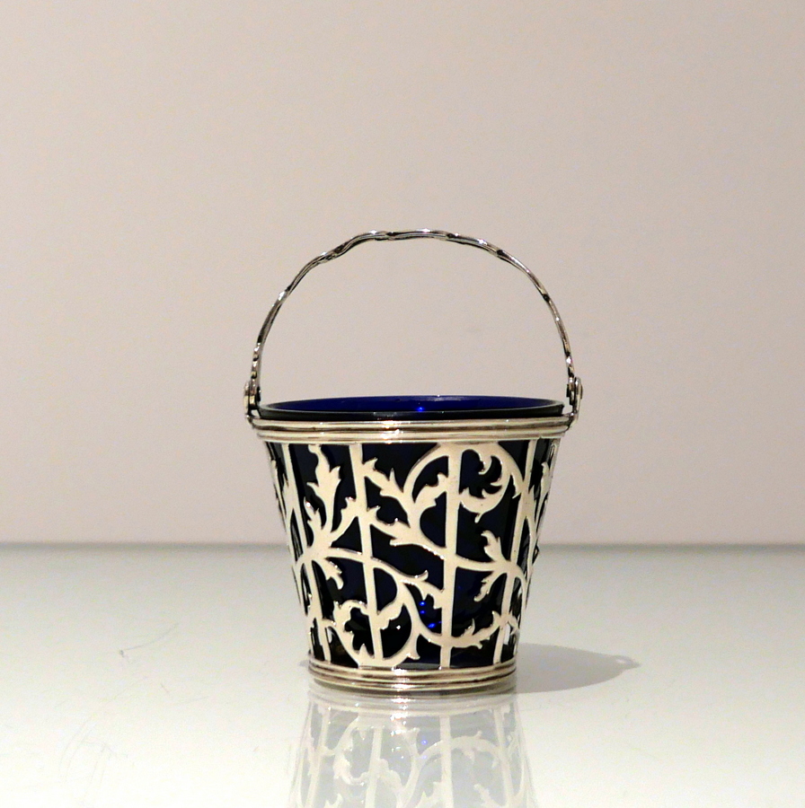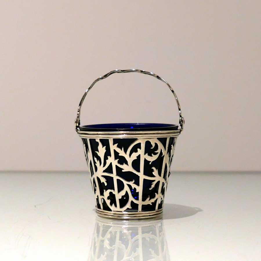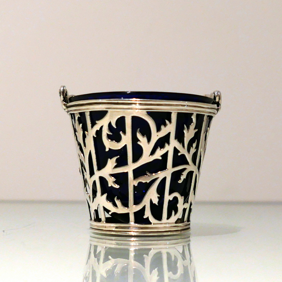 A fine and extremely sweet George II silver cream pail decorated with elegant foliage hand pierced designs. Â The hinged swing handle has additional hand piercing and the central blue liner is detachable.