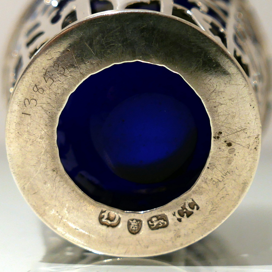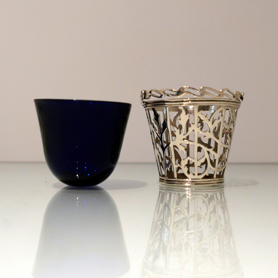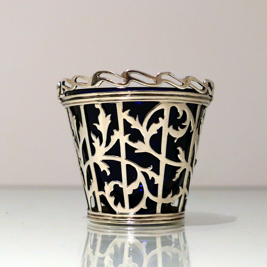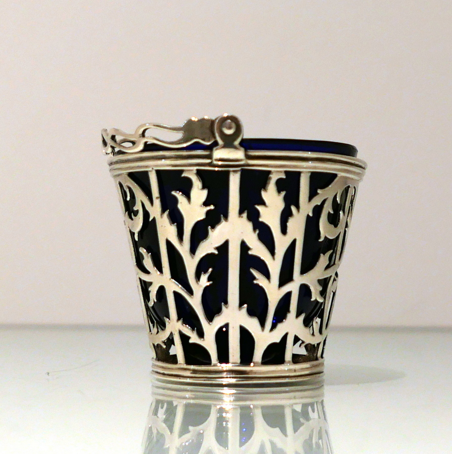 A fine and extremely sweet George II silver cream pail decorated with elegant foliage hand pierced designs. Â The hinged swing handle has additional hand piercing and the central blue liner is detachable.