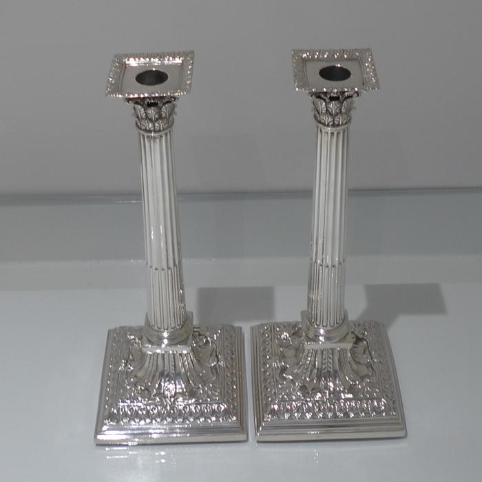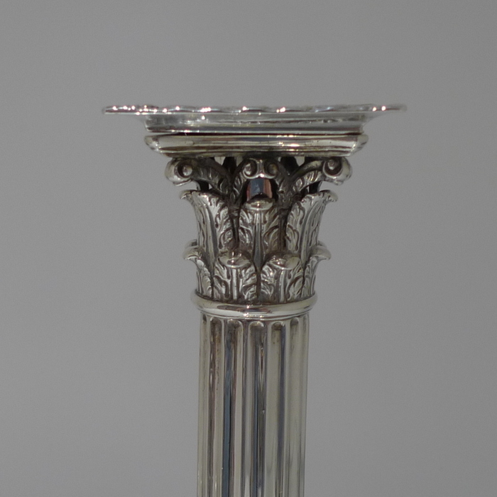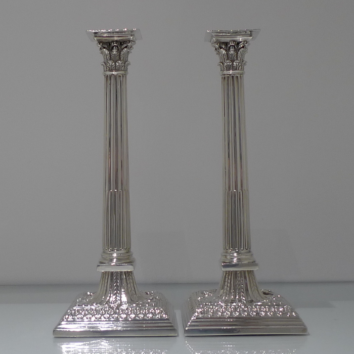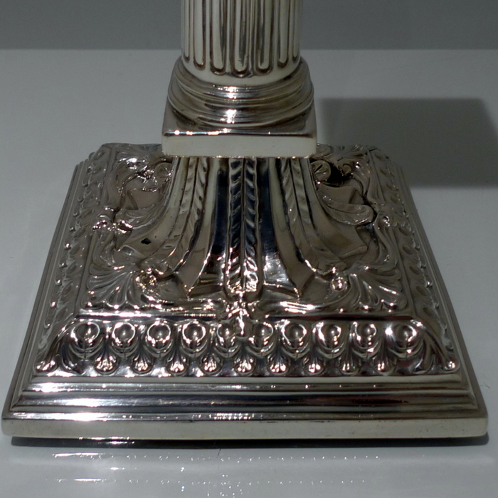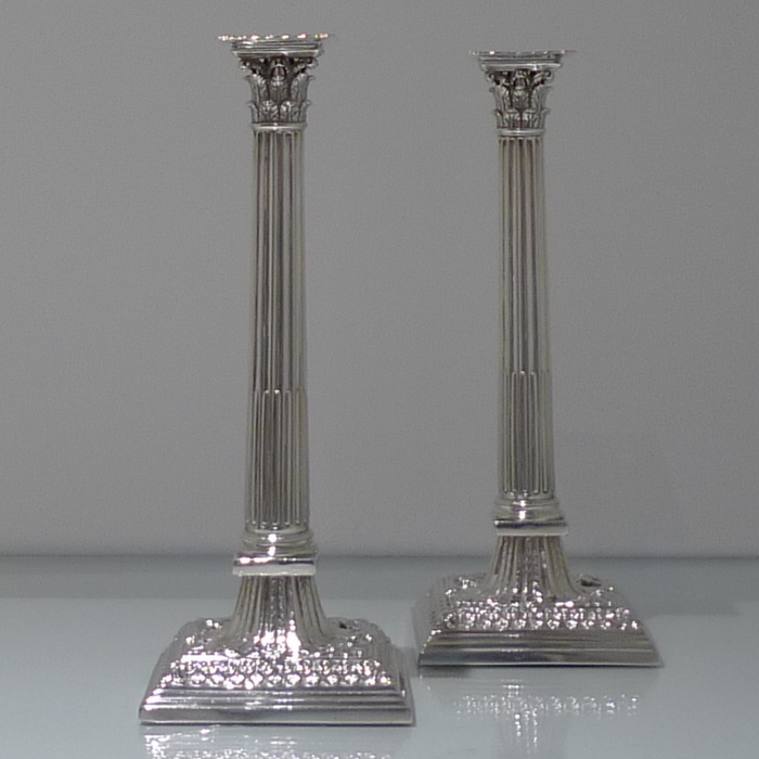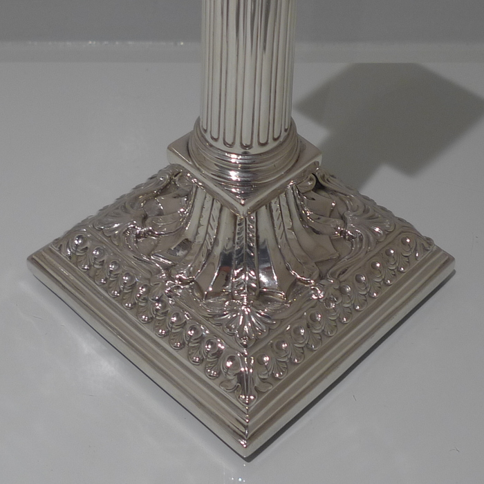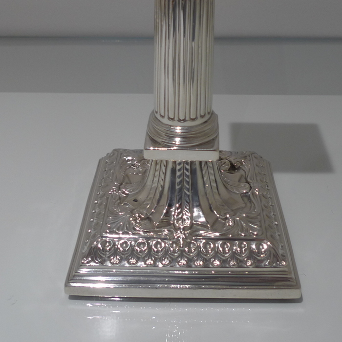 A stunning pair of mid 18th century candlesticks with elegantly fluted columns and corinthian capitals.  The bases are square with  exceptional ornate embossing for lowlights and the sconces are detachable.