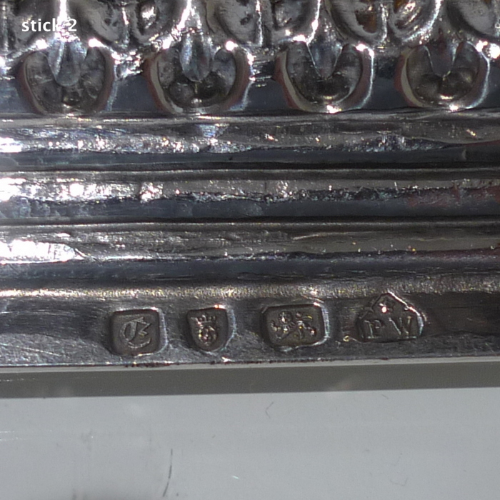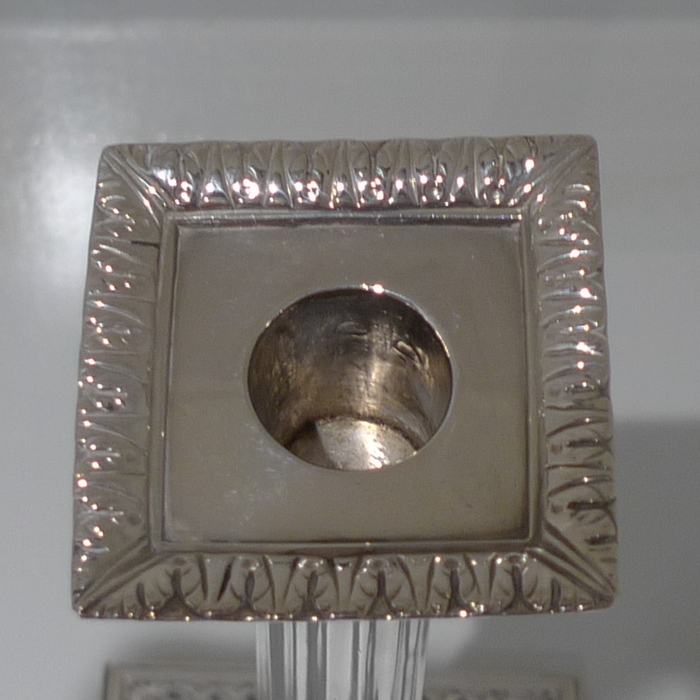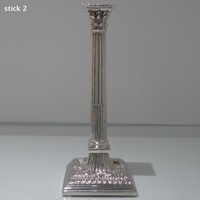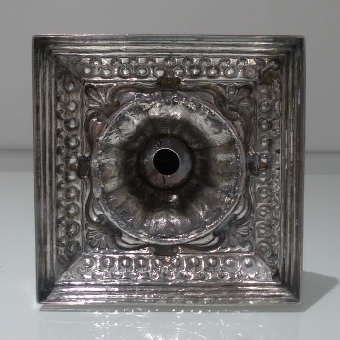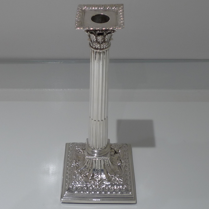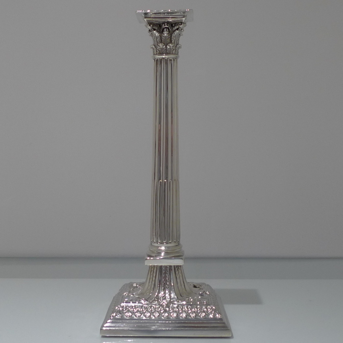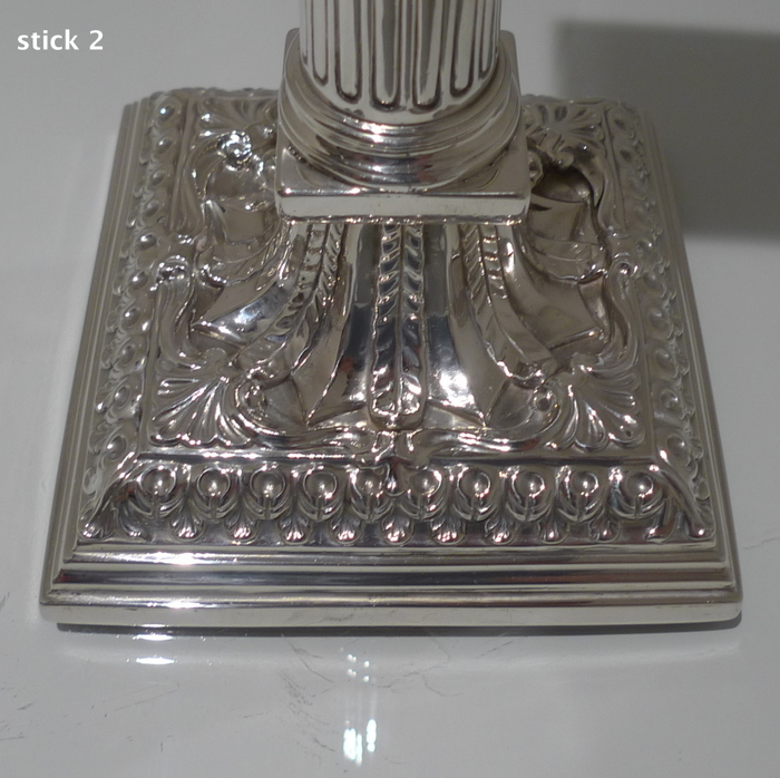 A stunning pair of mid 18th century candlesticks with elegantly fluted columns and corinthian capitals.  The bases are square with  exceptional ornate embossing for lowlights and the sconces are detachable.