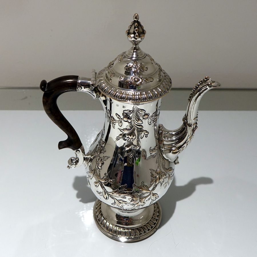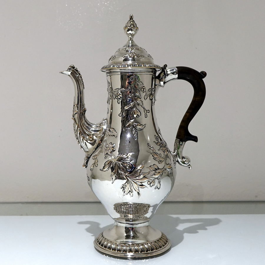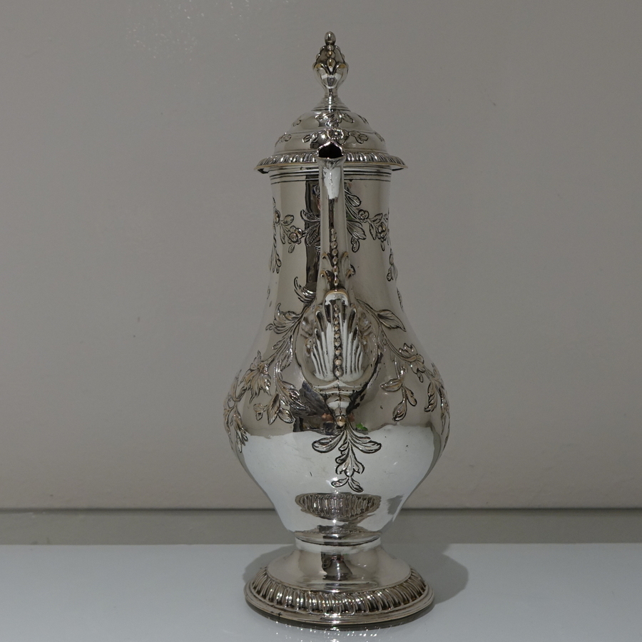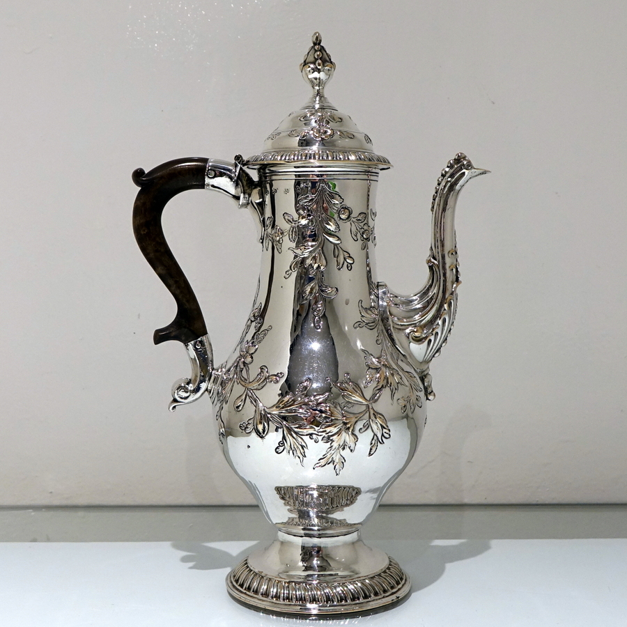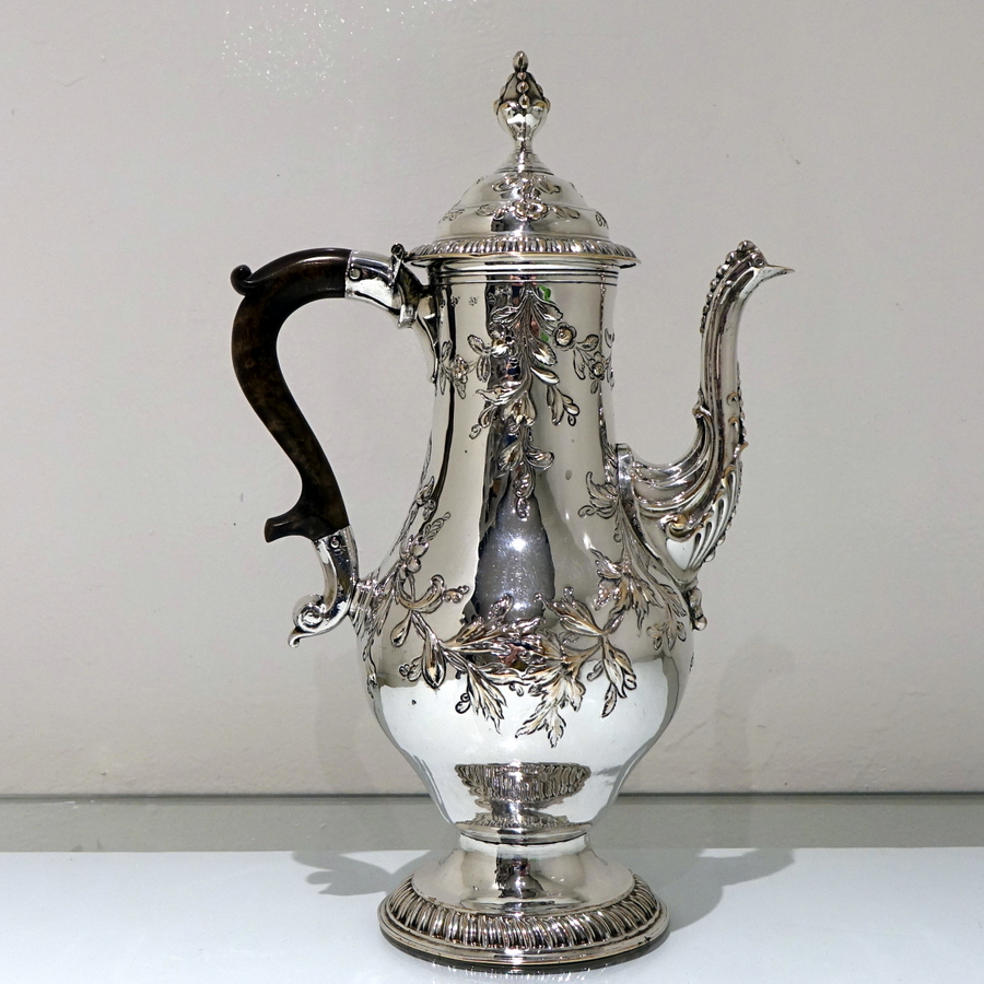 An early rococo design mid 18th century old Sheffield pear shaped coffee pot decorated with splendid foliate embossing entwining the body. Â The pedestal foot has a gadroon outer border for decorative lowlights.