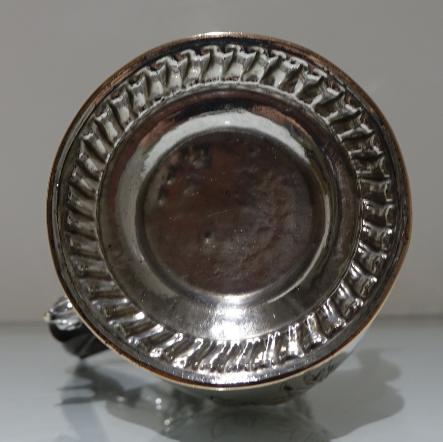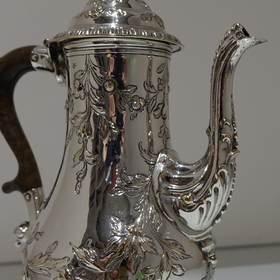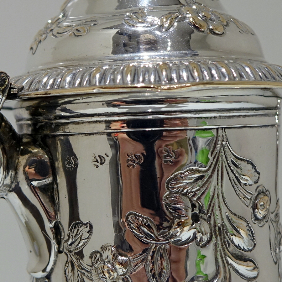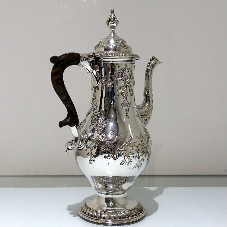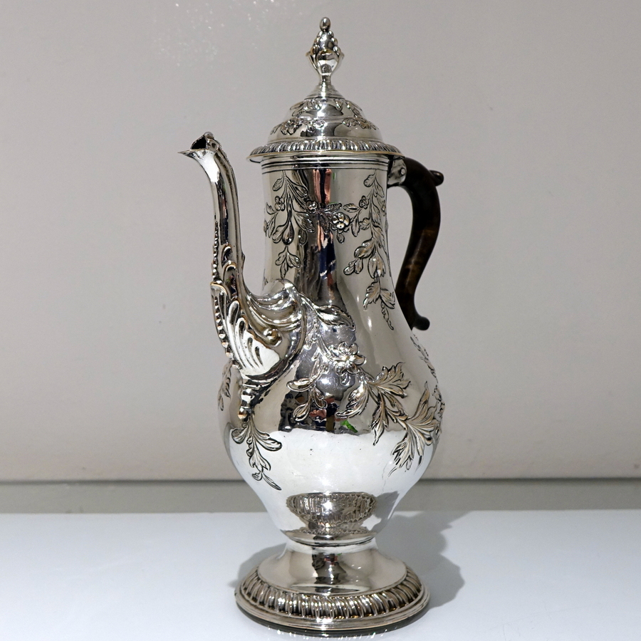 An early rococo design mid 18th century old Sheffield pear shaped coffee pot decorated with splendid foliate embossing entwining the body. Â The pedestal foot has a gadroon outer border for decorative lowlights.