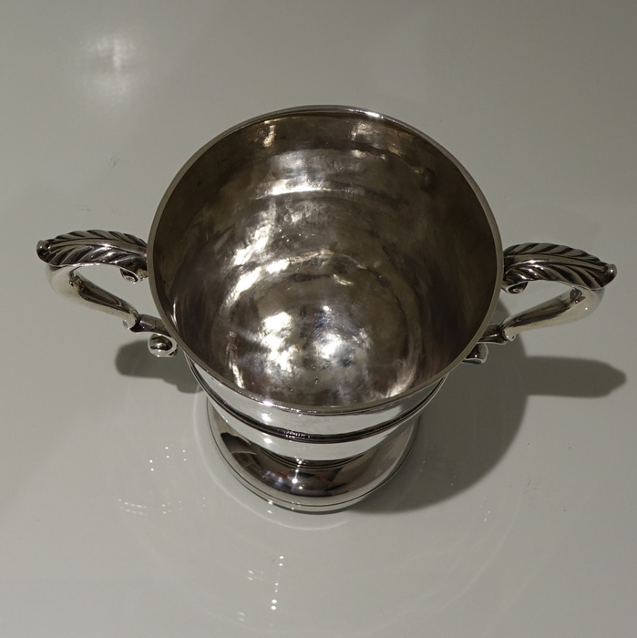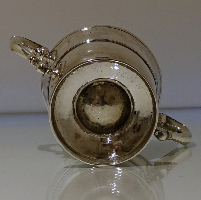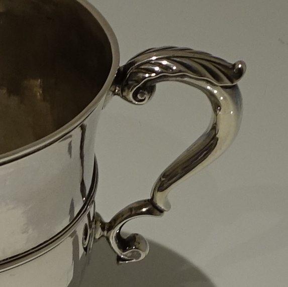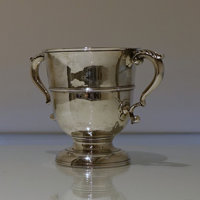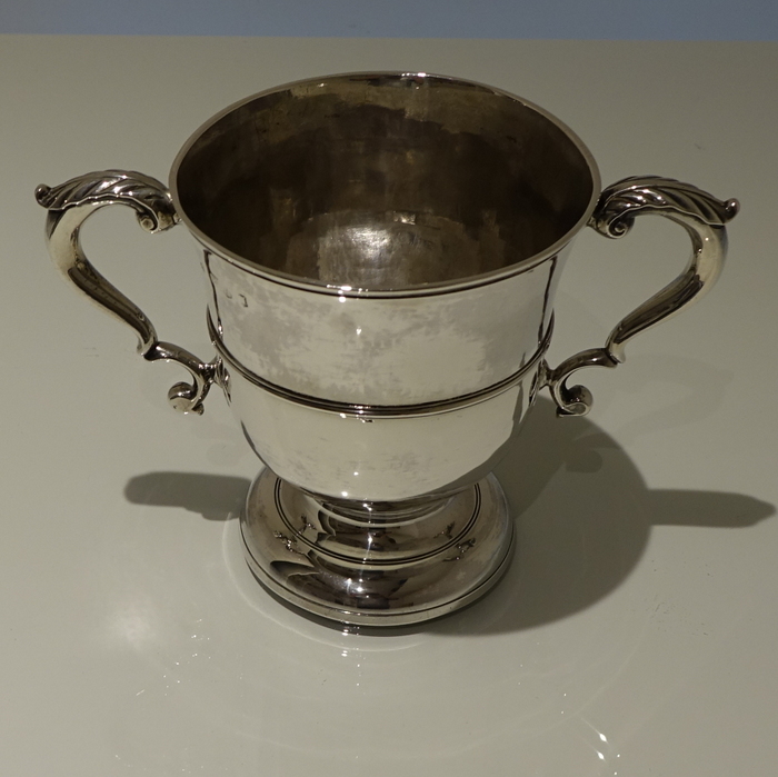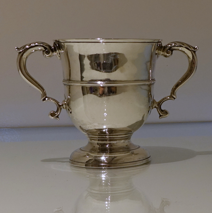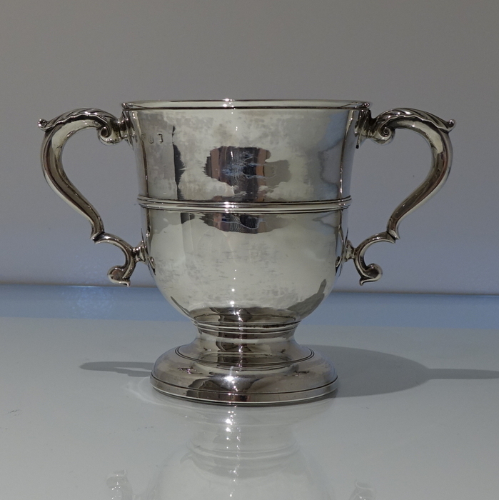 An elegant mid 18th century circular plain formed cup with a central girdle on the body for decoration. Â The handles are double scroll and are crowned with stylish acanthus leaf thumb pieces.