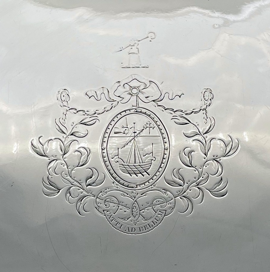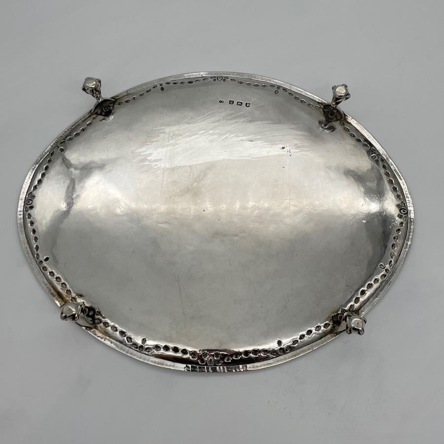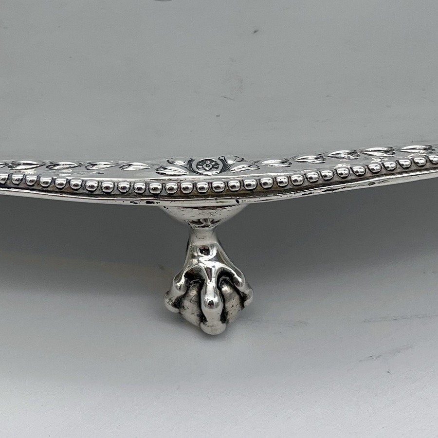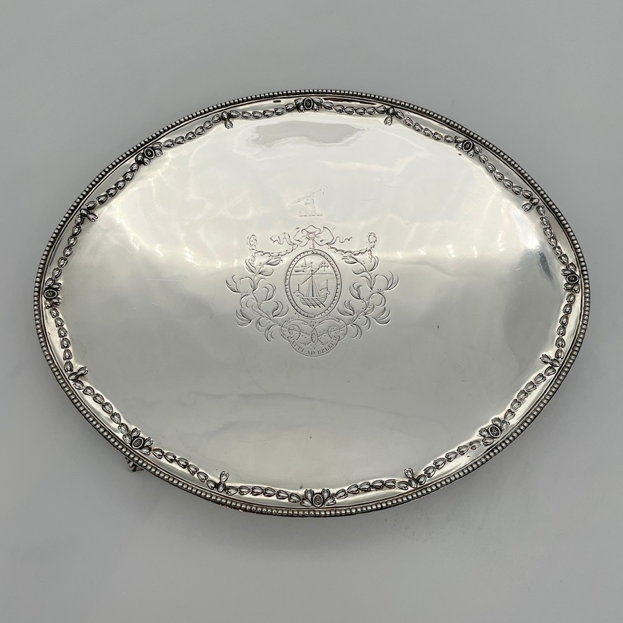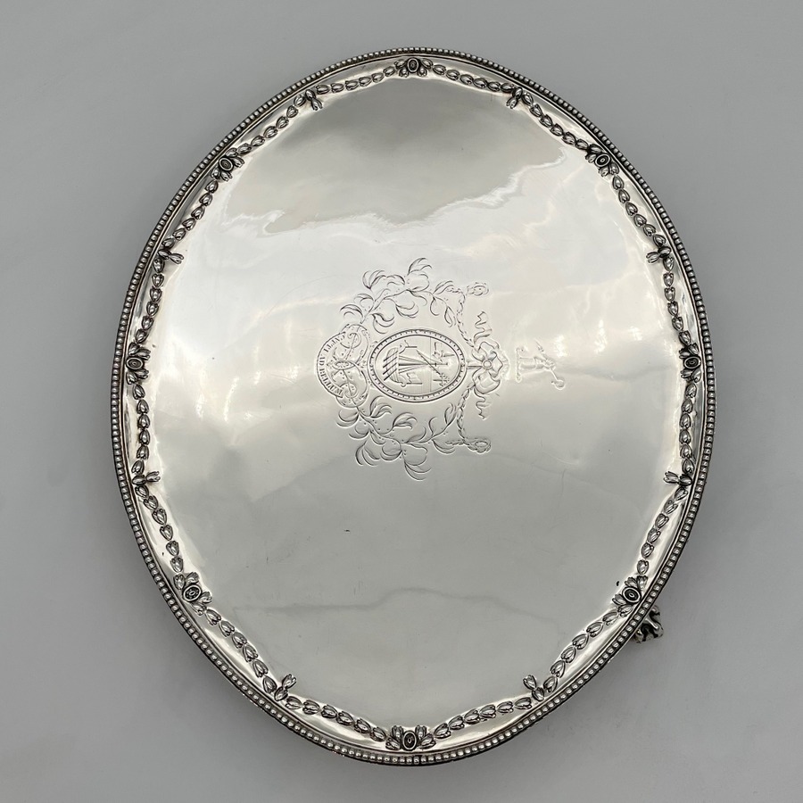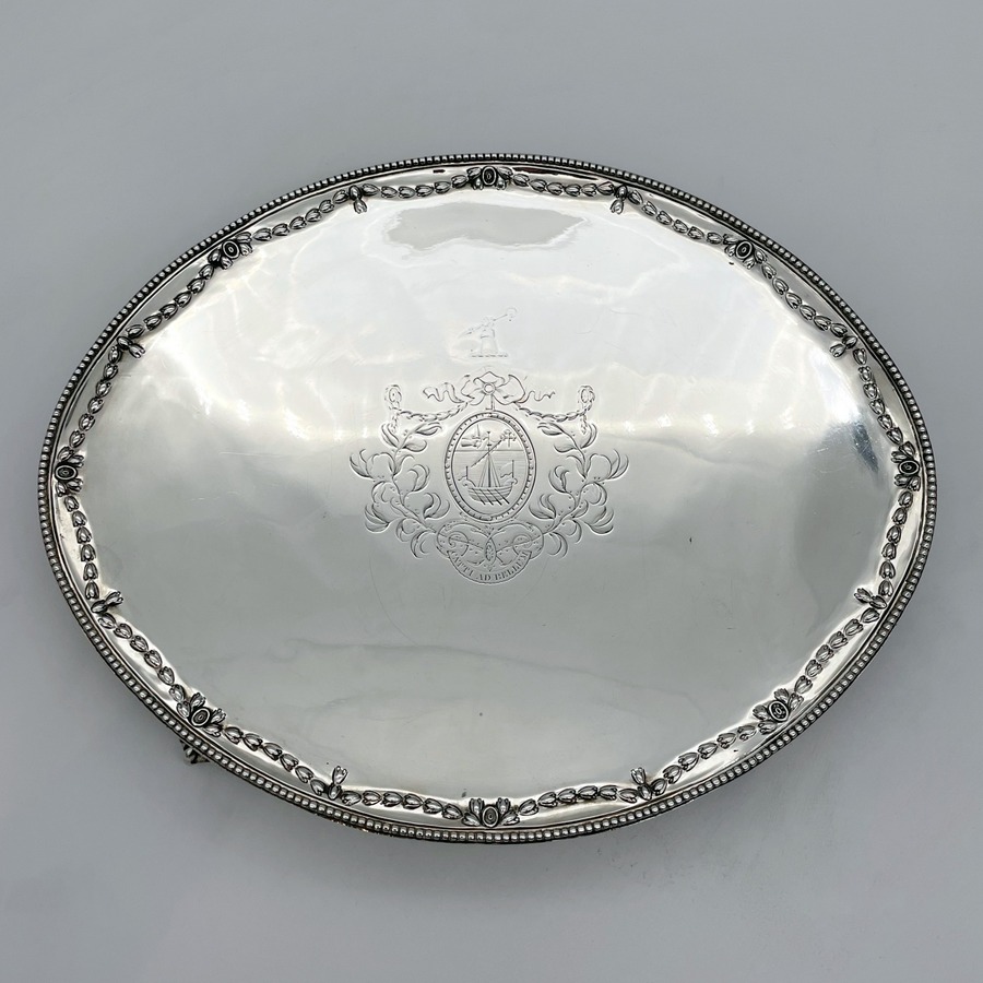 A fine large oval Georgian silver salver decorated with a beautiful applied bead border and a stunning hand chased inner floral hanging garland gallery. The salver sits on four elegant ball and claw feet and the impressive central hand engraved contemporary armorial is of those of Macpherson of Cluny.