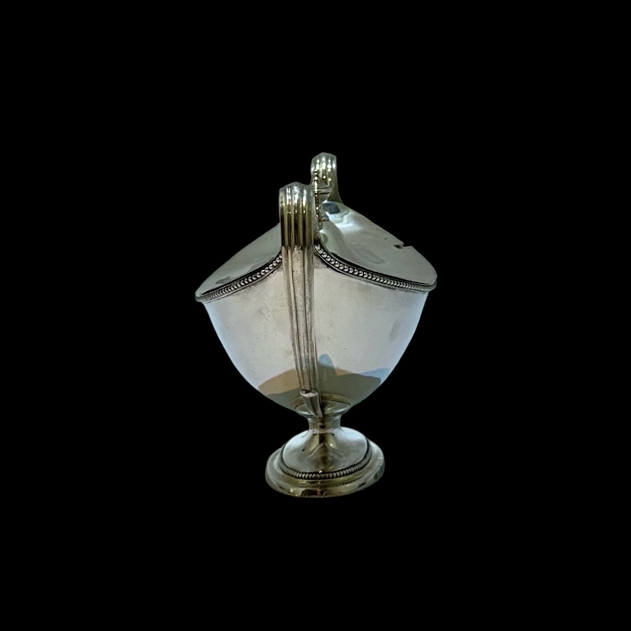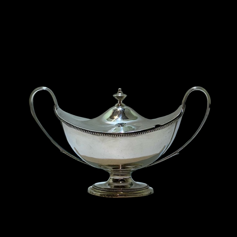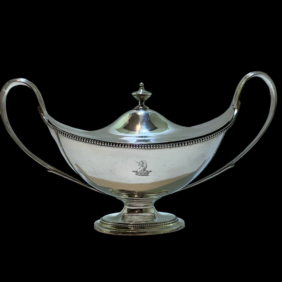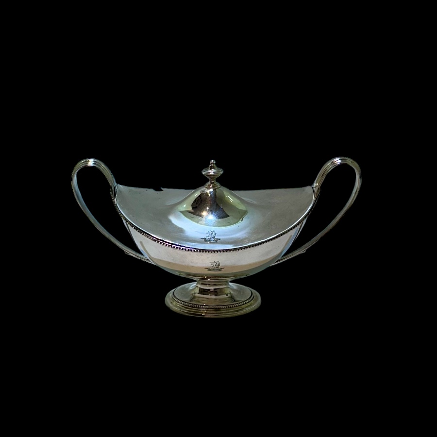 A stylish and extremely desirable pair of 18th century “boat” shaped sauce tureens with detachable lids.  The body is elegantly plain formed and  has an upper applied bead wire for highlights.  The foot is oval pedestal in design and has an additional applied bead wire for lowlights.  Both lids and bodies have stylish orginial crests for importance.