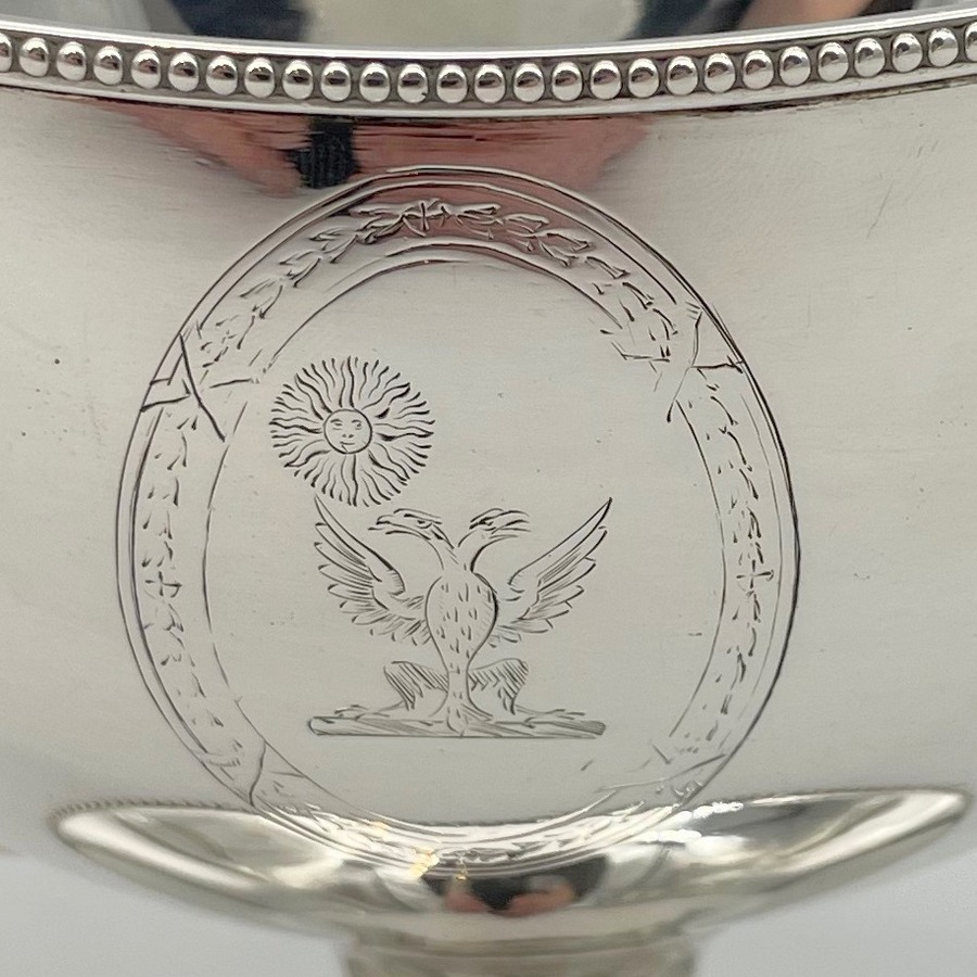 Wonderful set of four Georgian silver boat shaped sauce tureens designed with elegant loop handles and decorated with applied bead wire highlights.  There are two stylish contemporary hand engraved crests for importance.