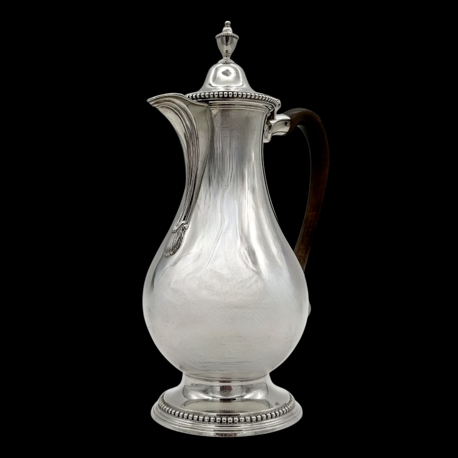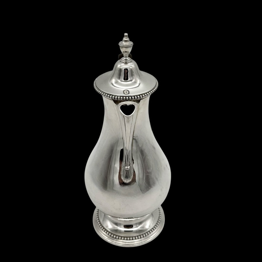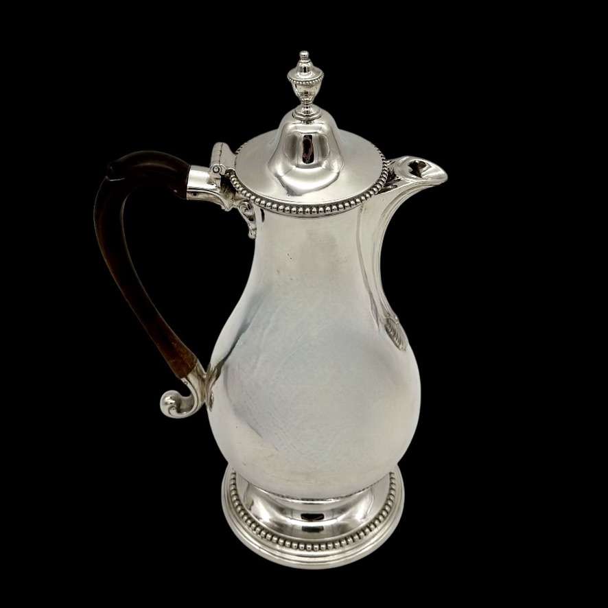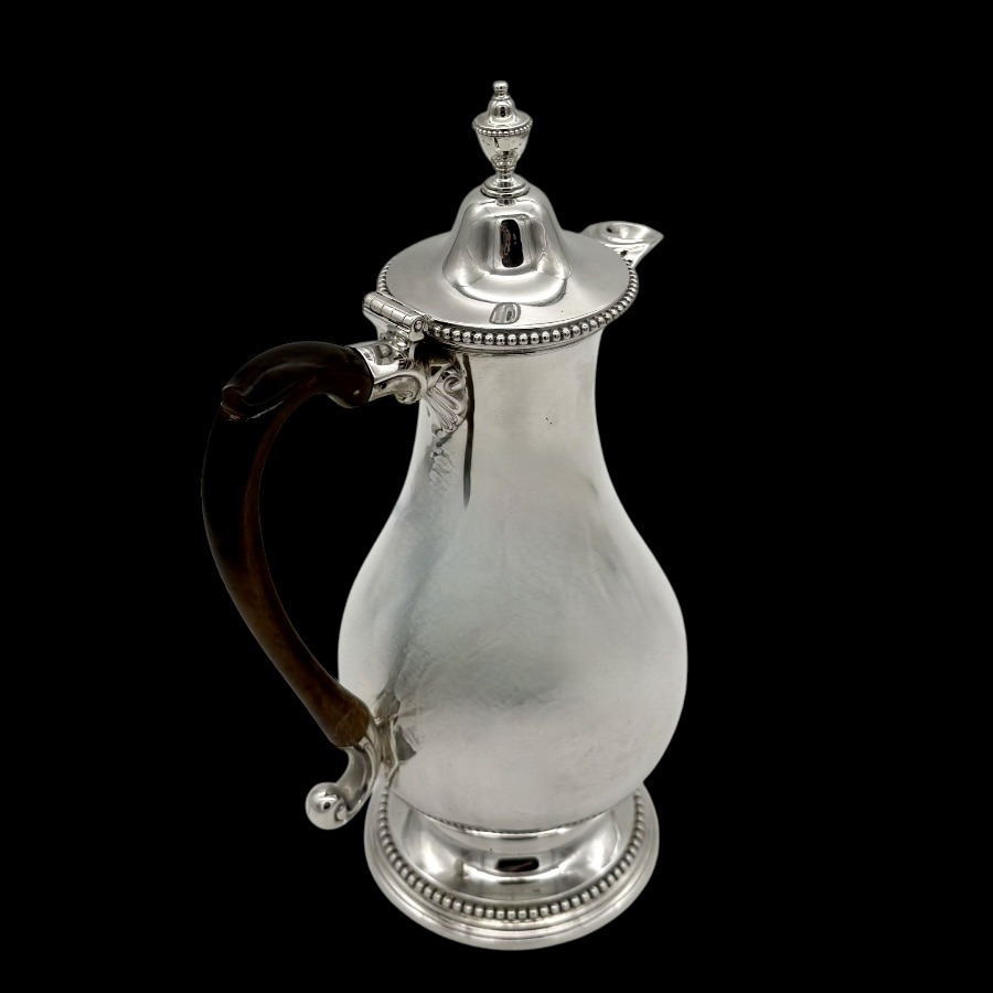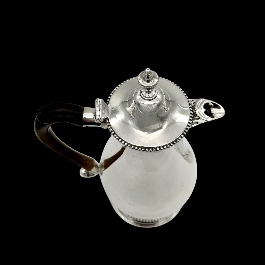 Very sweet Georgian era silver coffee jug designed with an elegant plain formed baluster body and a beautiful formed scroll shaped fruitwood handle. There is eye catching applied bead wire highlights for the visual wow factor.
