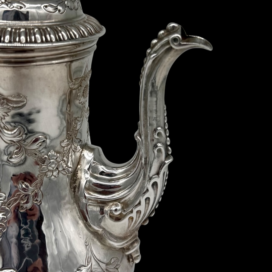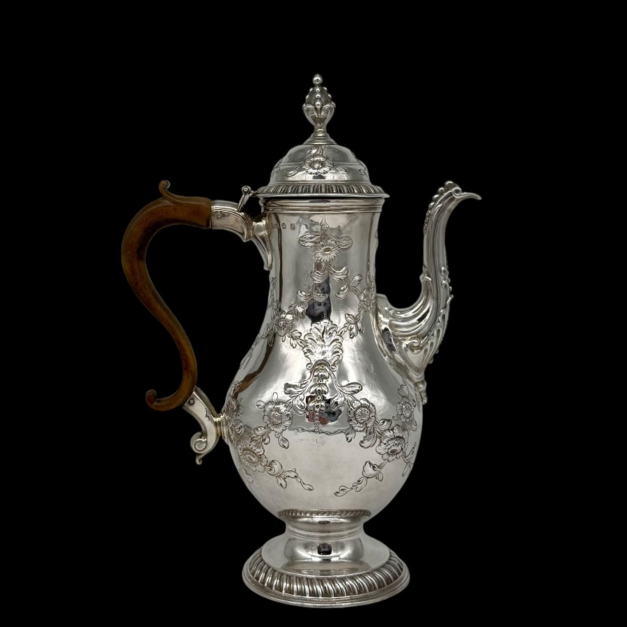 Most fabulous silver Sheffield made Georgian coffee pot created in the exact same design as its Old Sheffield cousins. Beautiful gadroon wire border highlights and pristine floral garlands draping the baluster body.