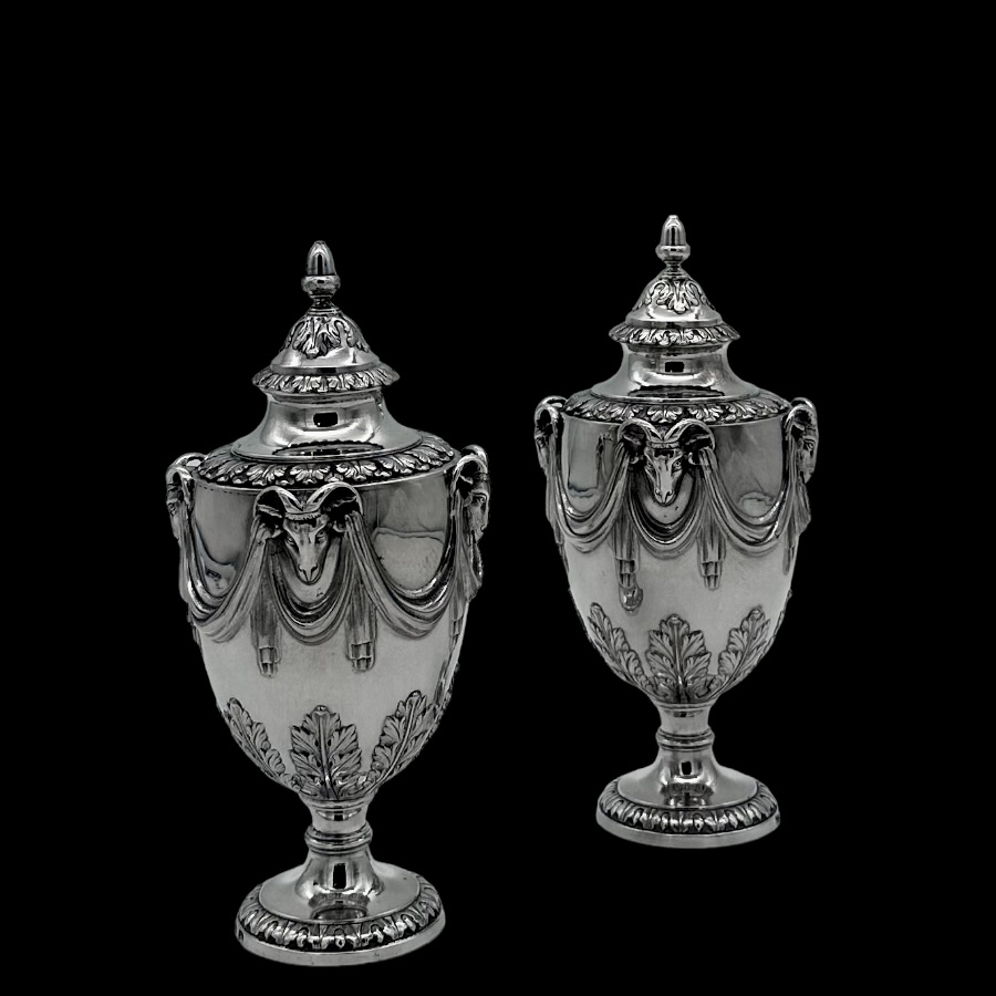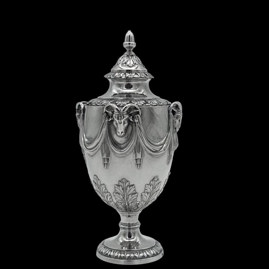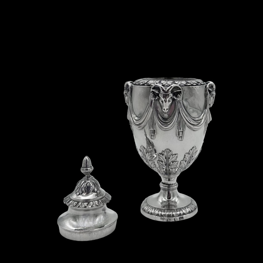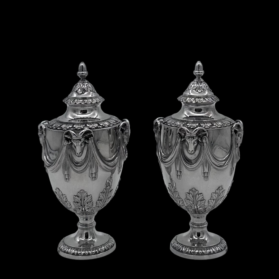 Fine pair of 18th century urn shaped sugar vases decorated with elegant draping ribbons and impressive rams heads. The underside of the bowl has elegant acanthus leaf motifs for lowlights.