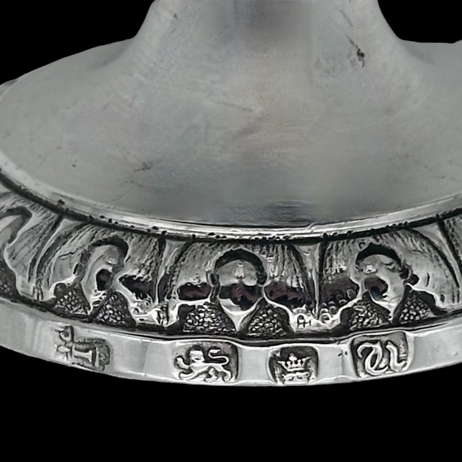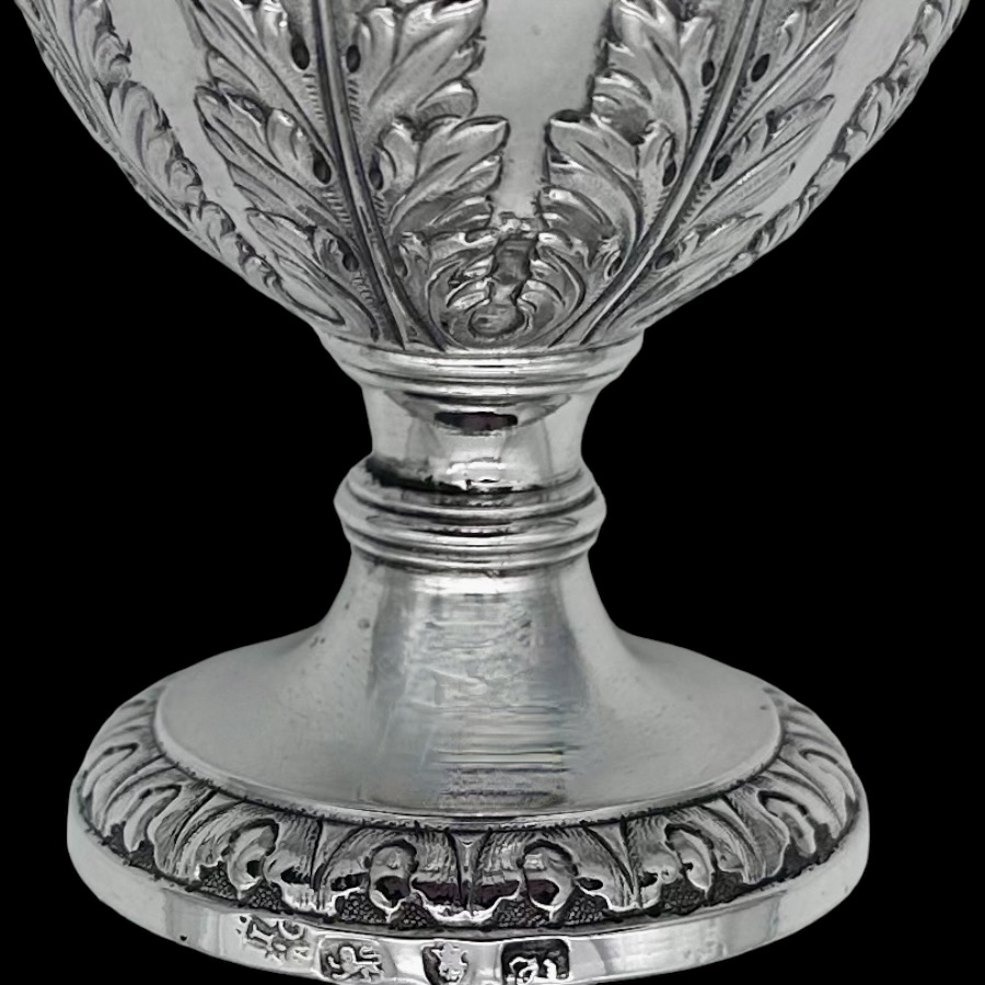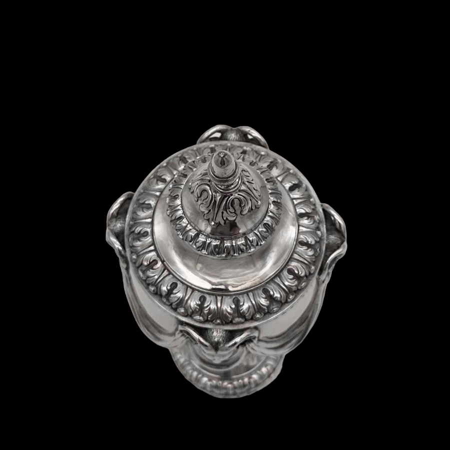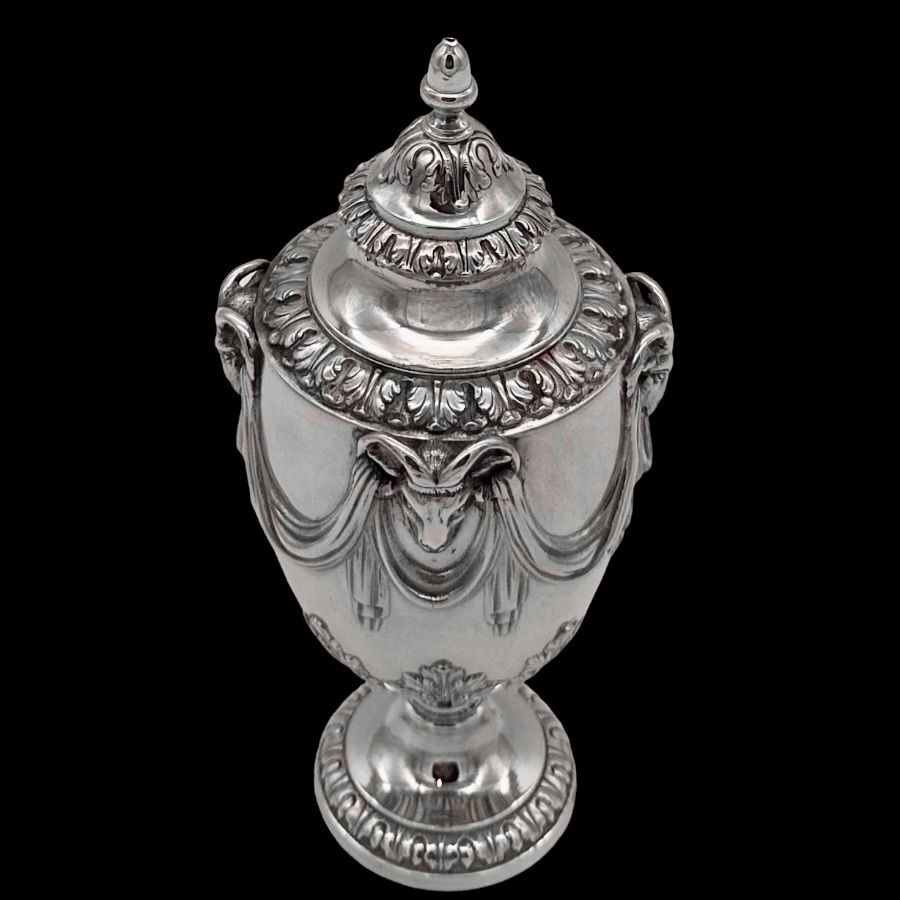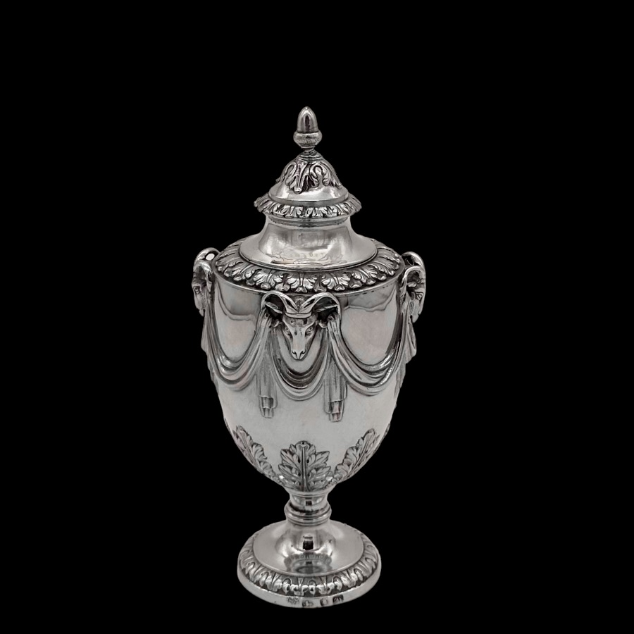 Fine pair of 18th century urn shaped sugar vases decorated with elegant draping ribbons and impressive rams heads. The underside of the bowl has elegant acanthus leaf motifs for lowlights.