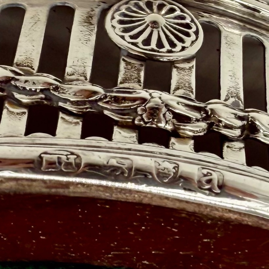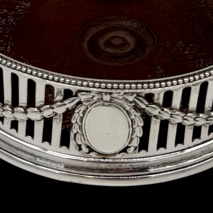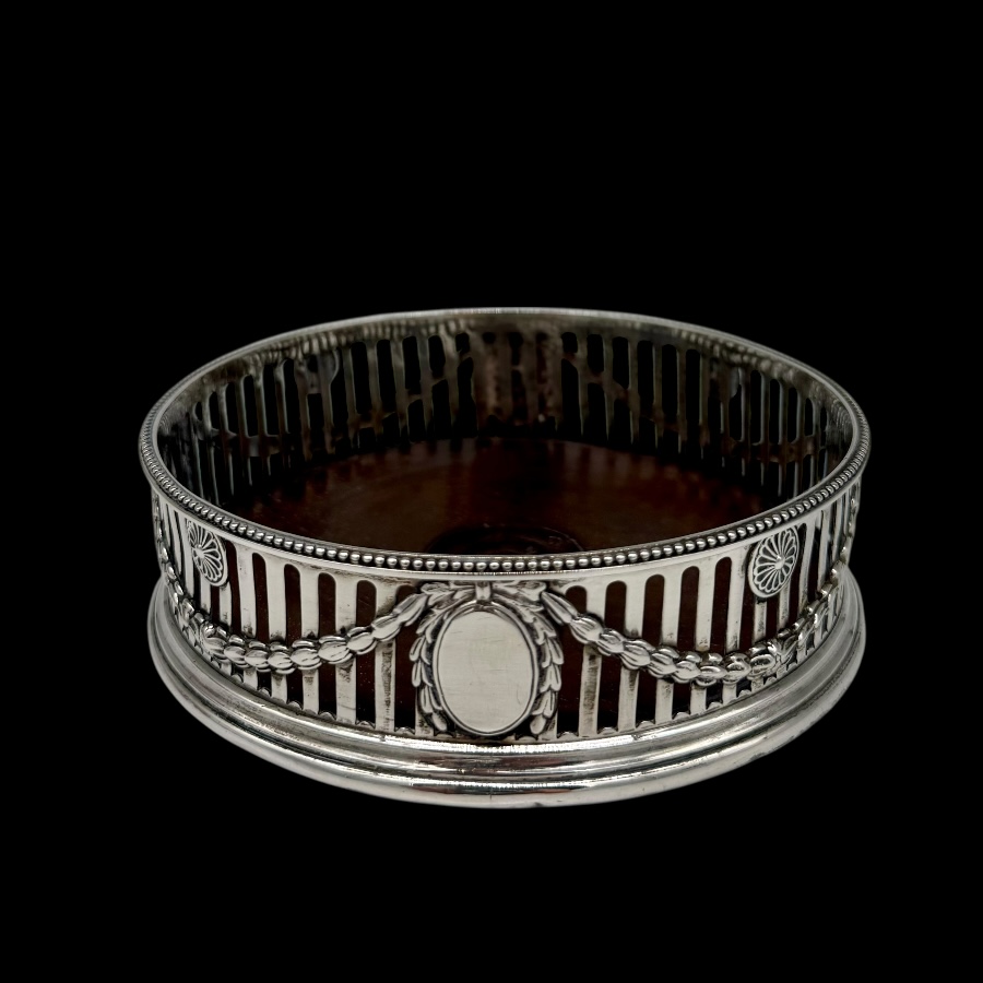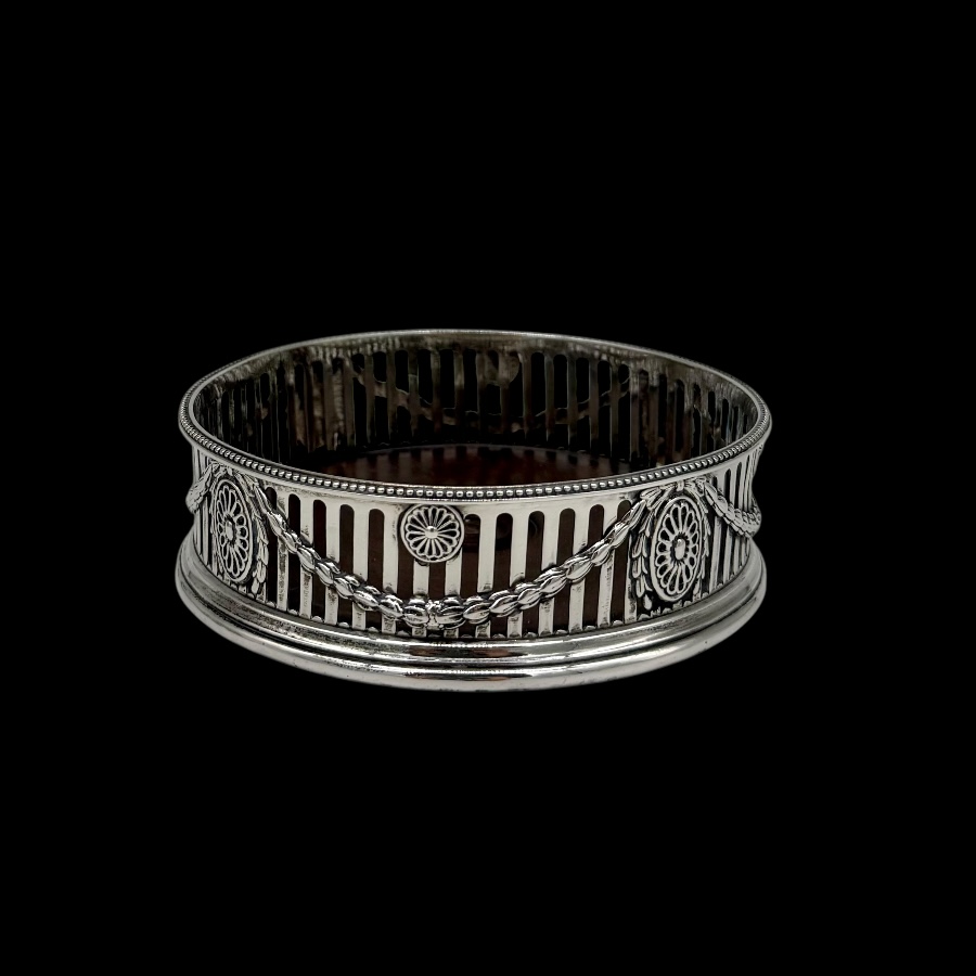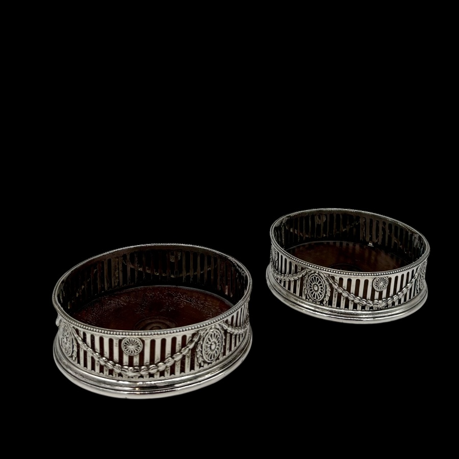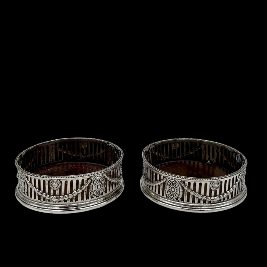 Truly fine pair of Georgian silver pierced coasters decorated with supremely stylish hanging garlands and detailed floral burst buttons. The boarder is the eye catching bead style and the central wreath framed cartouches are exquisite.