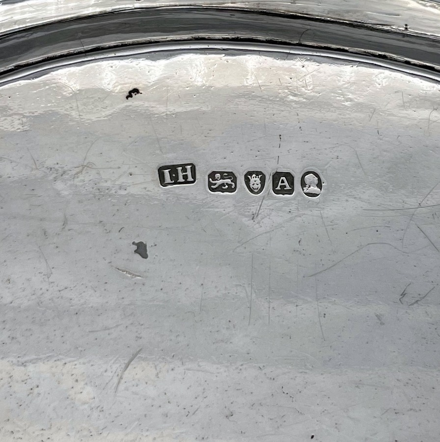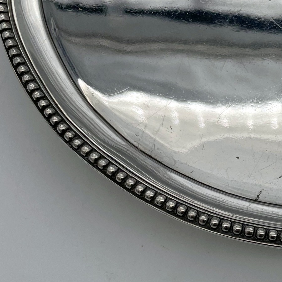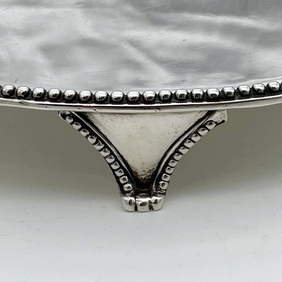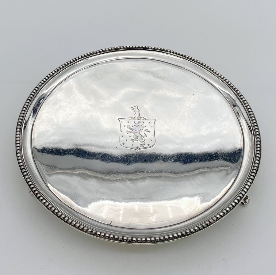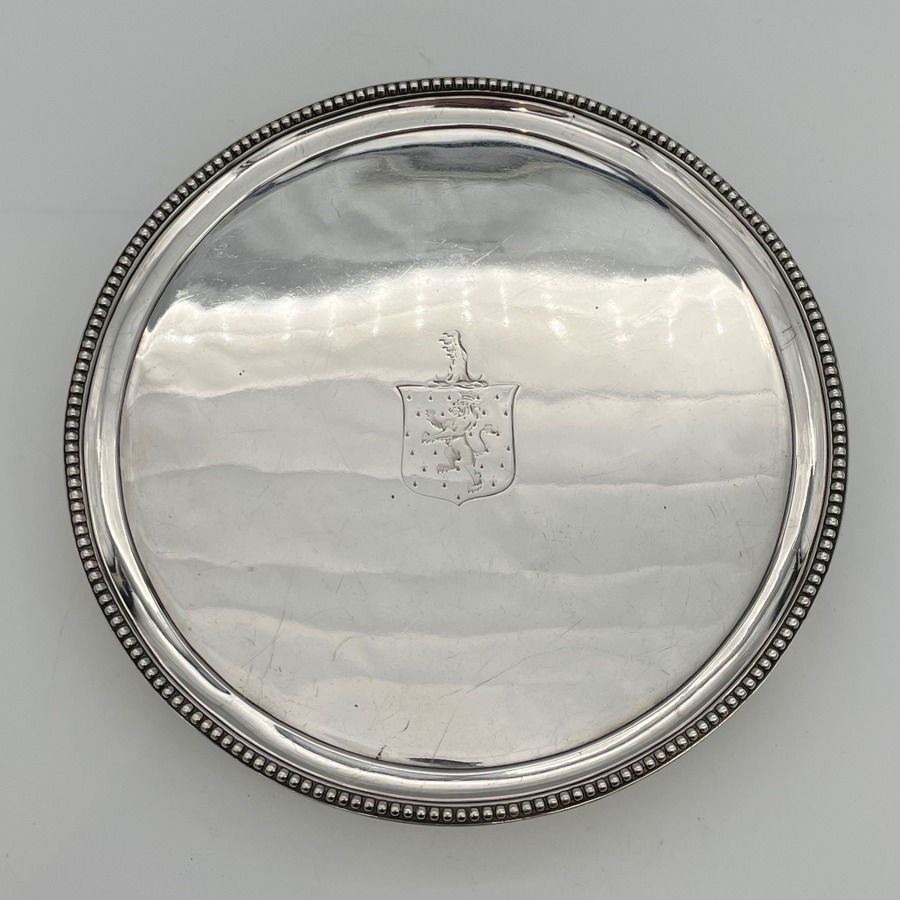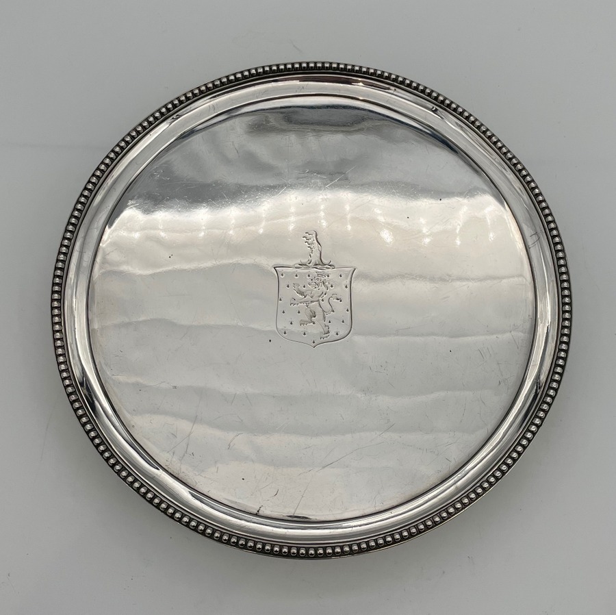 A delightful mid-sized Georgian silver circular salver decorated with a splendid bead border and three bead edged feet. Â The centre front has a wonderful contemporary hand engraved armorial for importance.