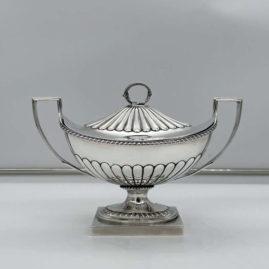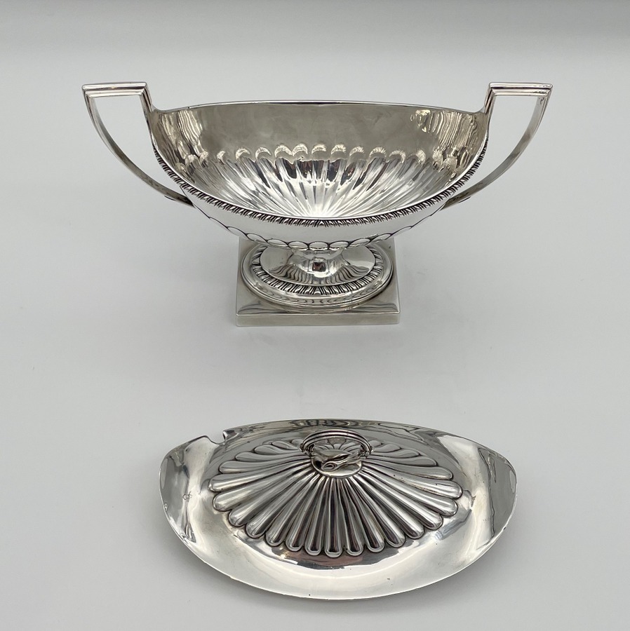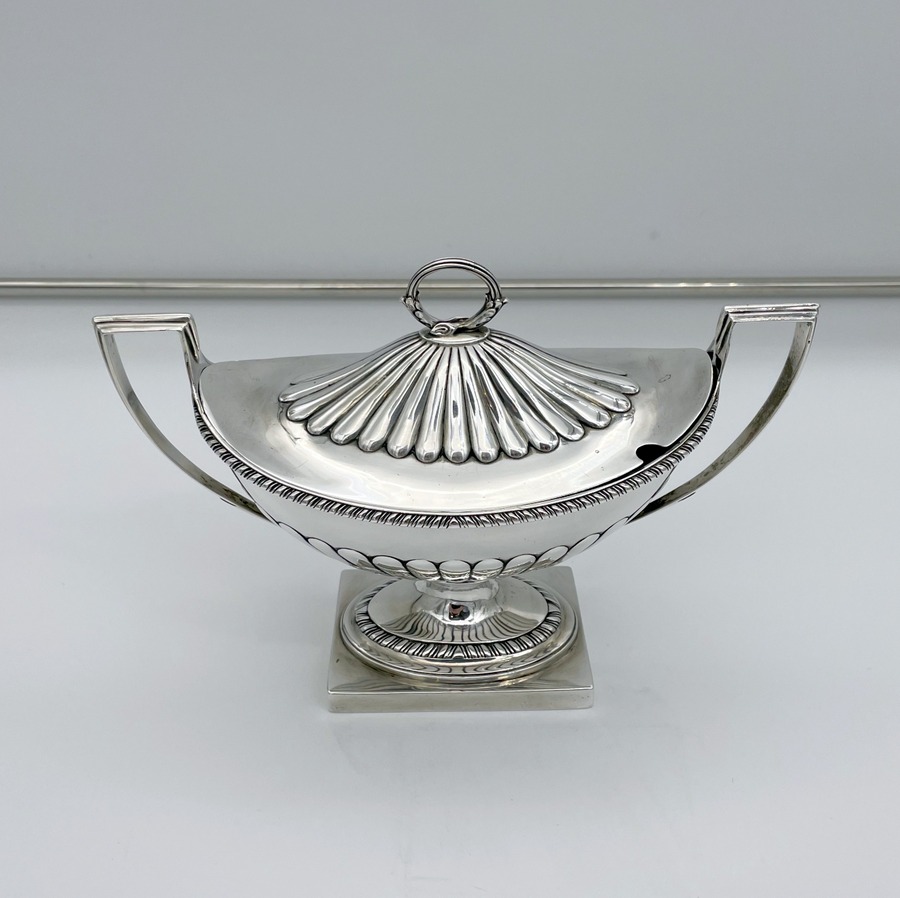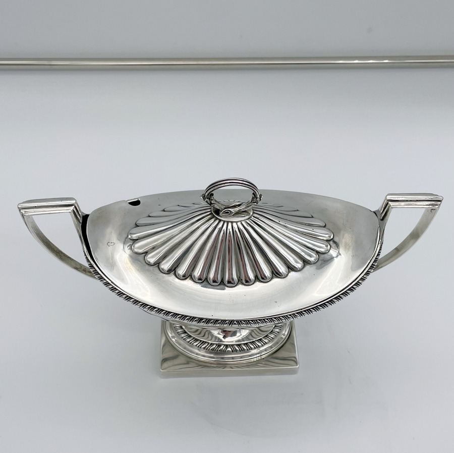 Beautiful Georgian silver half fluted boat shaped sauce tureen and cover sitting on a raised pedestal foot. The detachable lid has a decorative wreath shaped handle.