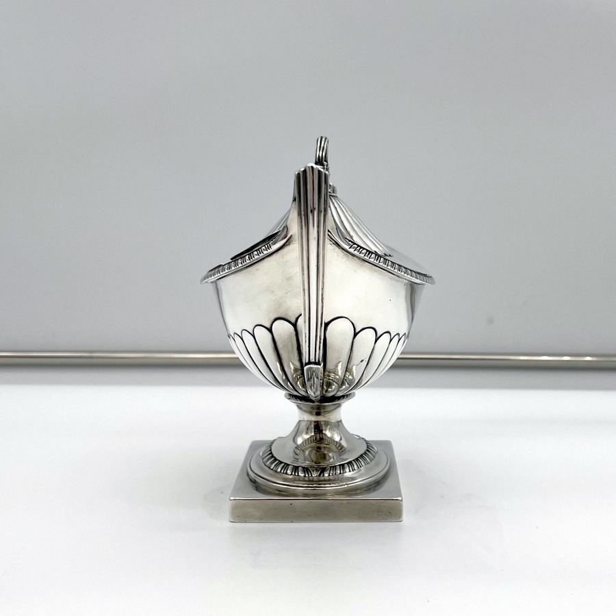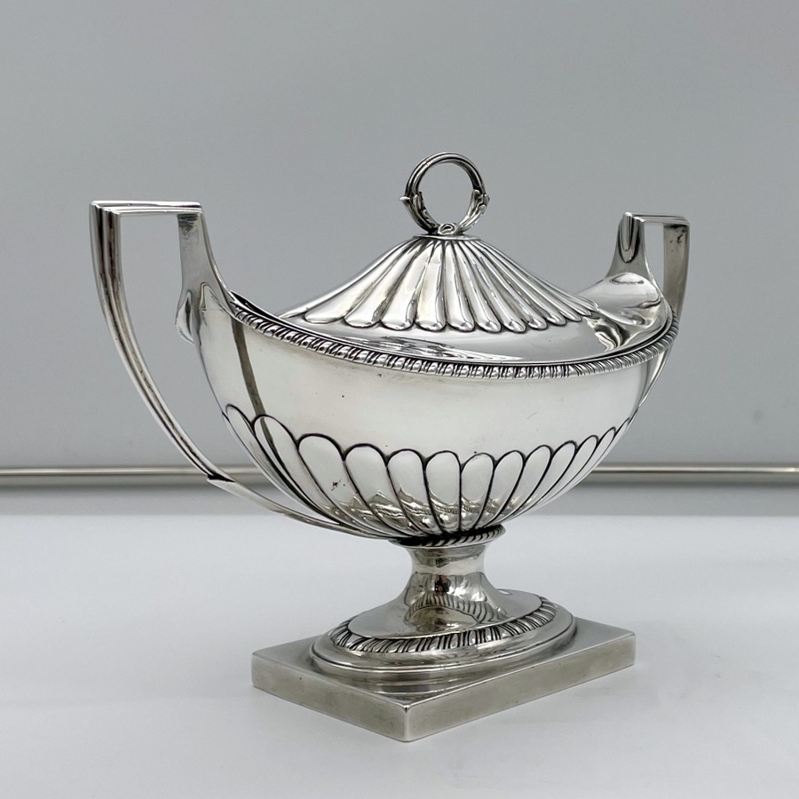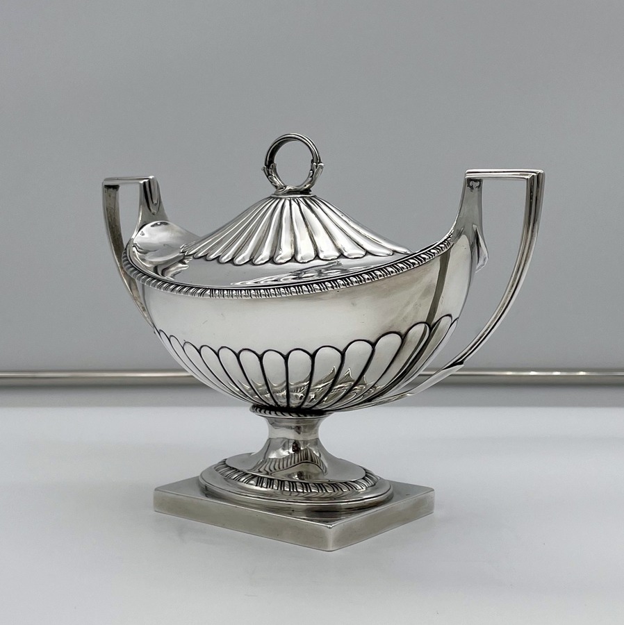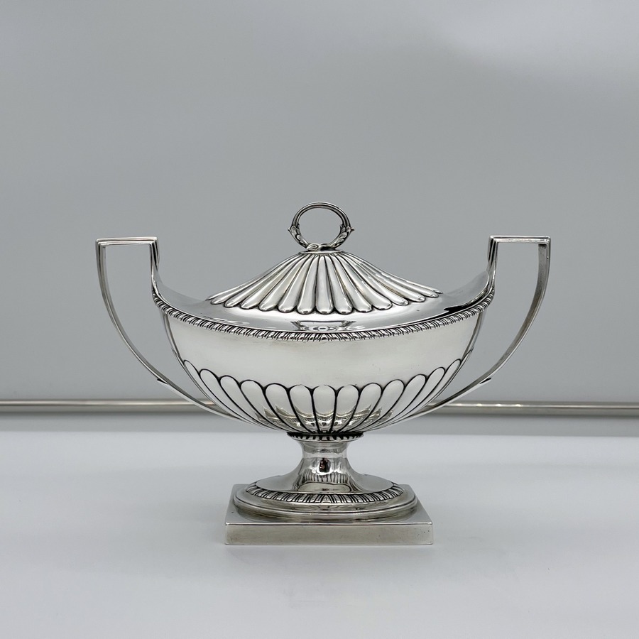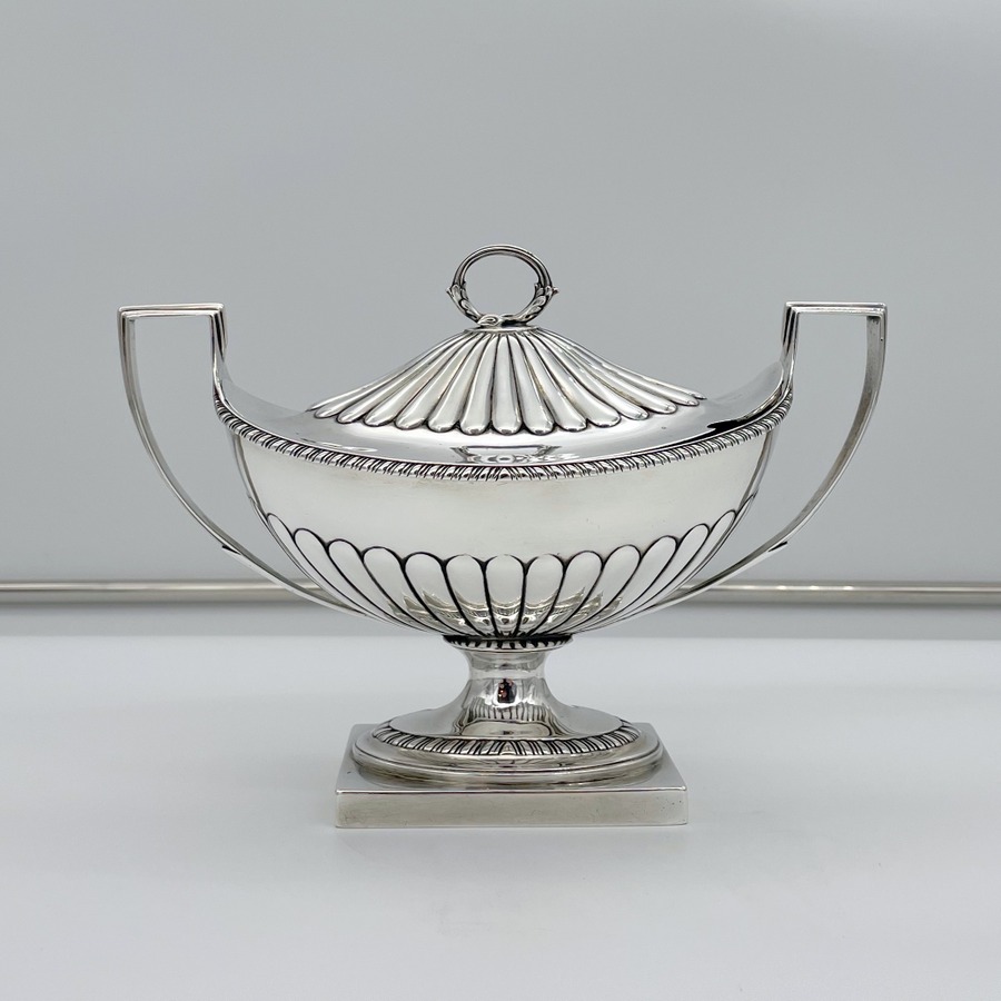 Beautiful Georgian silver half fluted boat shaped sauce tureen and cover sitting on a raised pedestal foot. The detachable lid has a decorative wreath shaped handle.