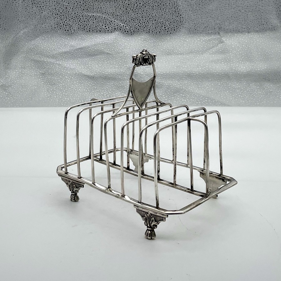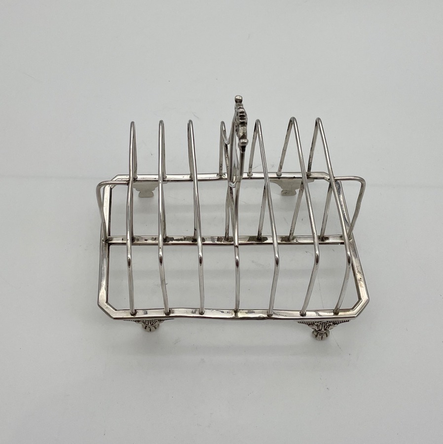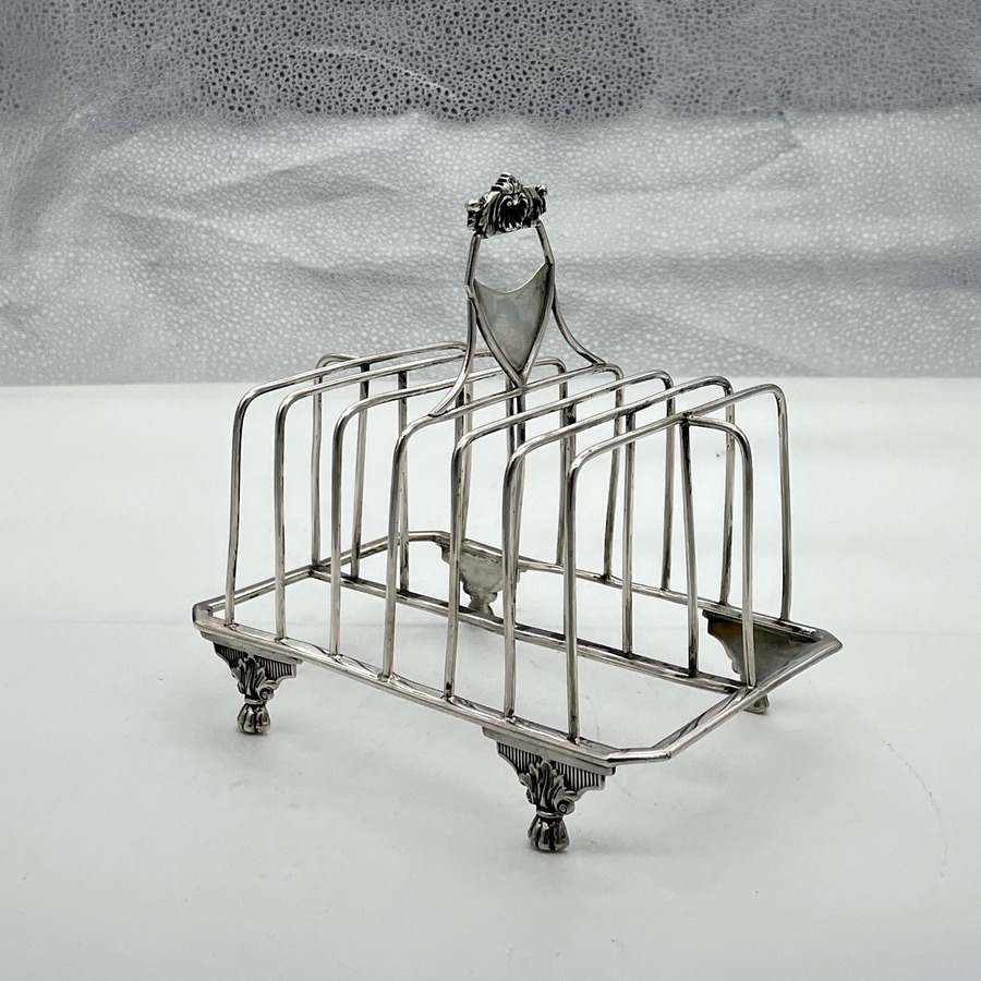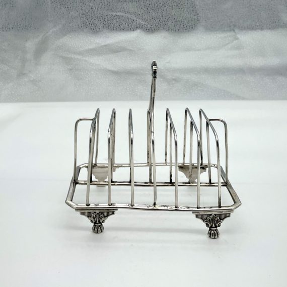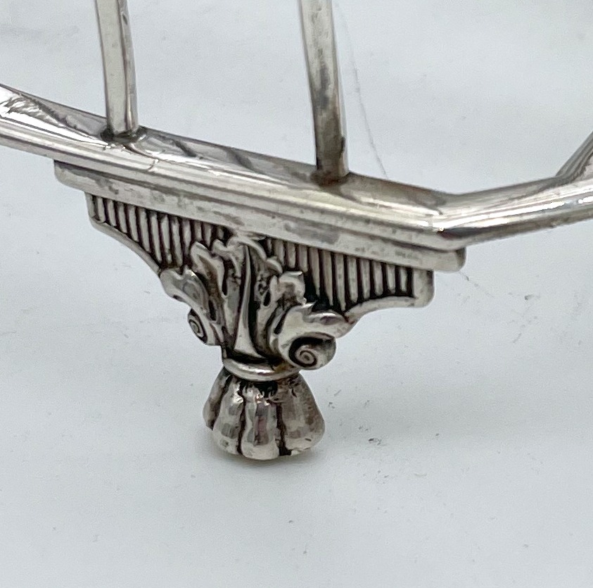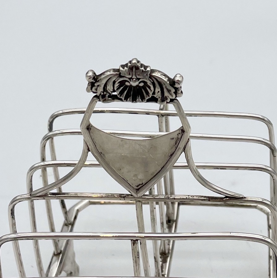 A sweet Georgian silver wire work rectangular cut cornered toast rack designed with a stunning floating shell capped shielded handle incorporating an elegant cartouche. Â There are four stylish floral claw feet for decorative lowlights.